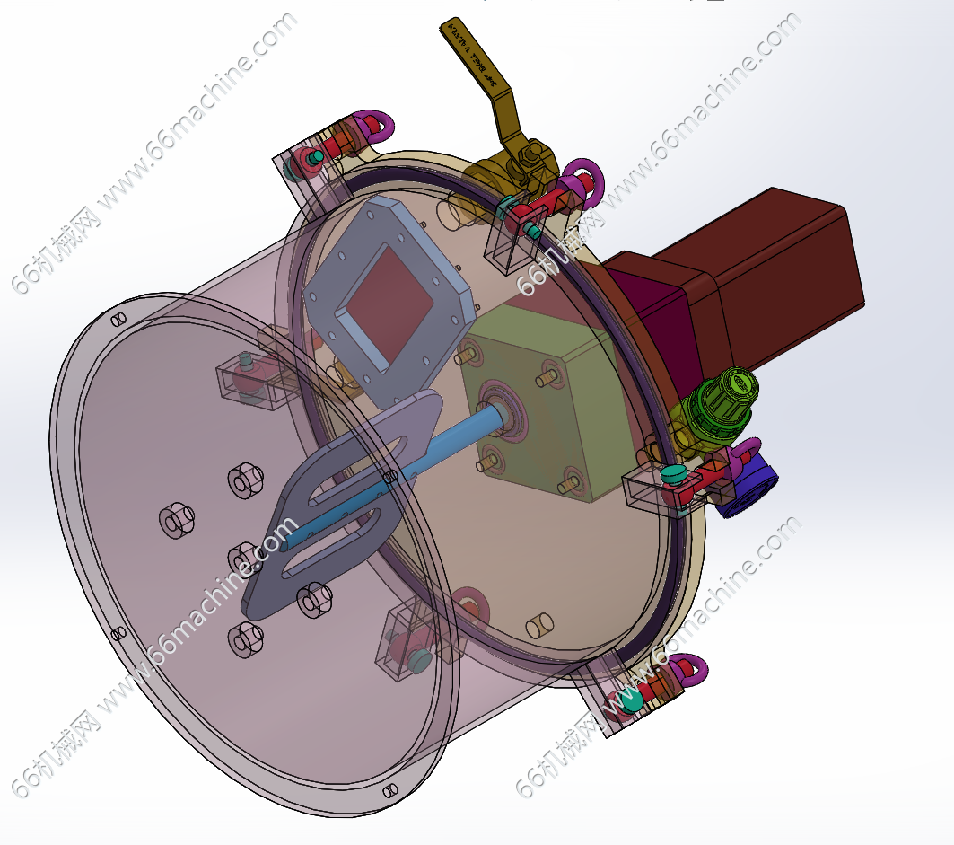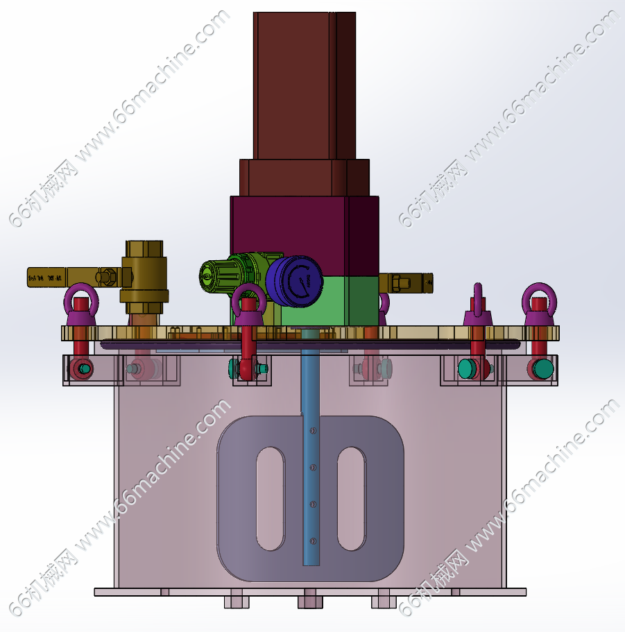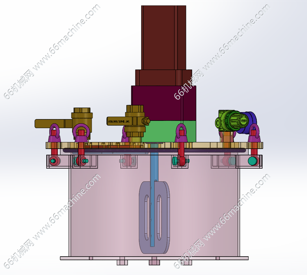 本模型为混合液体搅拌罐,采用伺服电机驱动搅拌轴进而带动叶片进行AB液体混合,通过球阀控制AB液体进料;旋转扭母进行封盖/开盖作业,广泛用于各种液体混合场景中。