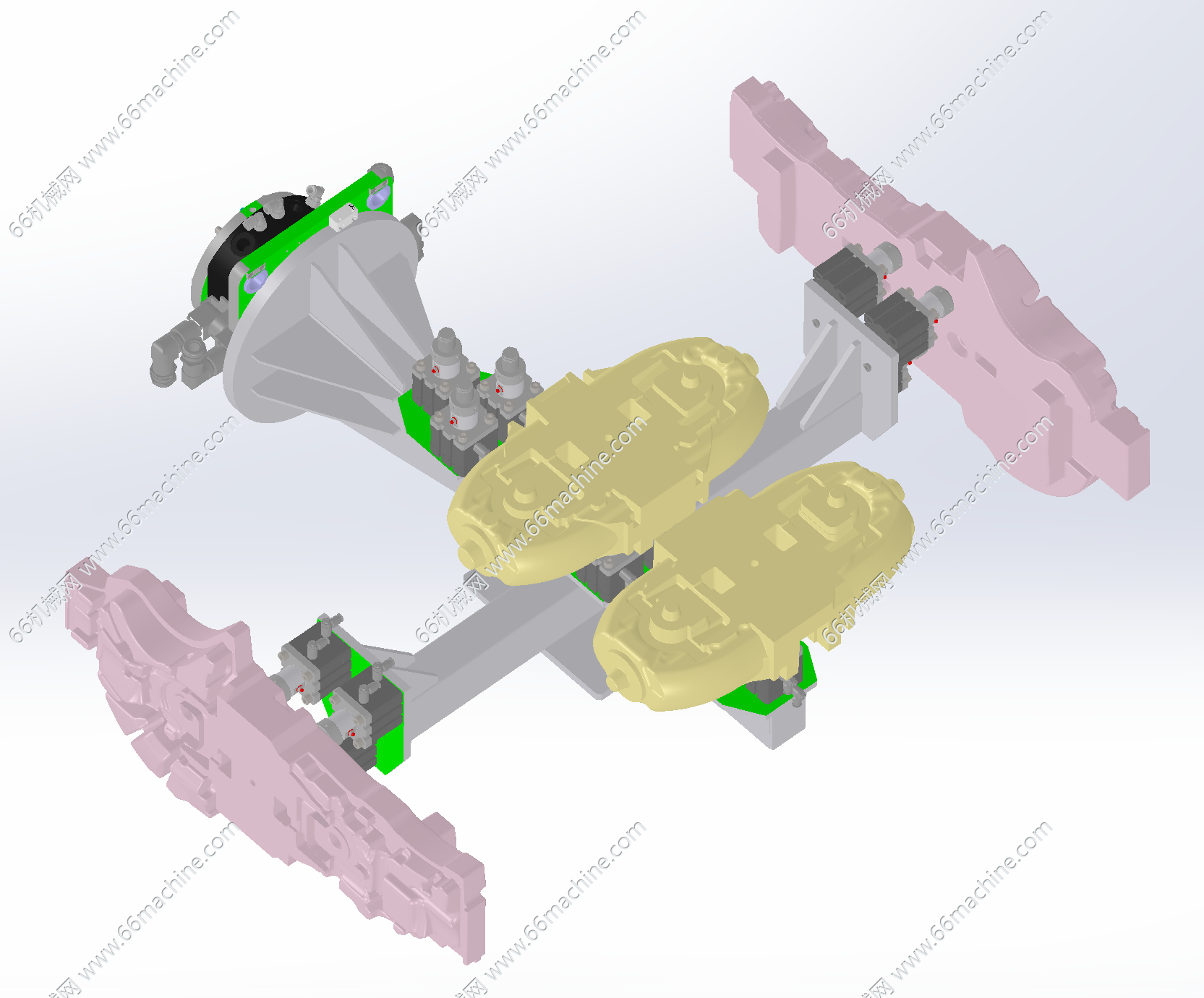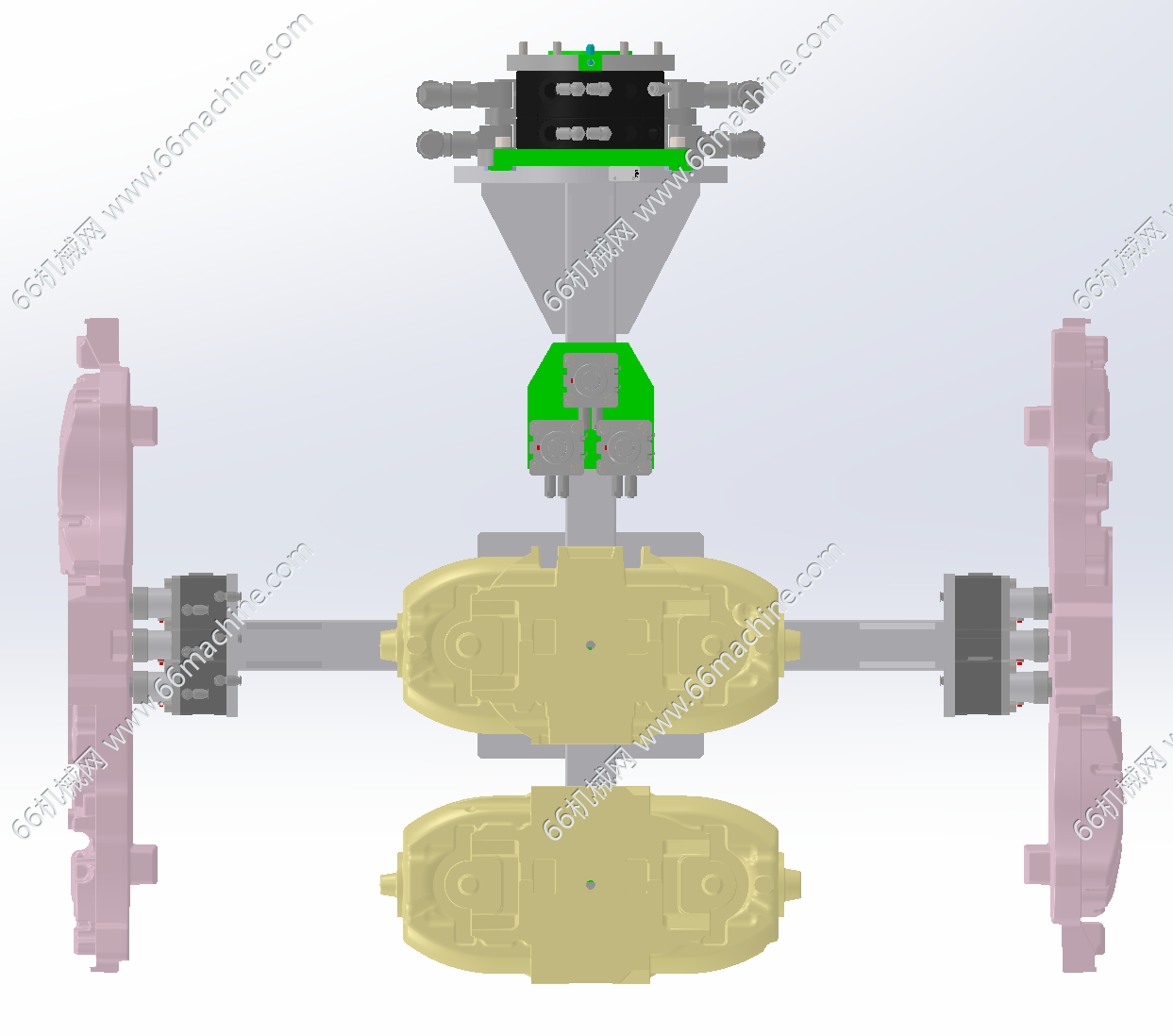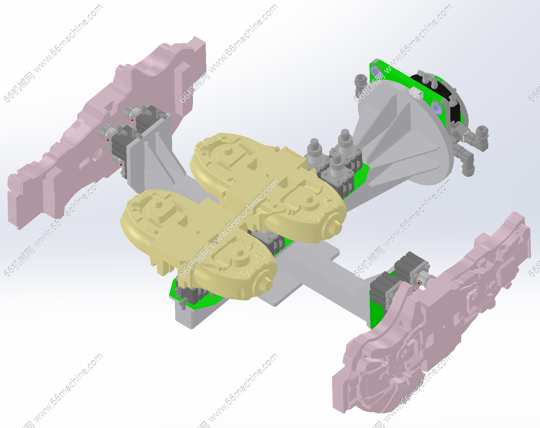 此三维图形为发动机缸体砂芯制芯机取件抓手三维模型,是成熟产品,可下载借鉴,与砂芯接触的部位为橡胶,均采用气缸涨砂芯工艺孔,制芯机一次制芯5件砂芯