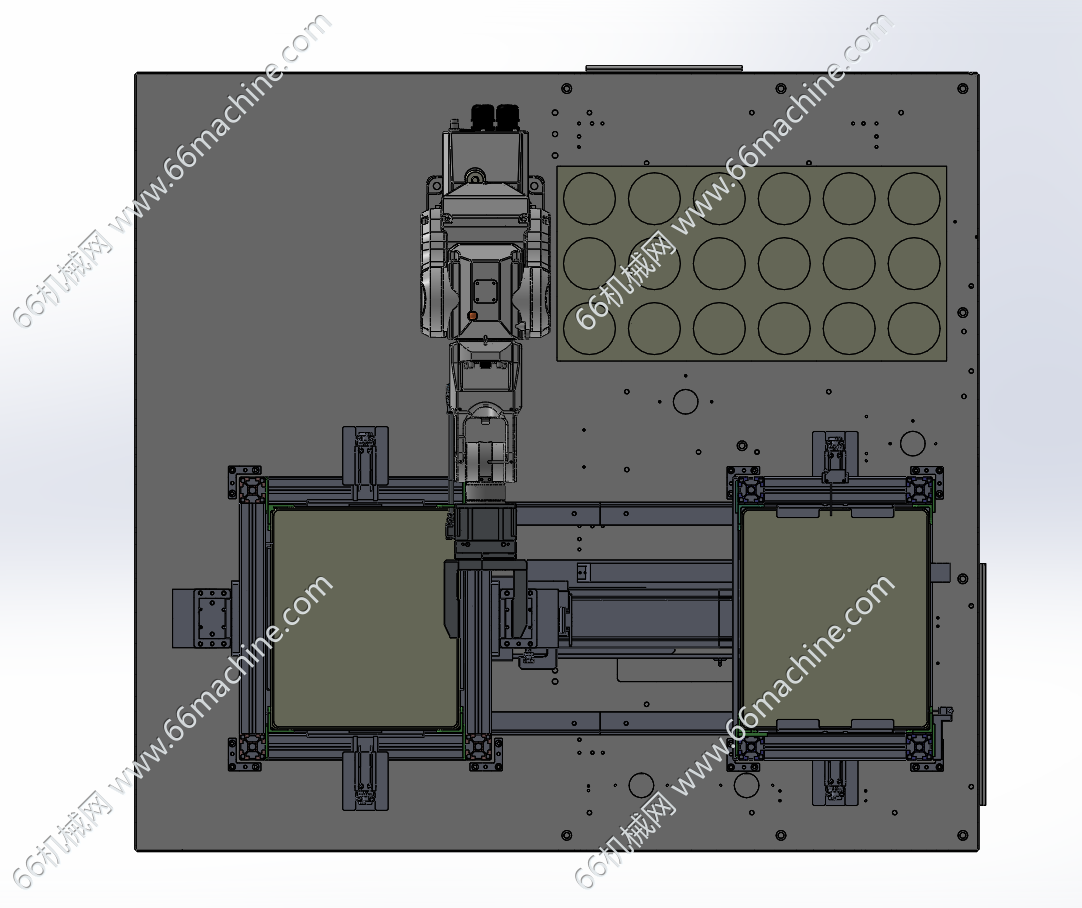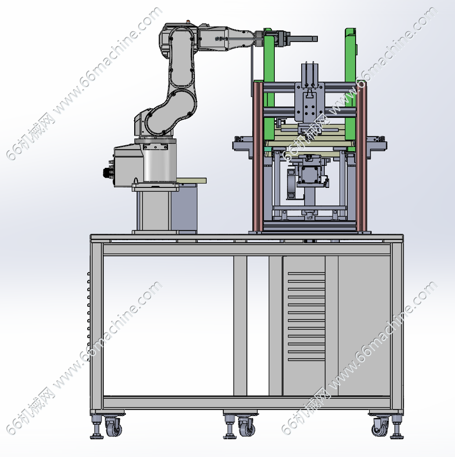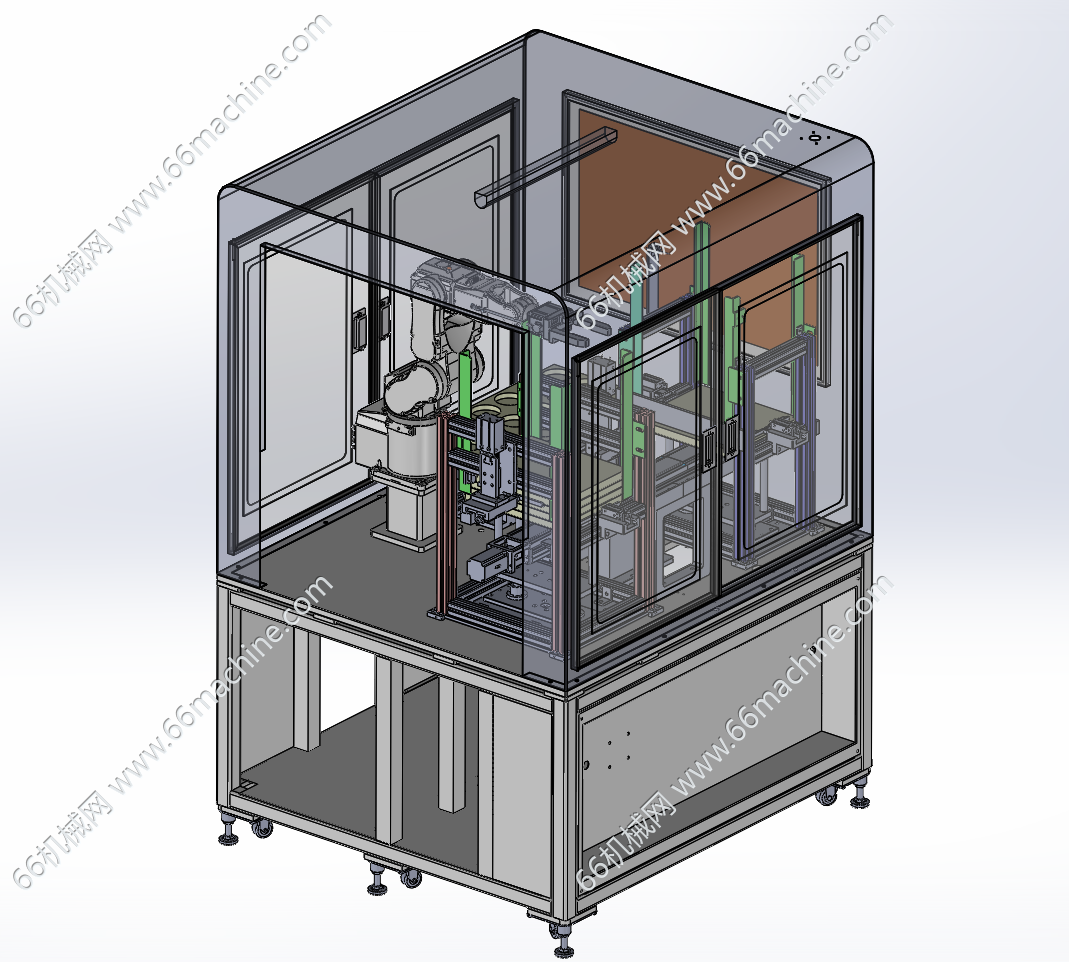 本设备为基于机器人的TRAY盘自动上料机,在一些产品的生产中,需要对产品进行自动上料,该机构为TRAY盘自动上料设备,通过机械手的来回移动进行一个自动上料,人工只需要一段时间进行一个上料。