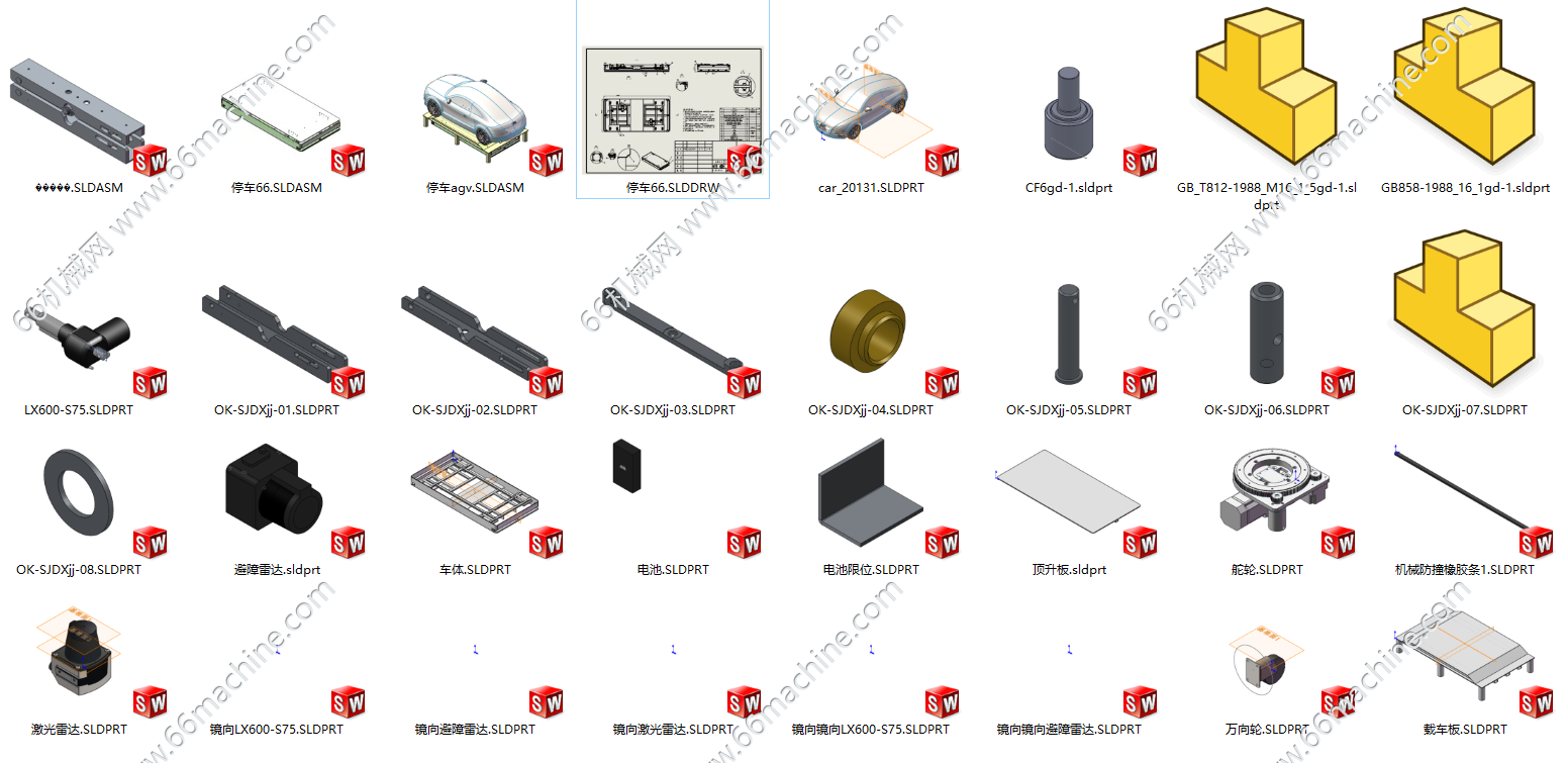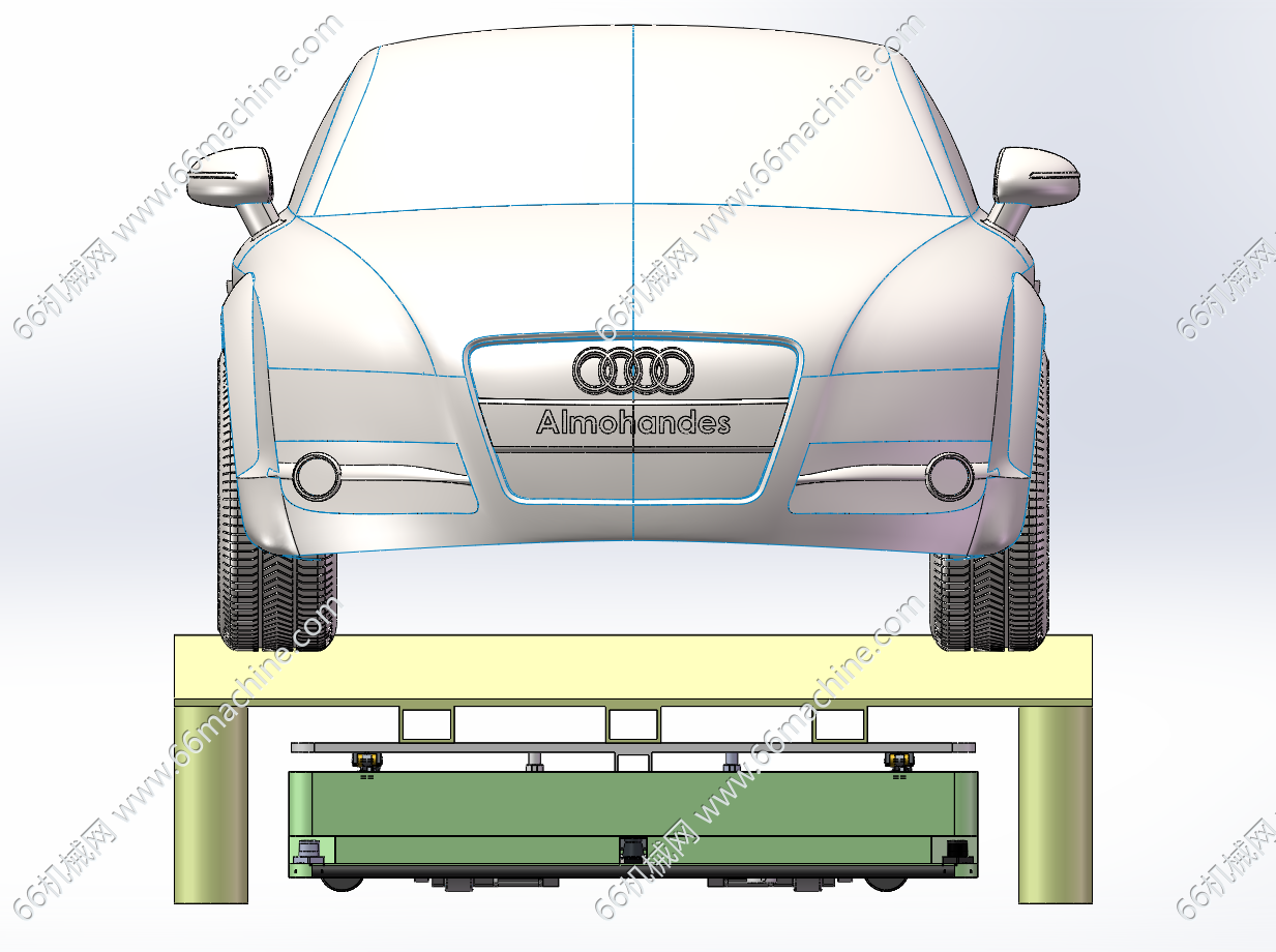本模型为AGV智能停车,主要由带顶升的AGV车及载车板组成,AGV根据激光雷达自主导航、集成中部顶升平台,可实现车辆举升、承载转运至指定停车位,具备行走稳定、定位精确、顶升可靠的特点。
