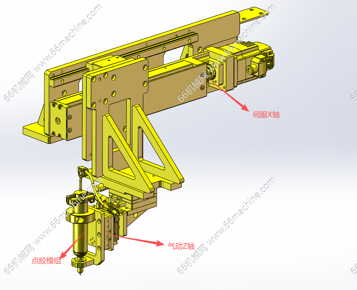 本模型为三轴点胶机,由运动控制系统、点胶执行系统及机架组成,通过三轴联动实现空间内平面及垂直方向的精准点胶作业,是电子制造、五金塑胶、汽车配件封装等行业中、滴胶的基础自动化设备,能替代人工实现胶水的定量、定位置、定轨迹涂覆,提升点胶精度、效率和一致性。