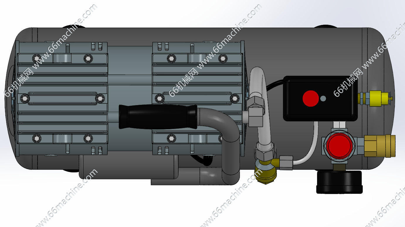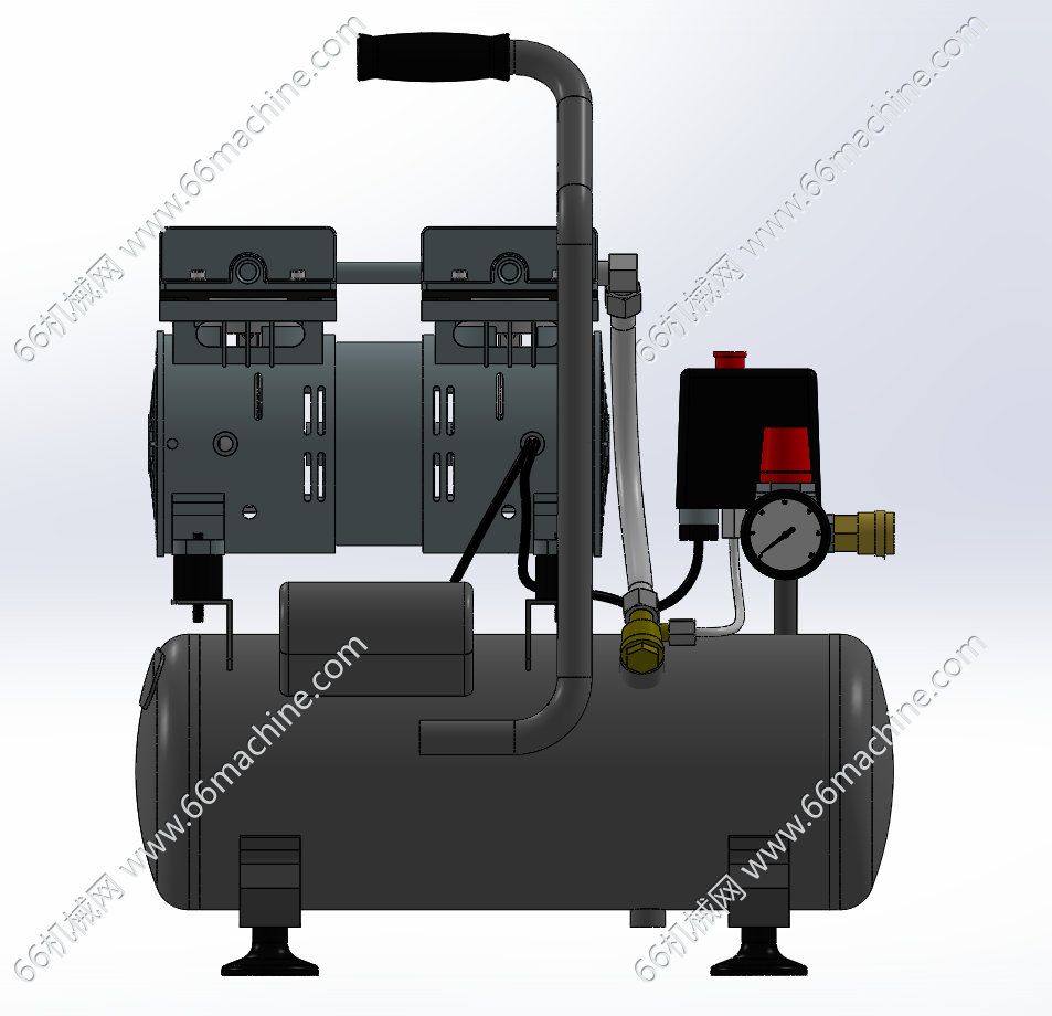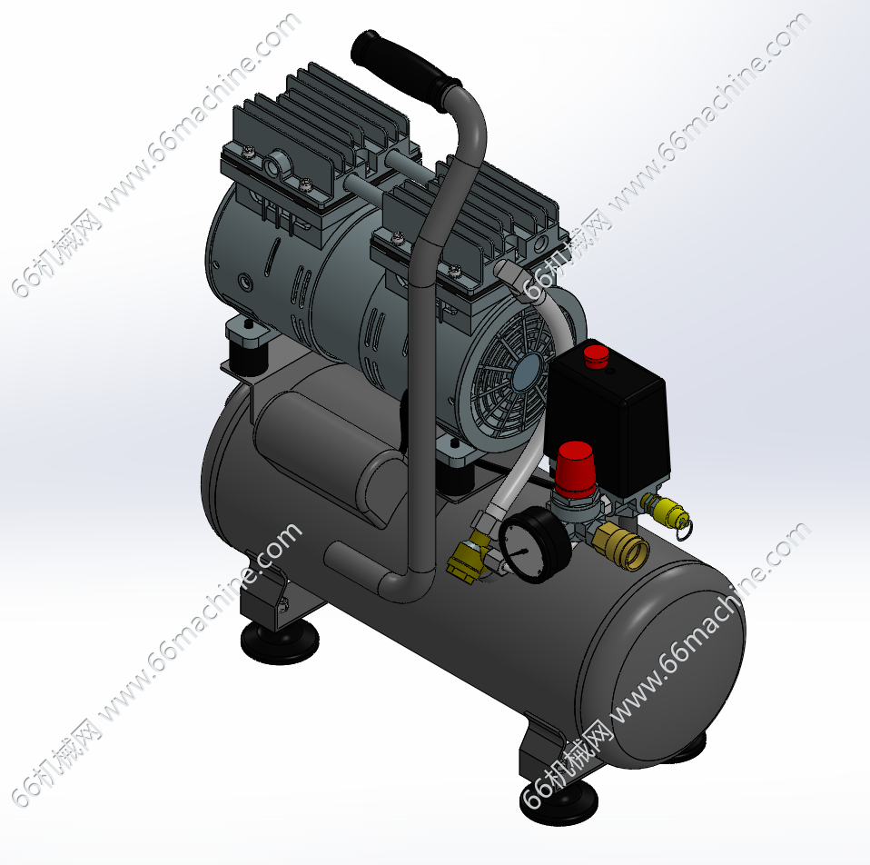 本模型为8L静音空气压缩机(空压机),是一种用于将原动机(通常是电动机或柴油机)的机械能转换成气体压力能的装置,它能够提供气源动力,是气动系统的核心设备。