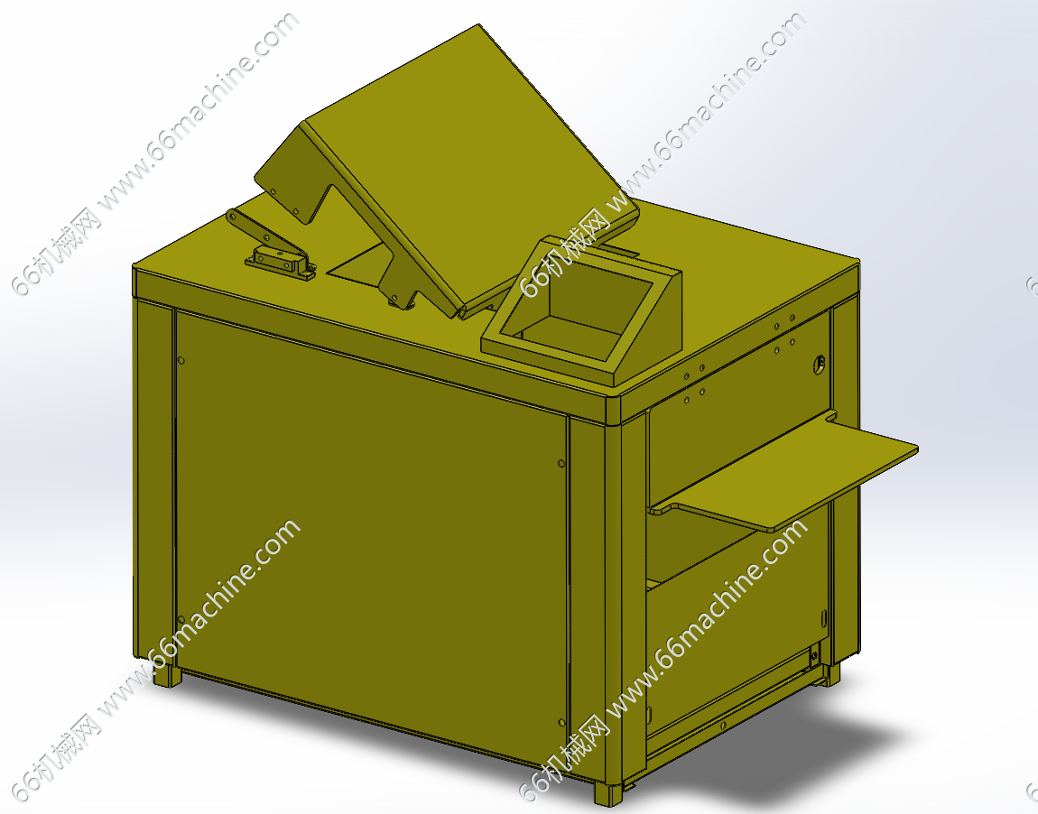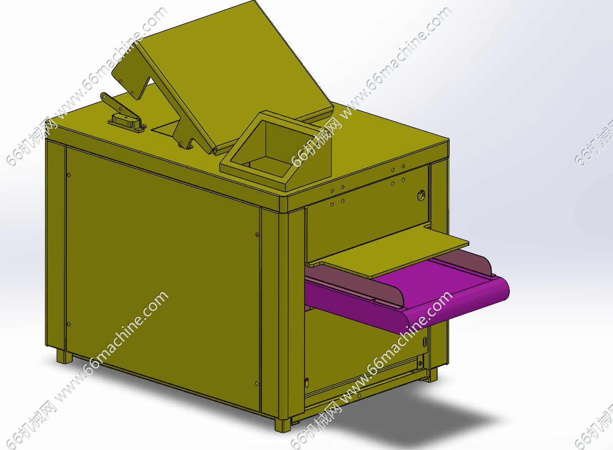 本模型为辊式面团分割机(切块机),面团从料口进入,电机经过带传动带带动一对切割辊旋转实现切条动作,然后经过皮带线流动至凸轮切割模组下进行切块,用于包子、馒头制作。