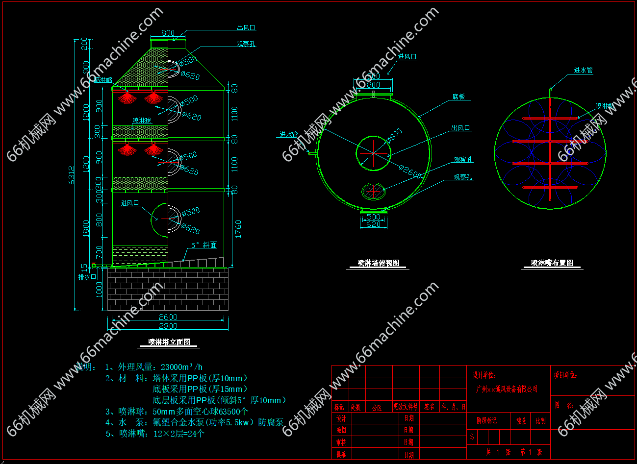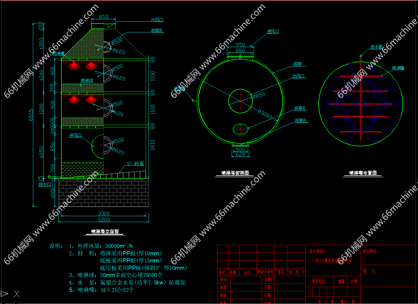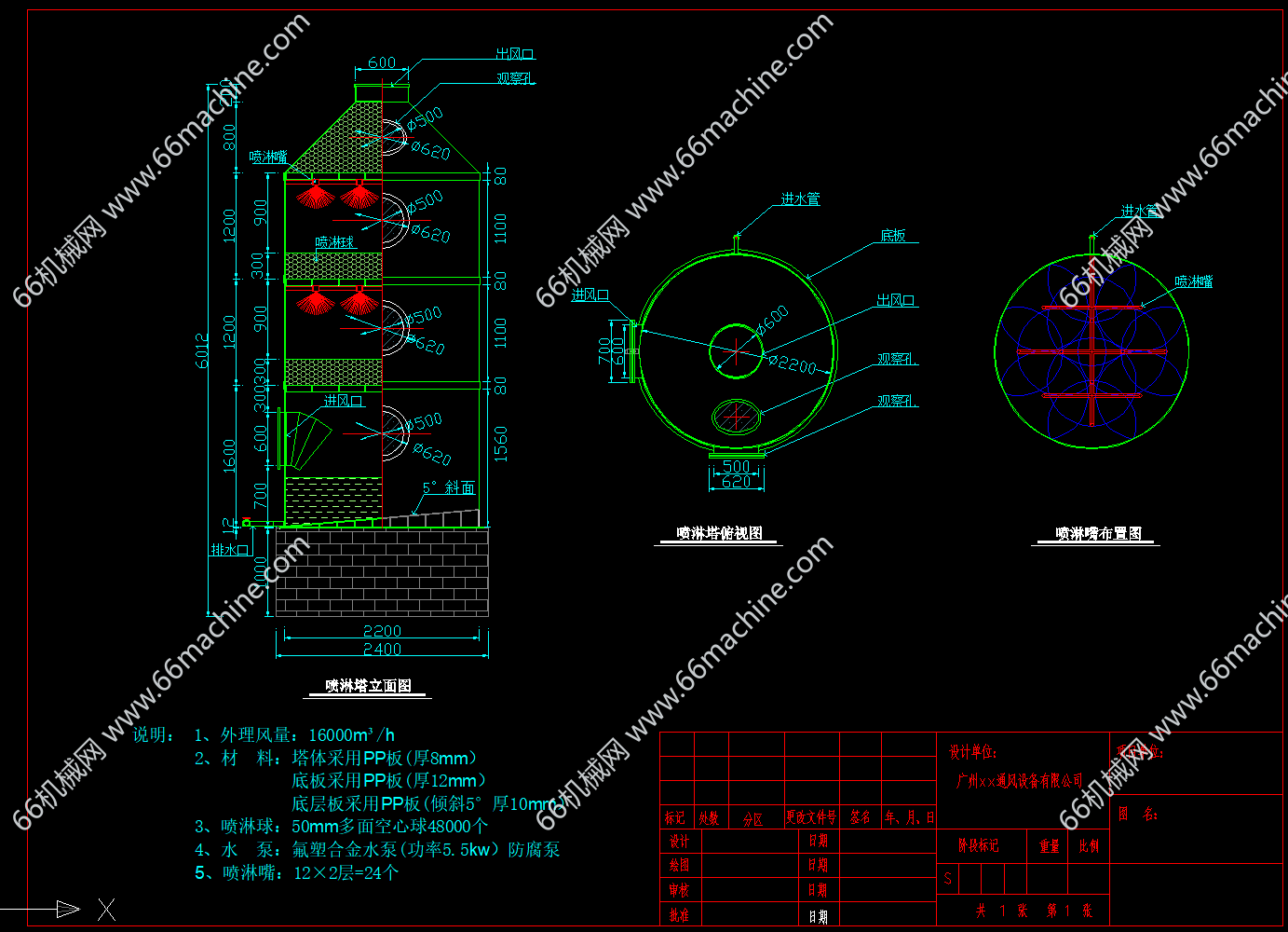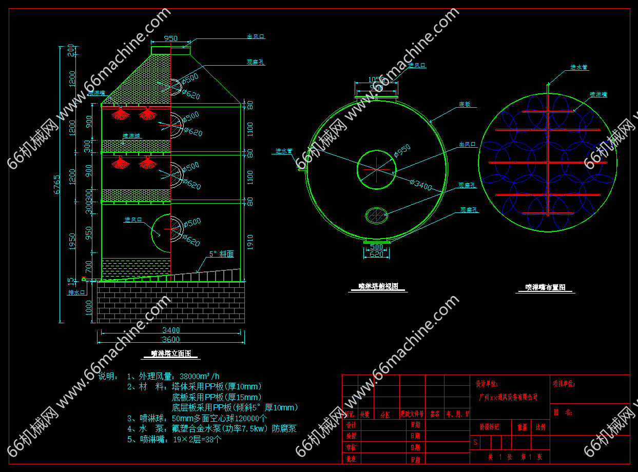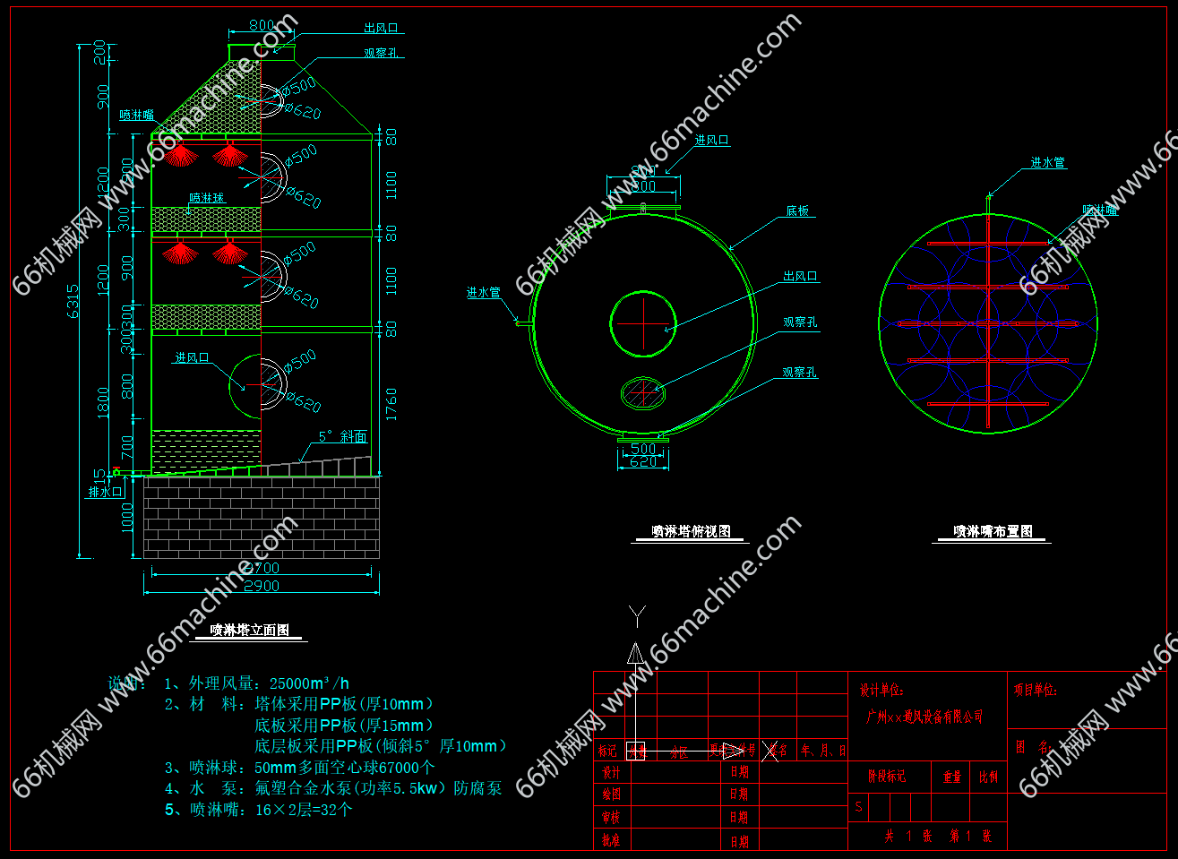 本图纸为广州xx通风设备有限公司的喷淋塔加工尺寸详图,材料:塔体采用PP板,底板采用PP板,水 泵:氟塑合金水泵防腐泵,内容包括喷淋塔立面图、喷淋塔俯视图、喷淋嘴布置图,为专业人员设计,可供大家探讨学习!