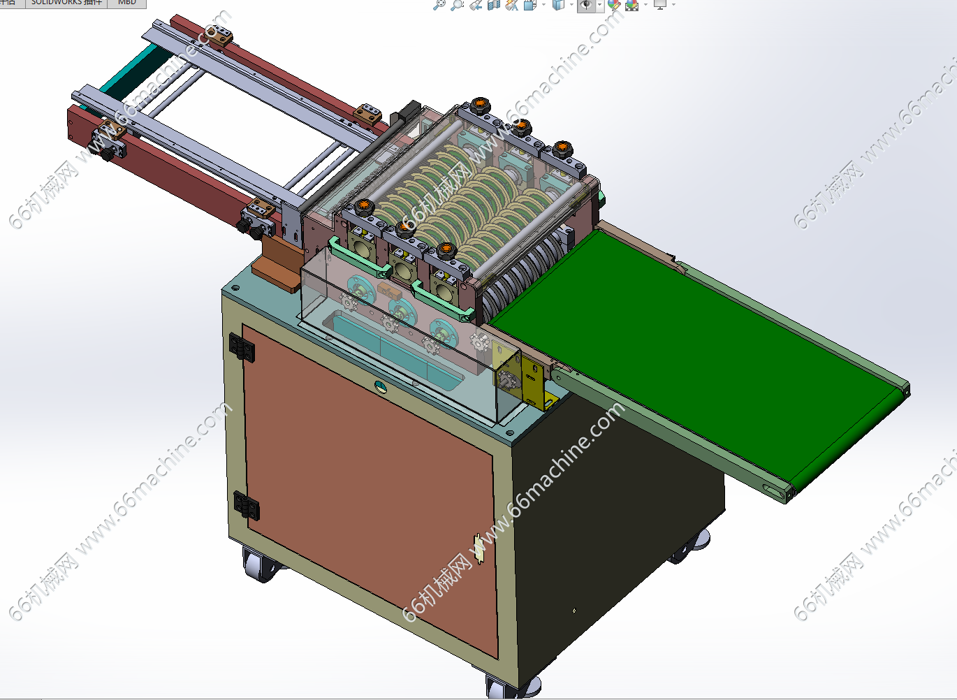 本设备为某企业多刀分板机(切板机),主要说明:1、设备外形尺寸:1847*660*1070(L*W*H);2、设备采用PLC+触摸屏控制,方便 快捷;采用三组刀分板、有效的减少了分板产生的应力,分板后的单条板不翘板,不变形;3、分板速度50-120mm/s(可调节)。本模型建模精巧,可供大家参考!