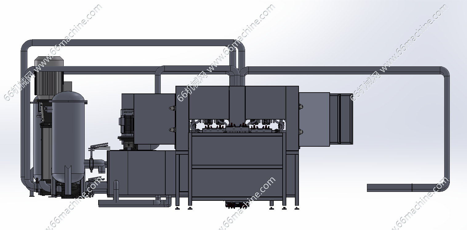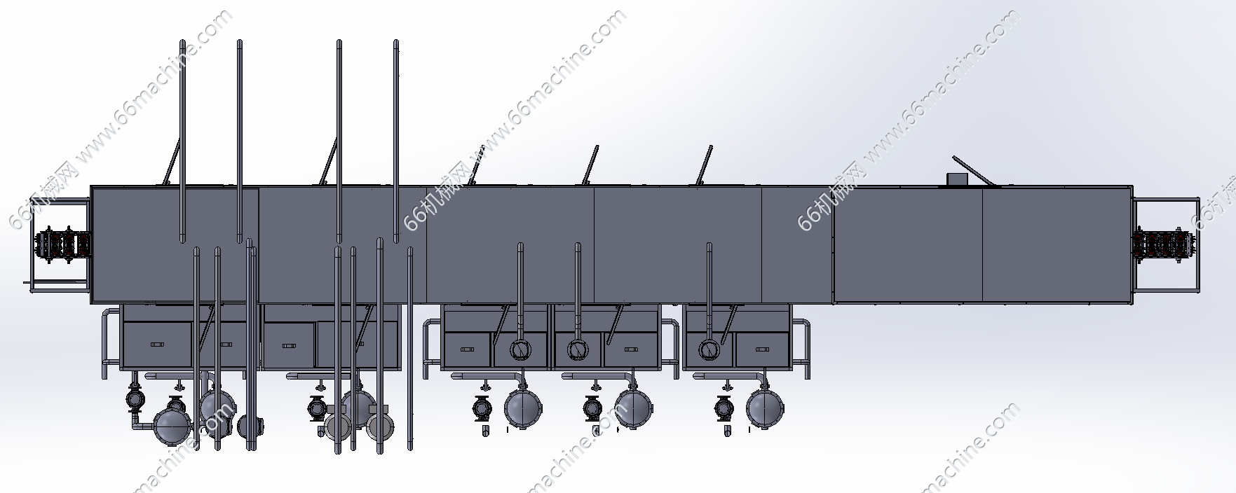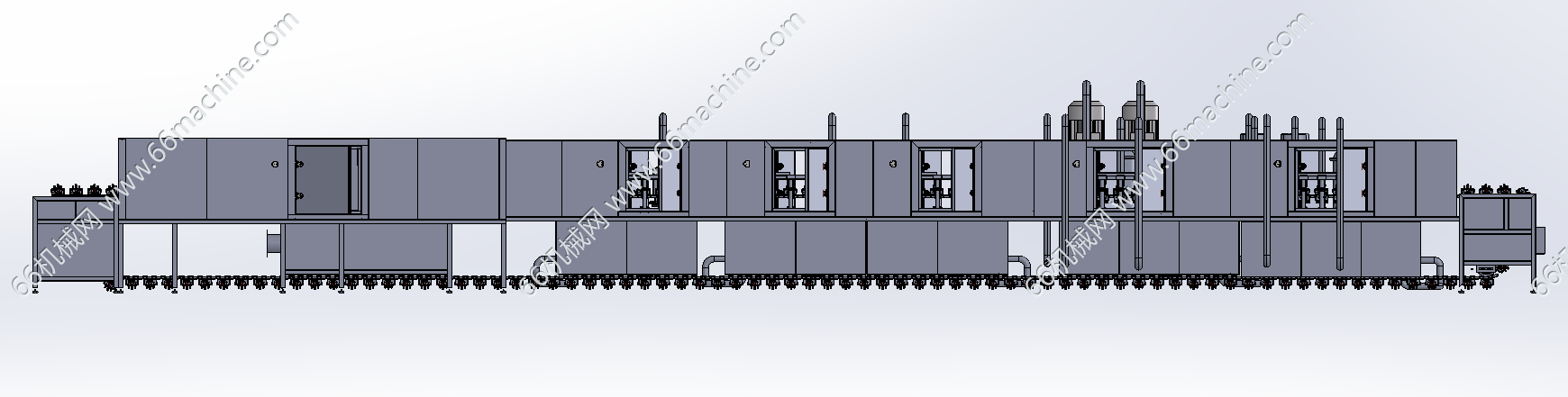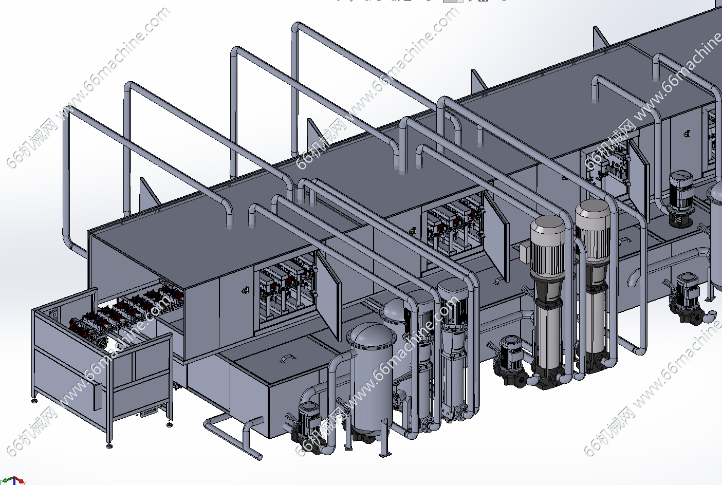 本模型为双通道清洗机,用于空调压缩机零件的清洗和防锈、烘干的流水线作业,工艺过程包括脱脂一,脱脂二,吹一,水洗一,水洗二,吹二,防锈,吹三等过程。整个流水线主体由316不锈钢制造,外购的设备有泵,鼓风机等,欢迎参考!