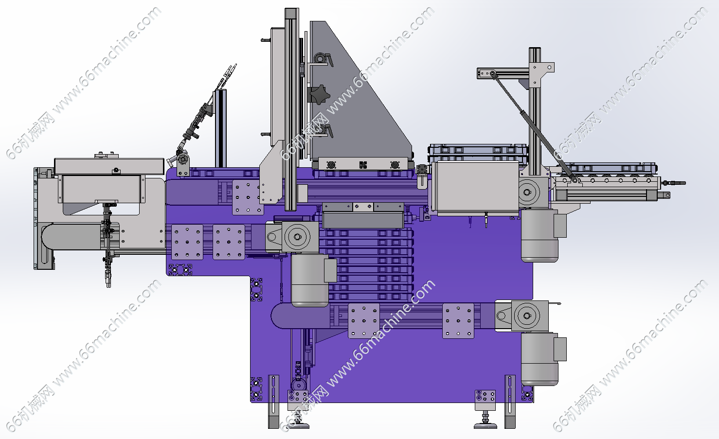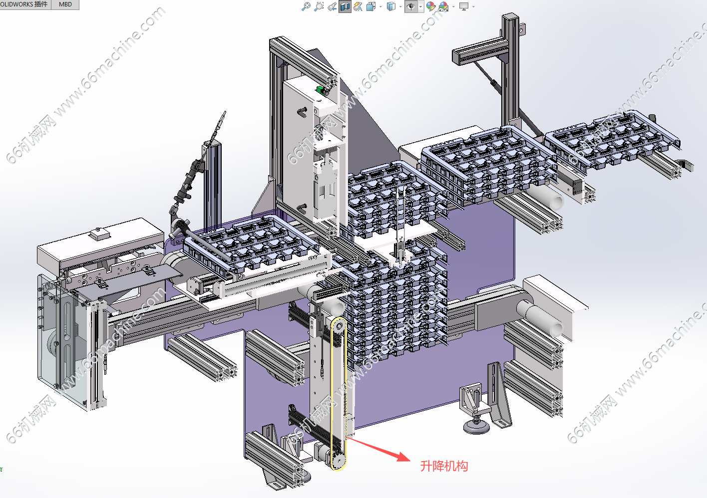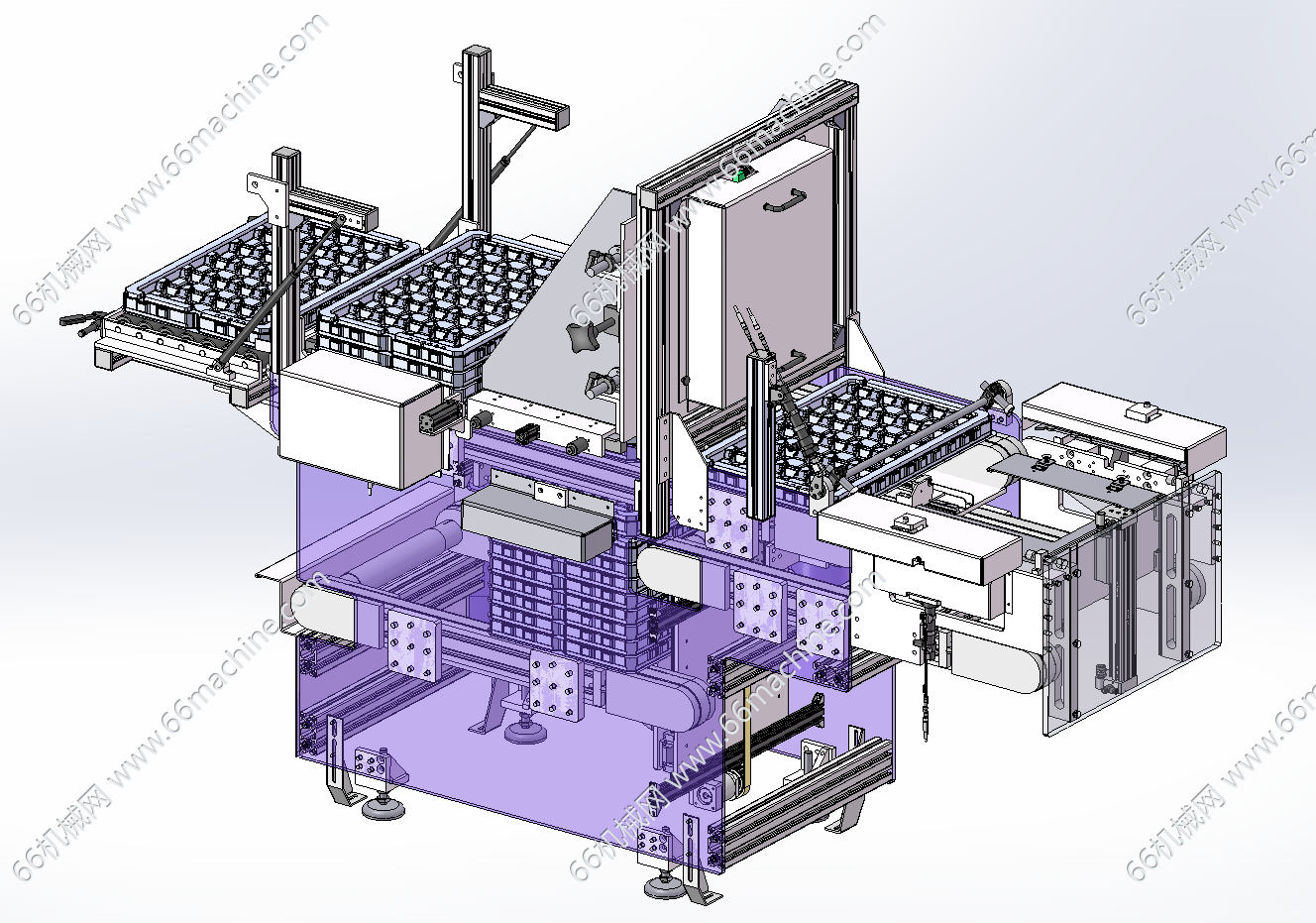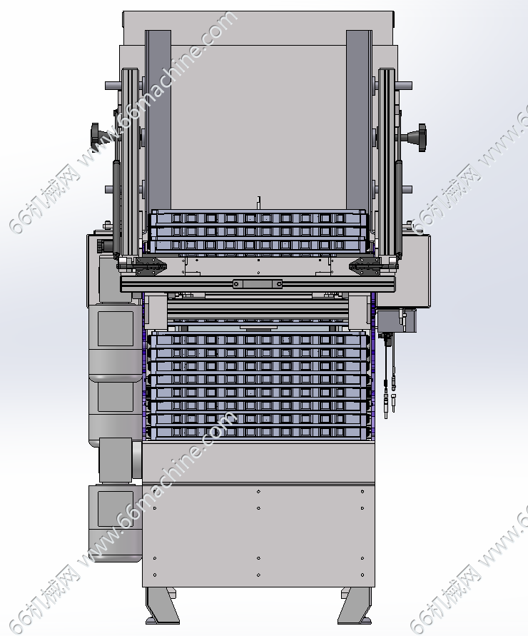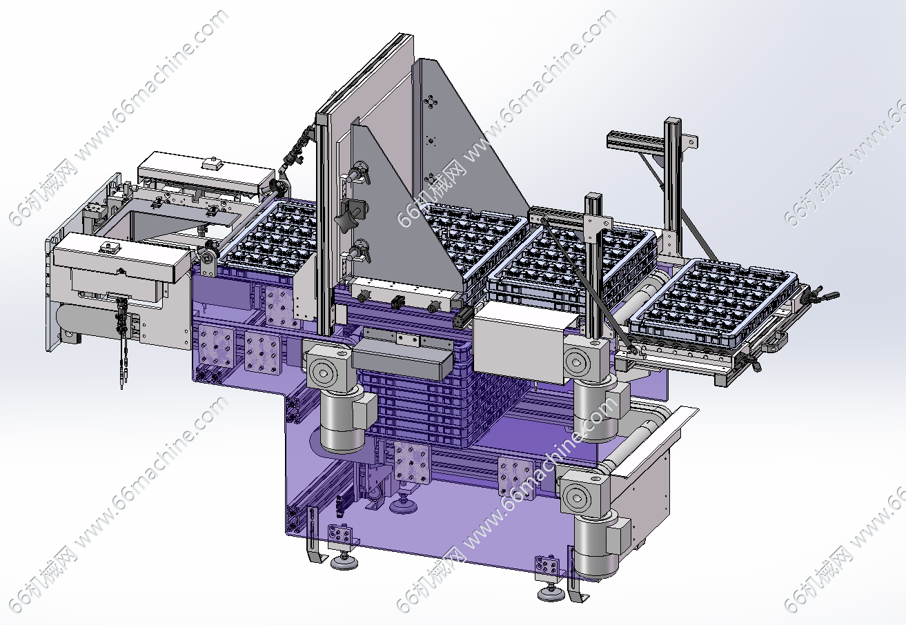 本模型为某企业TRAY盘上料分盘机(托盘上料机),由三层皮带输送机构成料盘堆叠析出供料,最底层皮带机是堆叠料盘供料,把料盘输送到供料位,升降机构把料盘输送到顶部皮带机上,分盘机构把料盘卡住分层输送设备右侧。带取完料空盘又由上面皮带机输送到左侧空盘位,由升降机构把空盘运转到中间皮带机上堆叠后通过底部皮带机输出。欢迎参考!