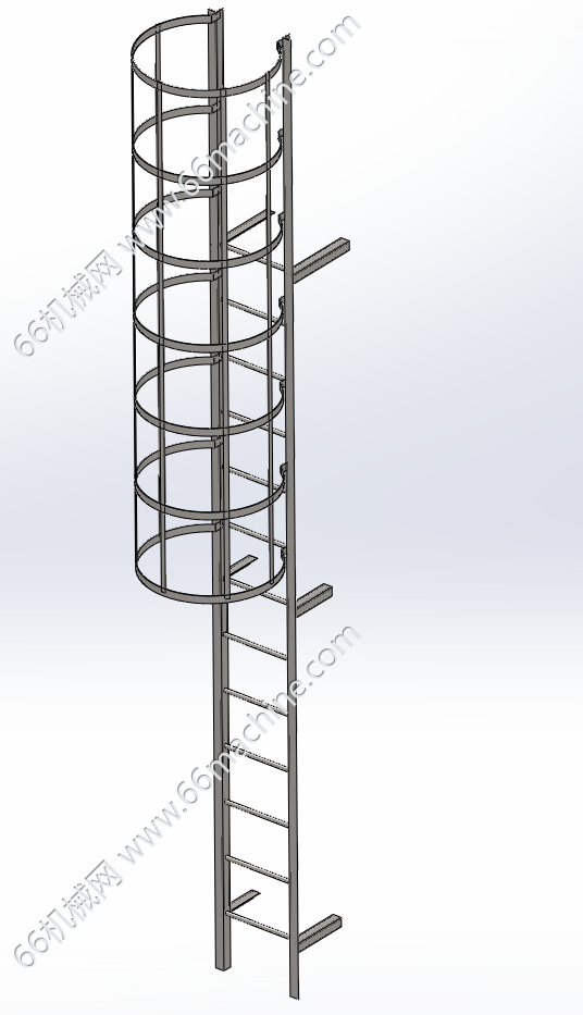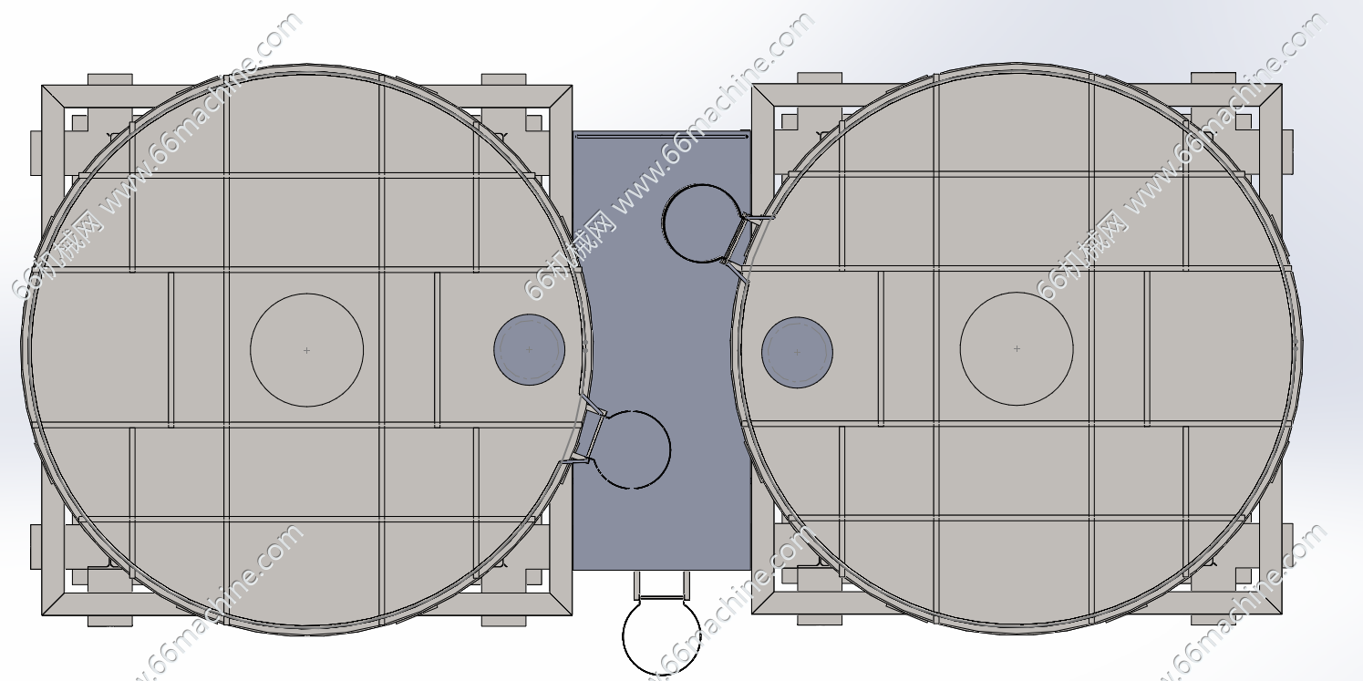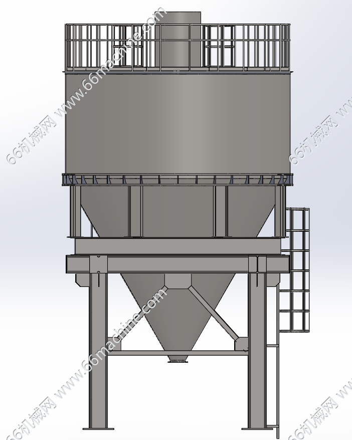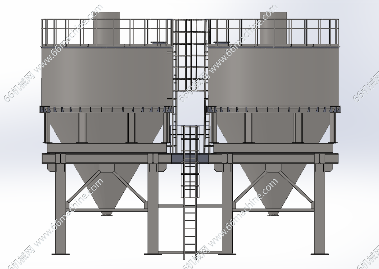 本模型为颗粒、粉体物料筒料仓,主体为碳钢材质的上圆下锥结构,通过钢结构支架支撑,顶部设有检修平台、护栏及人孔,两台料仓间由钢梯连通,主要用于粮仓、建材等行业,实现物料的密闭储存与稳定供料,兼具防堵、防潮、防尘与便于检修维护的特点。