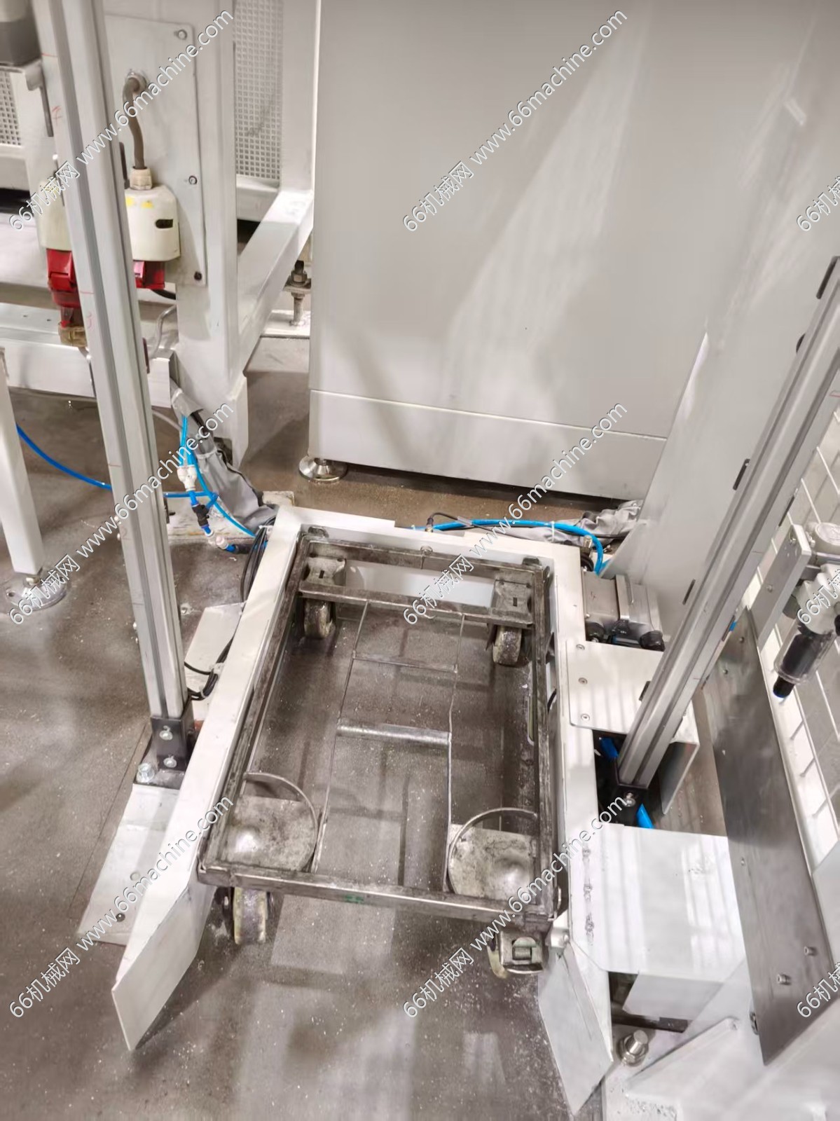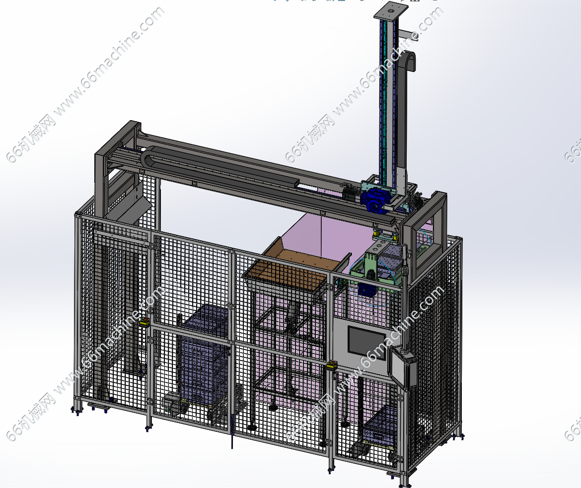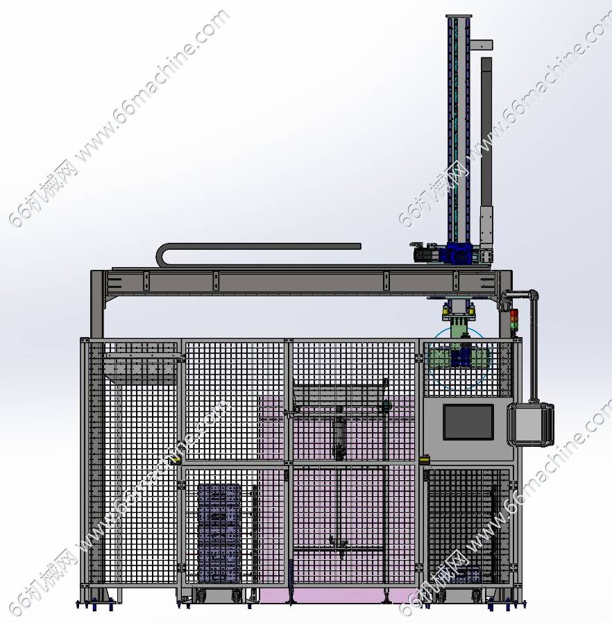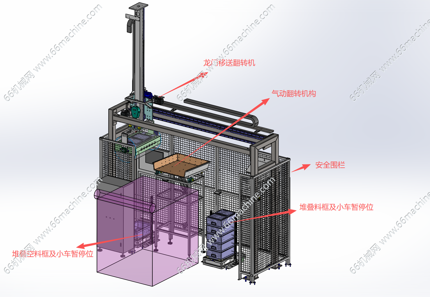 本模型为龙门翻转倒料机,主要由龙门移送翻转机、气动翻转机构、堆叠料框及小车暂停位及安全围栏组成,龙门移送翻转机抓取堆叠的料框并将内部产品倒入气动翻转机构的托盘上,然后再倒入存储框内!