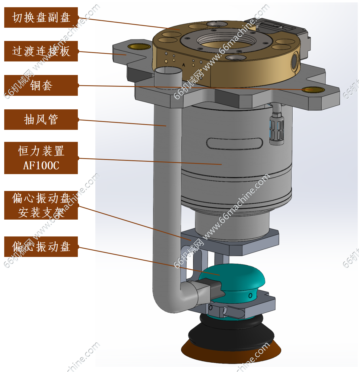 此三维为振动盘恒力打磨装置,主要用于打磨油漆表面或是薄板划痕打磨,采用恒力装置,使得与产品表面接触力均为恒力,恒力装置有效浮动范围为±30mm,接触力可调在0-100N范围之内