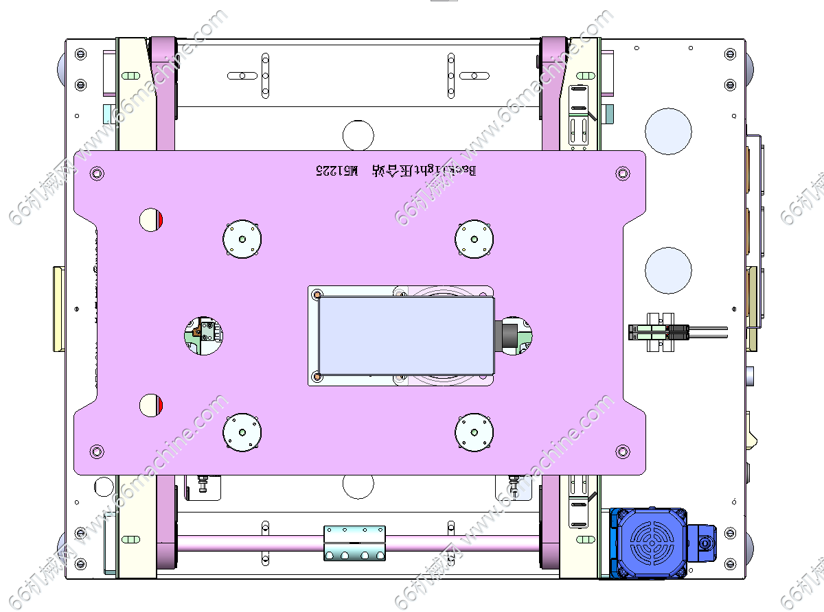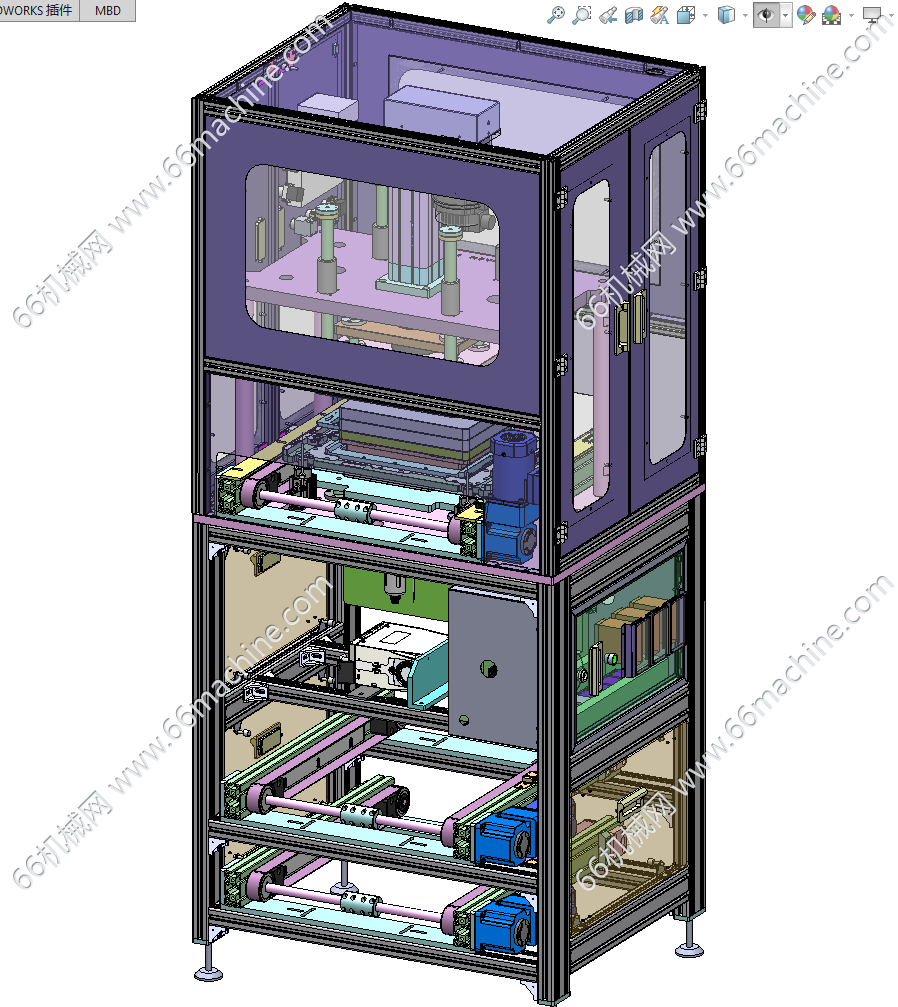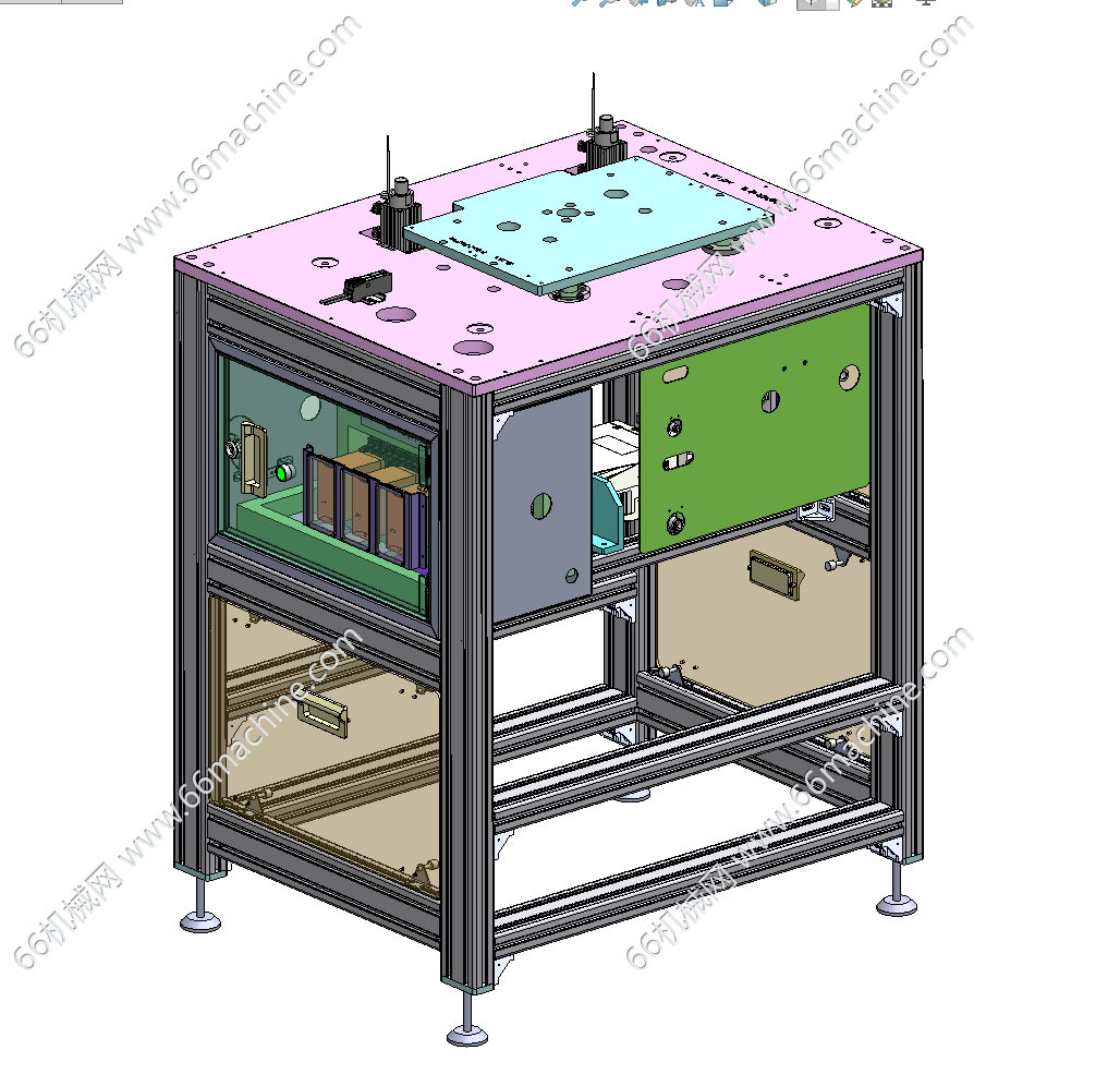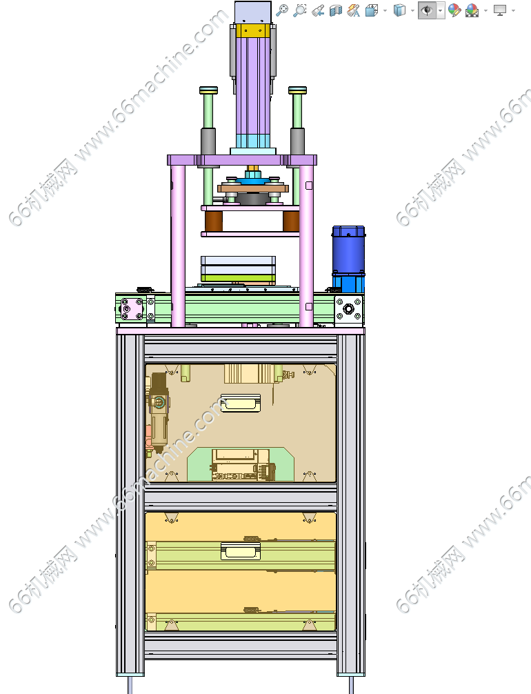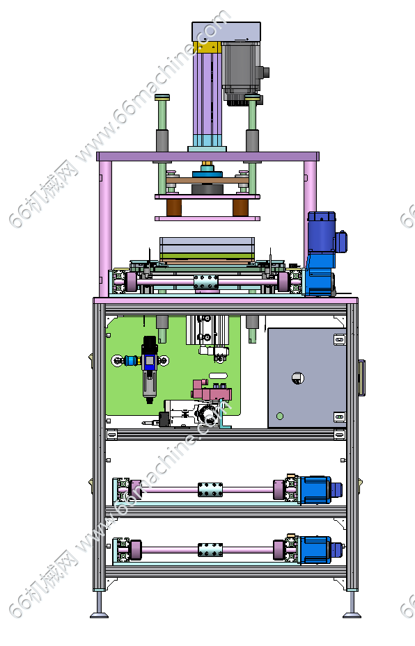 本模型为某企业电缸伺服压机,主要由下机架、机罩、载具输送线、气动顶升模组、伺服压机模组等组成,产品放置在载具内,由皮带线流入,然后气动顶升模组将载具顶升一定高度,接着伺服压机模组进行压合!