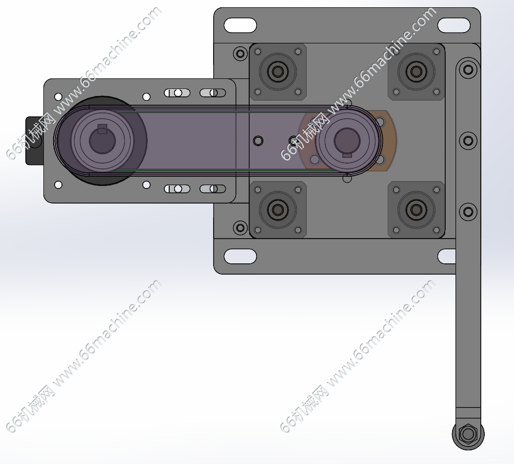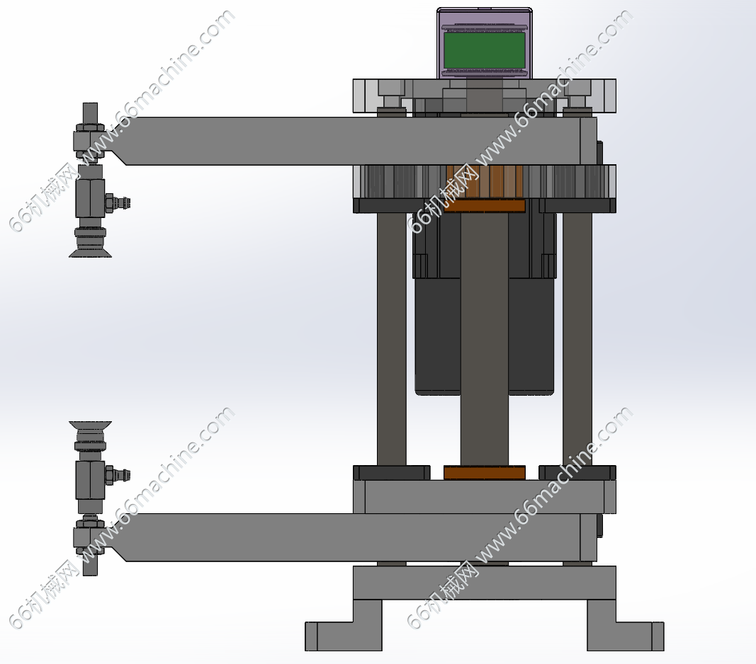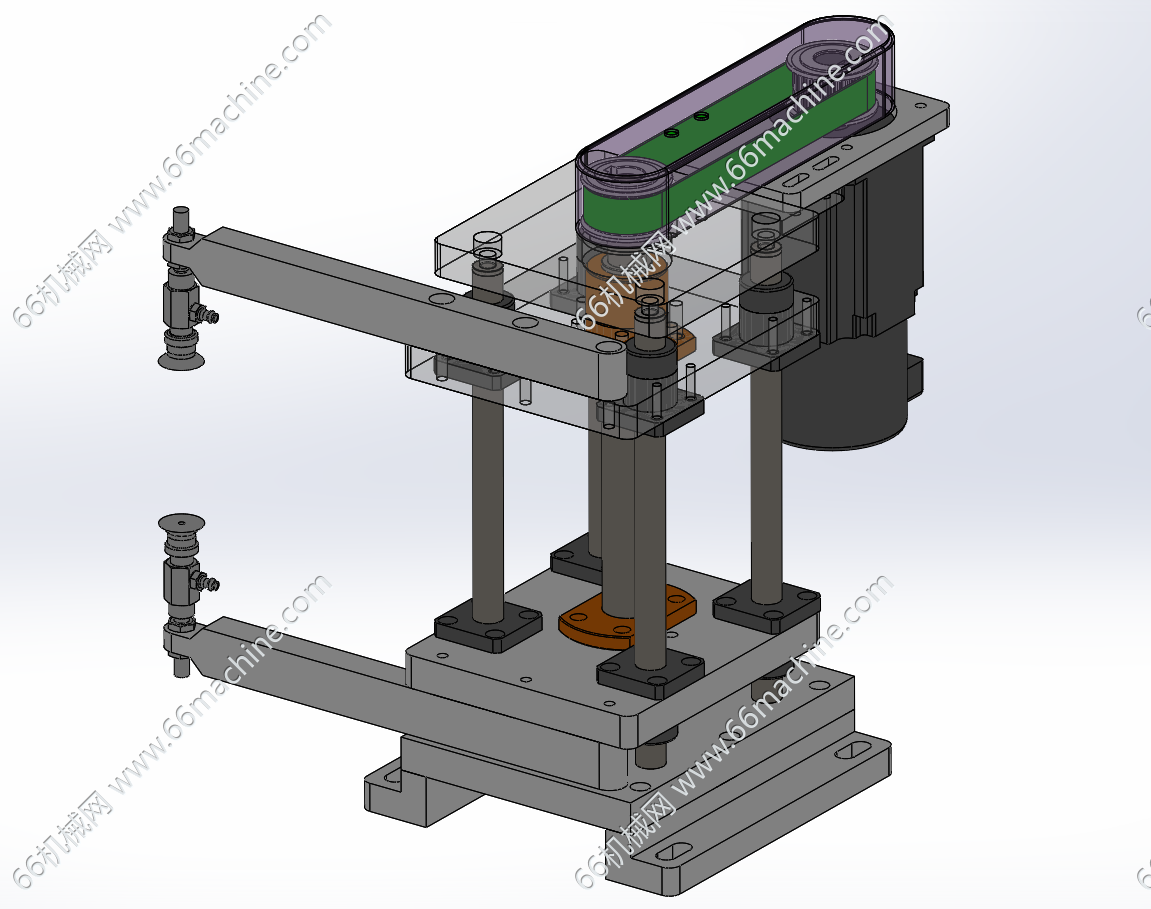 本模型为基于正反丝杠的吸取开袋机构,是指利用一根加工有左旋(反牙)和右旋(正牙) 螺纹的丝杠作为核心传动部件,将电机的一个单向旋转运动,同时转换为两个执行端的同步、反向的直线运动,吸嘴吸紧袋口完成开袋动作。