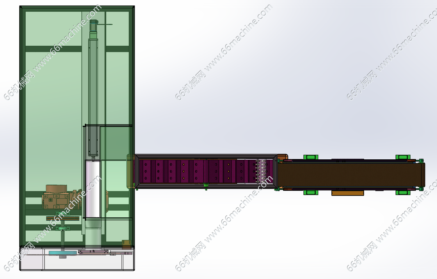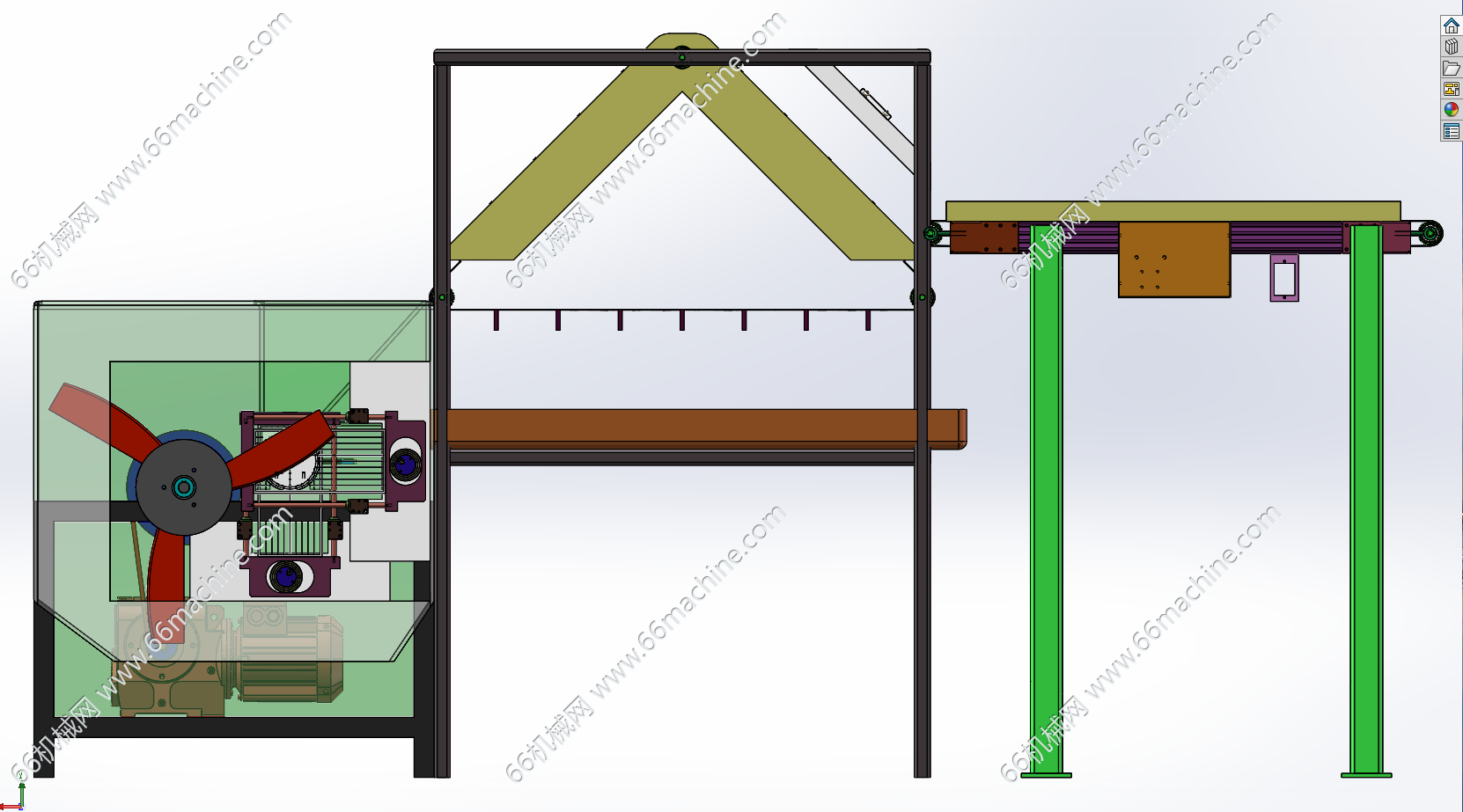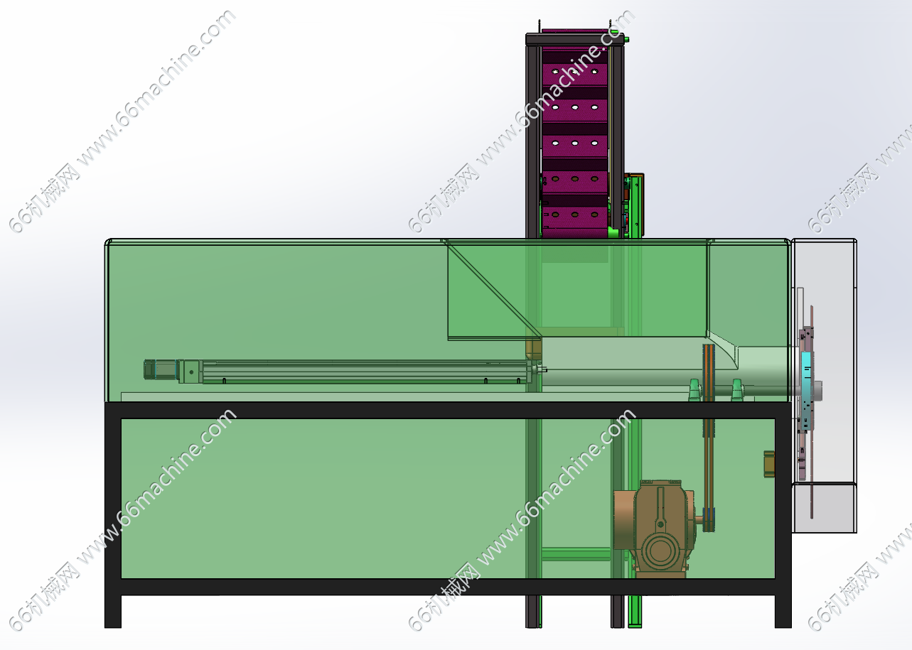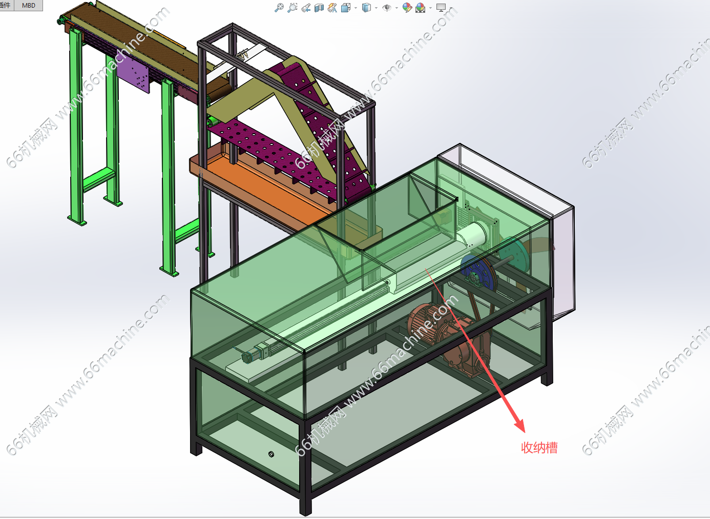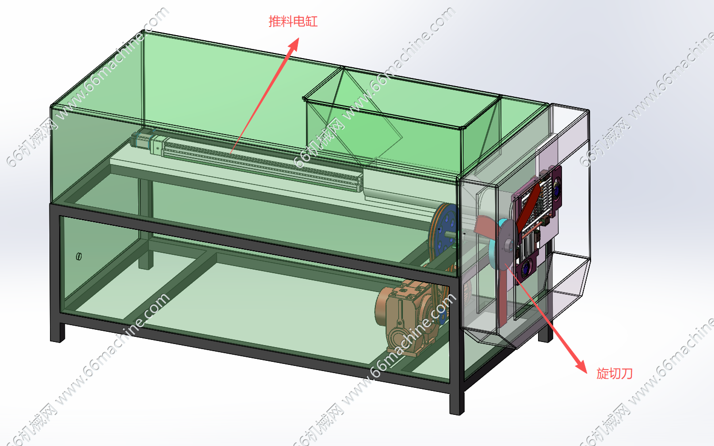 本模型为圆形果蔬喷淋清洗切块机(切丁机),皮带线将果蔬输送至三角形挡板输送线上,然后进行高压喷淋清洗,接着送至切块机进料口流至收纳槽内,最后电缸推动果蔬经过纵向切刀模组及横向旋切刀进行切块,结构比较精巧,欢迎下载参考!