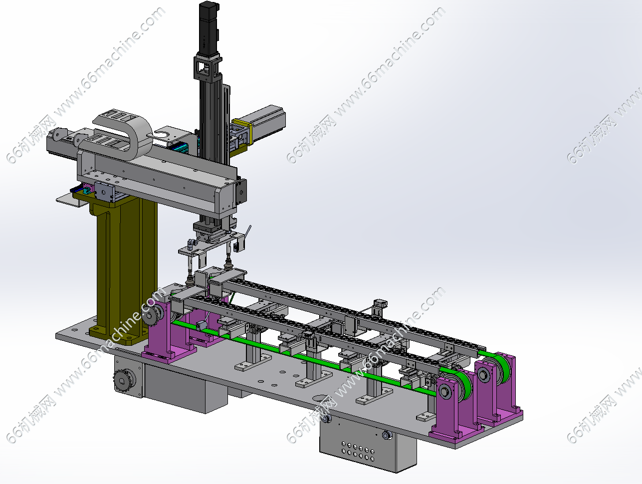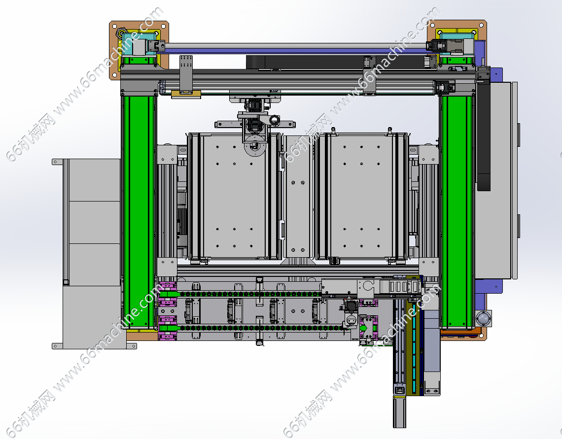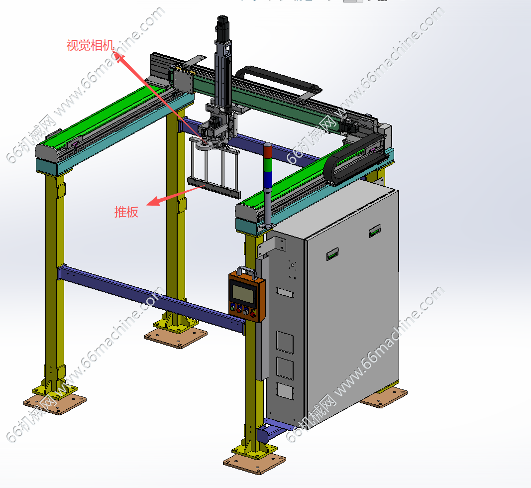 本模型为真空瓶活塞、瓶盖等龙门抓取收料机,主要由视觉引导龙门三轴推料机构、双工位提升机、三轴活塞抓取移送机构及皮带输送线等组成,抓取移送机构抓取工件放置在提升机的载具上,然后三轴推料机构将载具推送至料车(未画出)上。本模型可用于多种产品的收料,通用性强,可供大家参考!