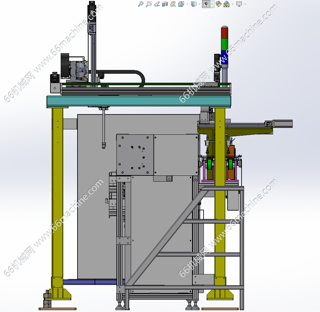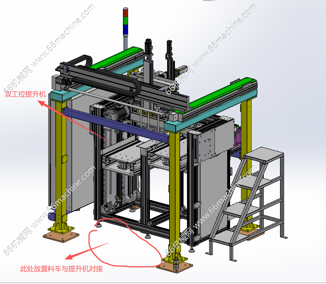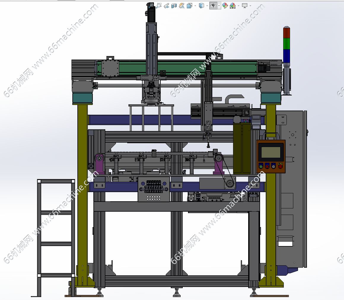 本模型为真空瓶活塞、瓶盖等龙门抓取收料机,主要由视觉引导龙门三轴推料机构、双工位提升机、三轴活塞抓取移送机构及皮带输送线等组成,抓取移送机构抓取工件放置在提升机的载具上,然后三轴推料机构将载具推送至料车(未画出)上。本模型可用于多种产品的收料,通用性强,可供大家参考!