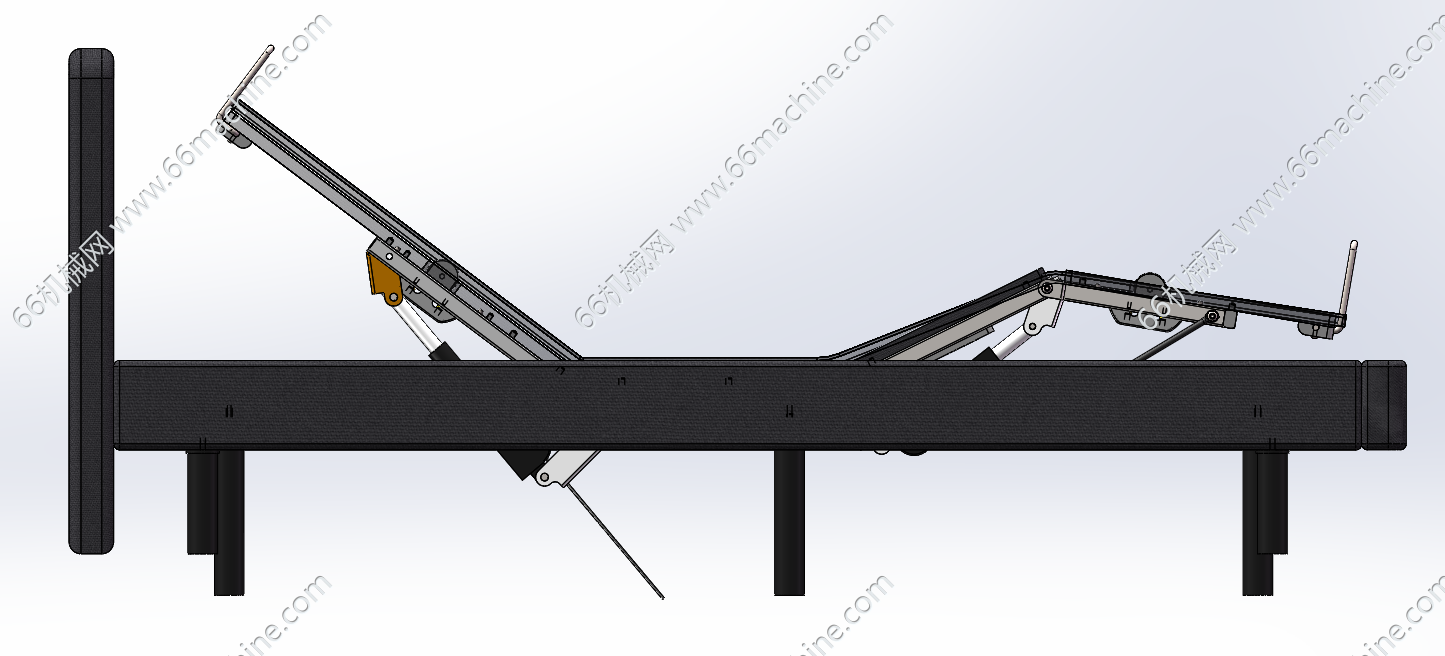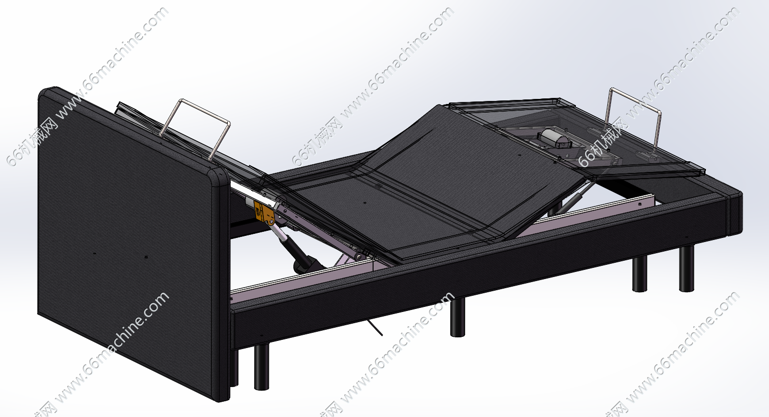 本模型为带电动按摩的折叠床,床体采用分段式结构,通过内置电动推杆实现背部与腿部的独立角度抬升,满足起身、休闲等不同姿态需求。床板下方集成振动电机,可提供多档位、多模式的背部及下肢按摩功能;整体框架支持折叠收纳,配合多支撑脚结构保障稳定性,布艺软包外观兼顾舒适与家居美观,适用于家庭养老、高端智能家居或小户型空间,兼具护理辅助、健康舒缓与空间高效利用的特点。