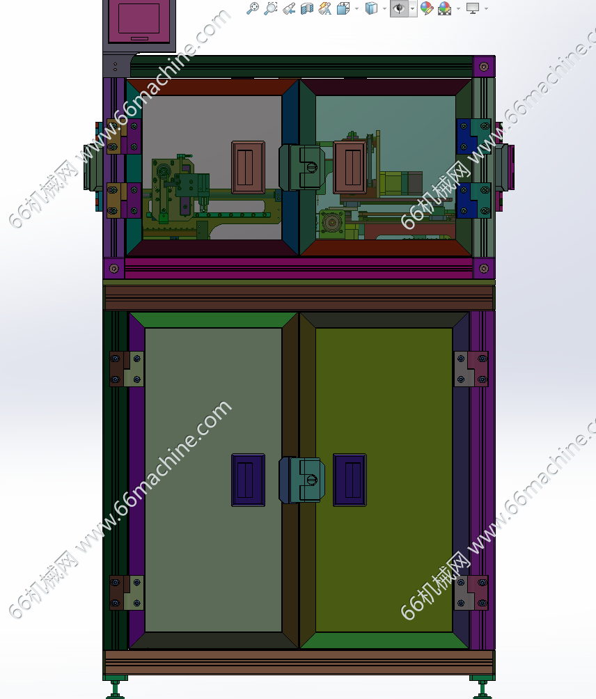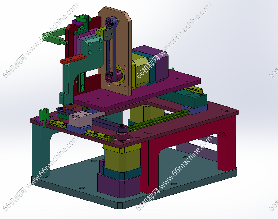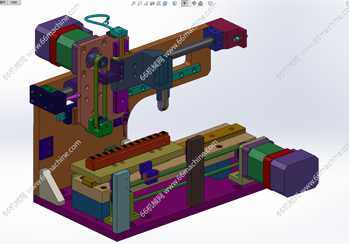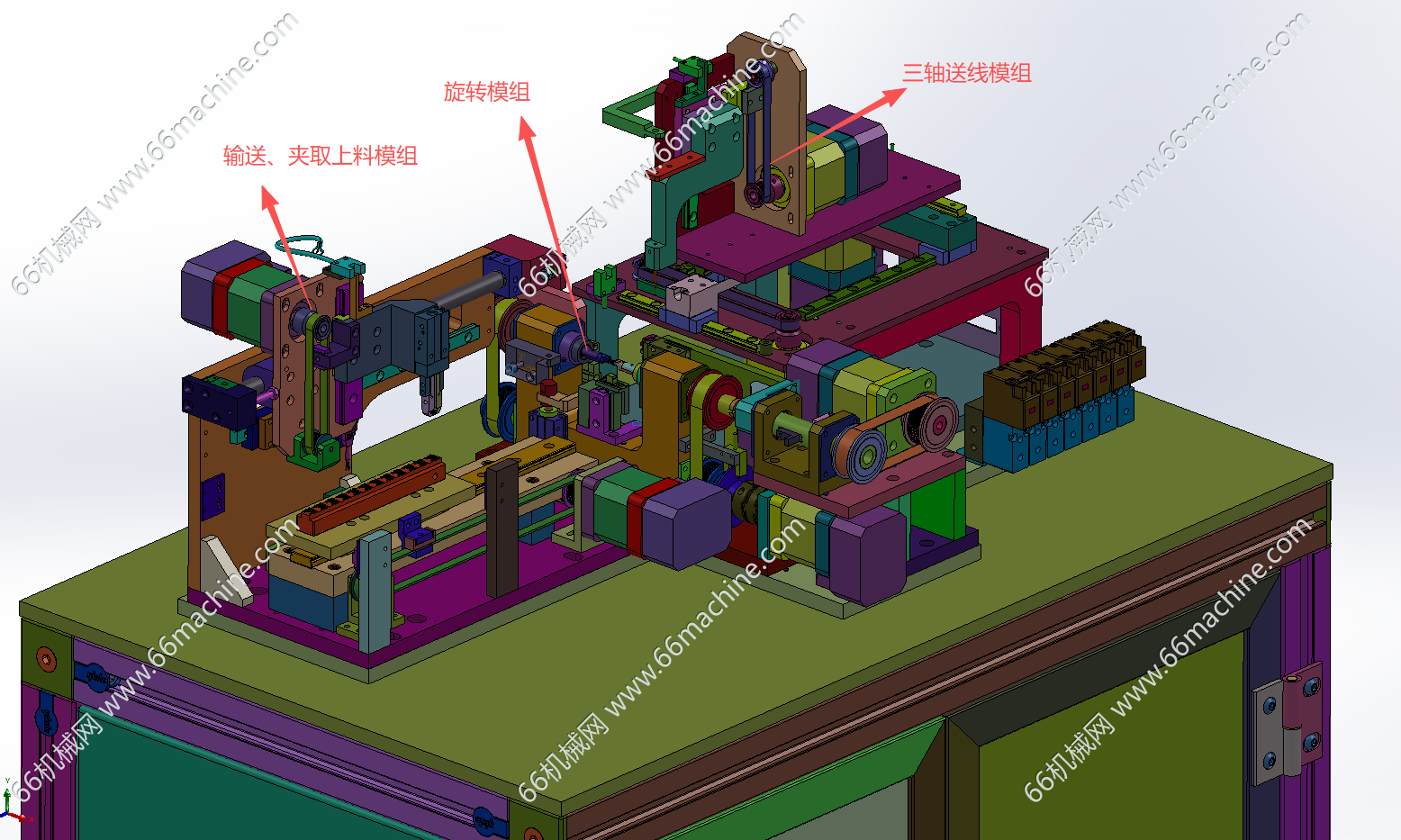 本模型为小型工件绕线机,主要由输送夹取上料模组、旋转模组、三轴送线模组、下机架及机罩组成,夹取上料模组将工件上料至旋转位,送线模组配合旋转模组动作实现绕线作业,欢迎参考!
