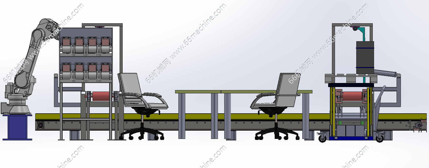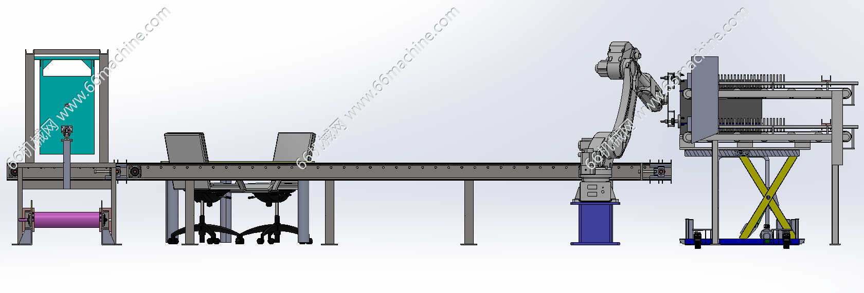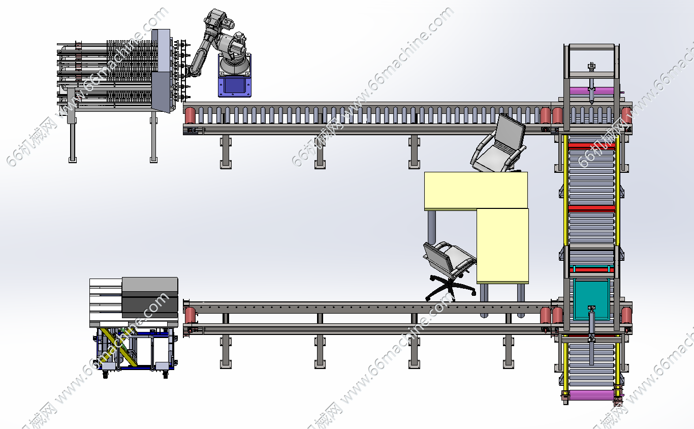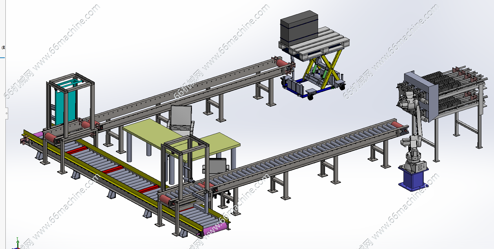 本模型为基于机器人的自动化分拣系统,适用于电商或制造业的成品仓储场景。货物经滚筒线输送,通过机器人分拣、AGV 转运,配合人工复核环节,实现货物从仓储区到出货区的高效流转,提升仓储分拣的自动化程度与准确率。