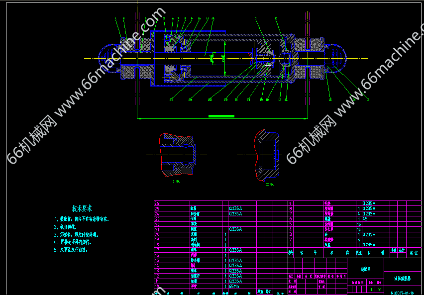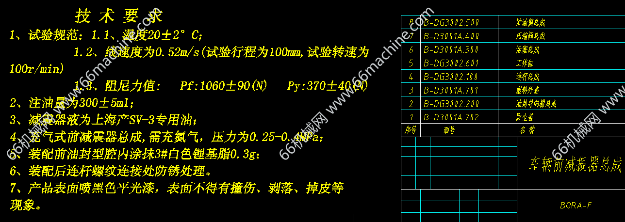 技 术 要 求:1、试验规范:1.1、温度20±2°C; 1.2、线速度为0.52m/s(试验行程为100mm,试验转速为100r/min); 1.3、阻尼力值: Pf:1060±90(N) 、Py:370±40(N);2、注油量为300±5ml;3、减震器液为上海产SV-3专用油;4、充气式前减震器总成,需充氮气,压力为0.25-0.4MPa;5、装配前油封型腔内涂抹3#白色锂基脂0.3g;6、装配后连杆螺纹连接处防锈处理;7、产品表面喷黑色平光漆,表面不得有撞伤、剥落、掉皮等现象。