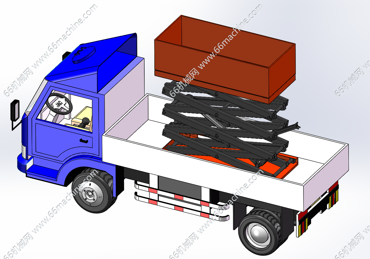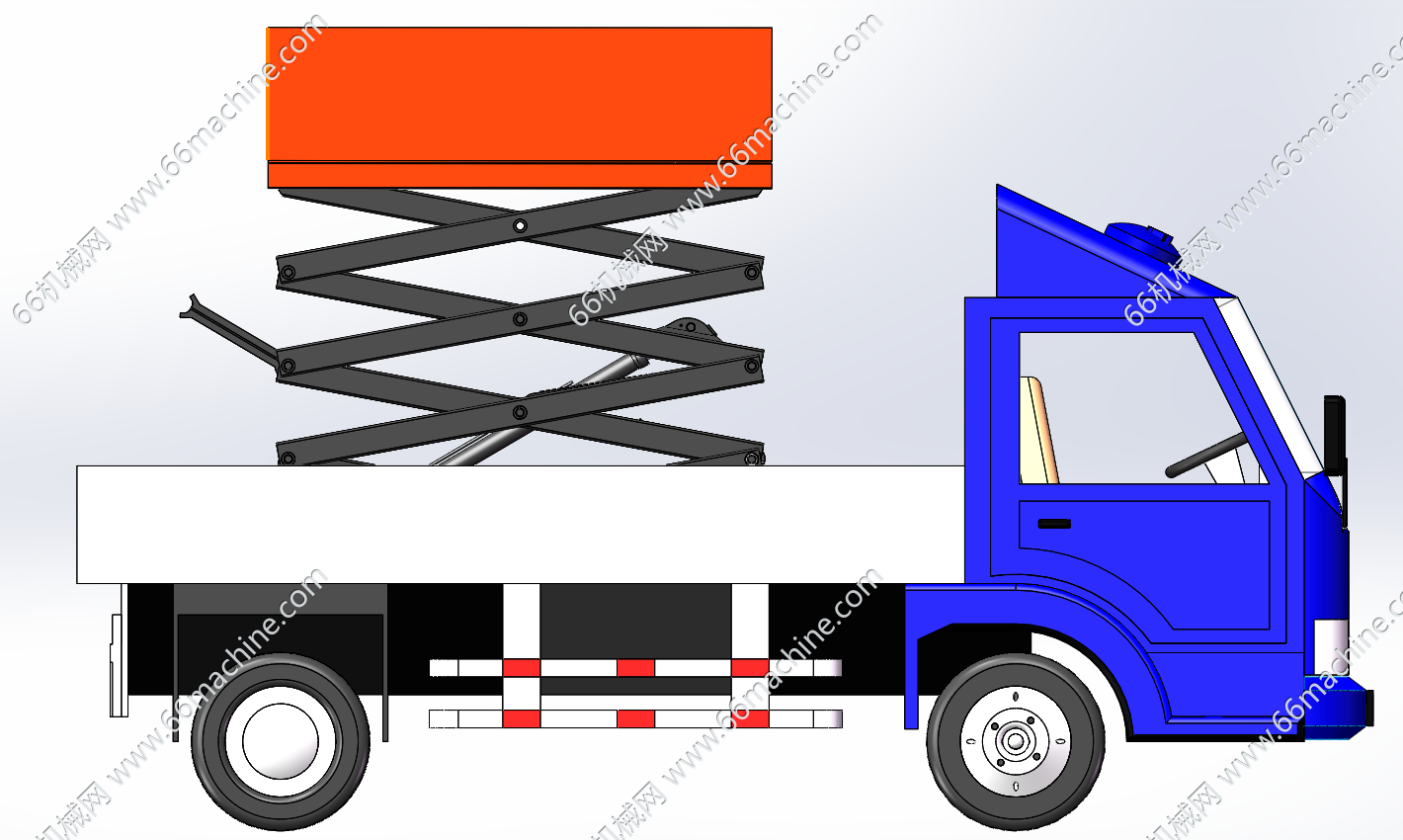 本模型为车载剪叉式登高平台(液压剪叉升降机),一种可移动式高空作业设备,适合长距离快速就位式作业。采用轻量化臂架设计,作业范围大,轻巧灵活,作业效率高。用于电力线路的检修、维护,路灯安装、维修和更换等工作。