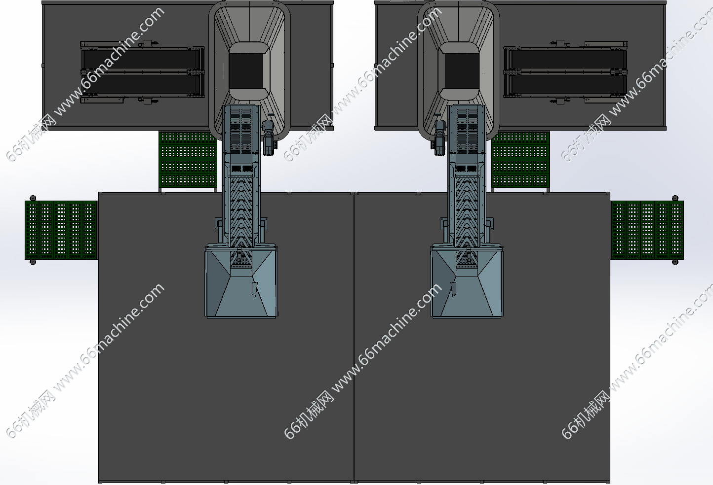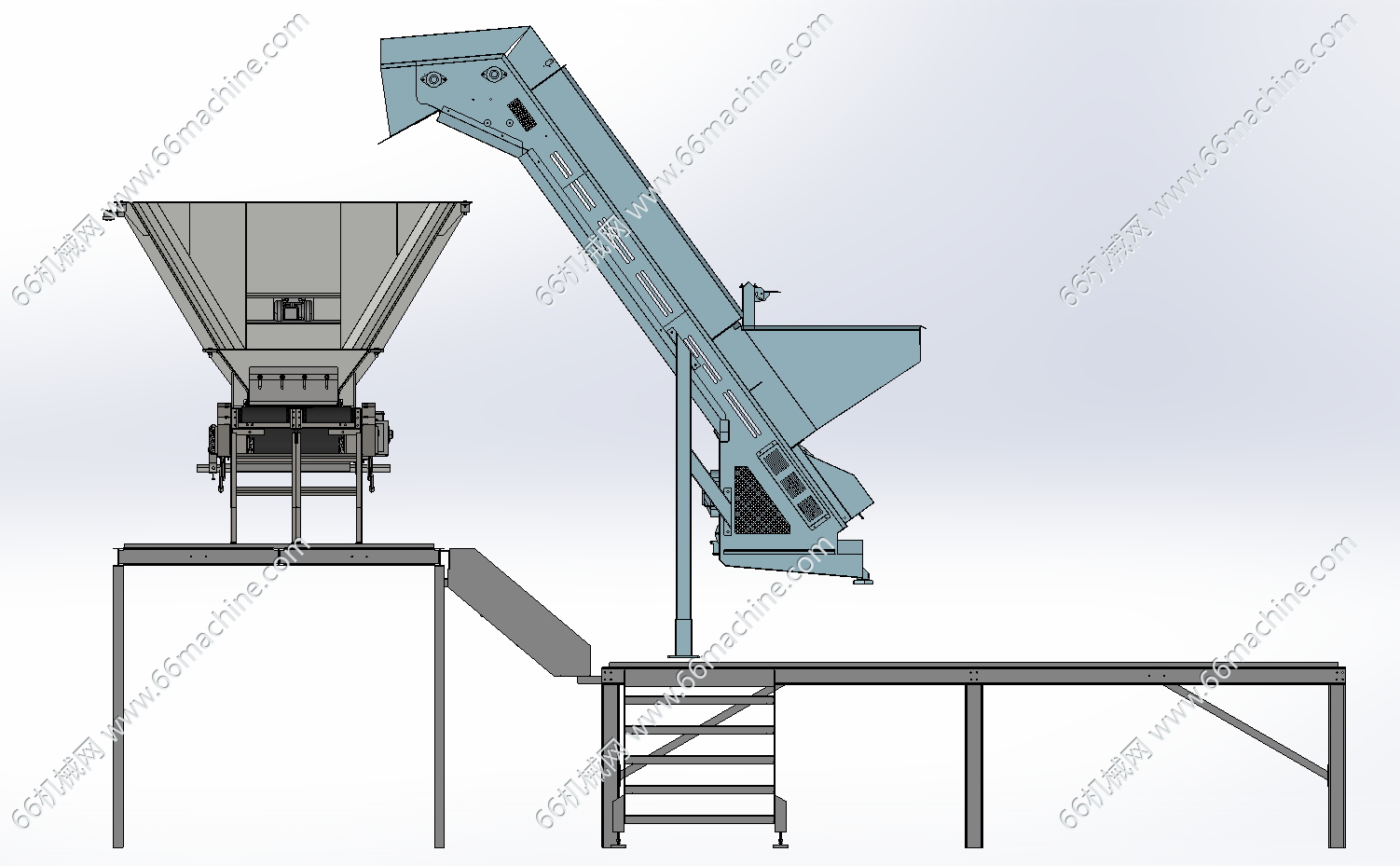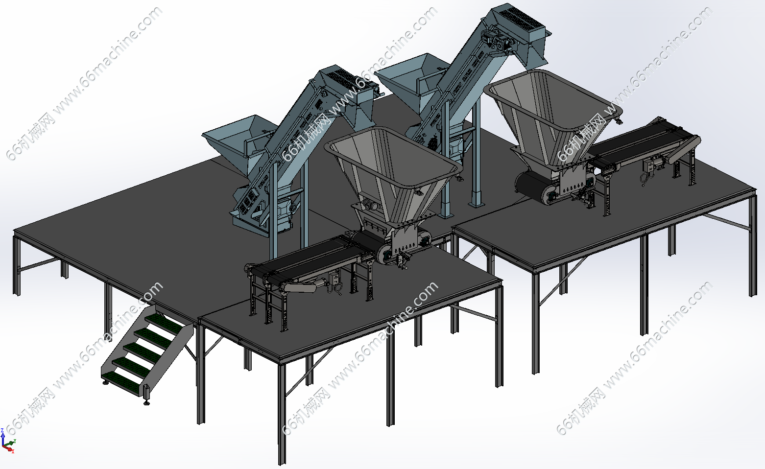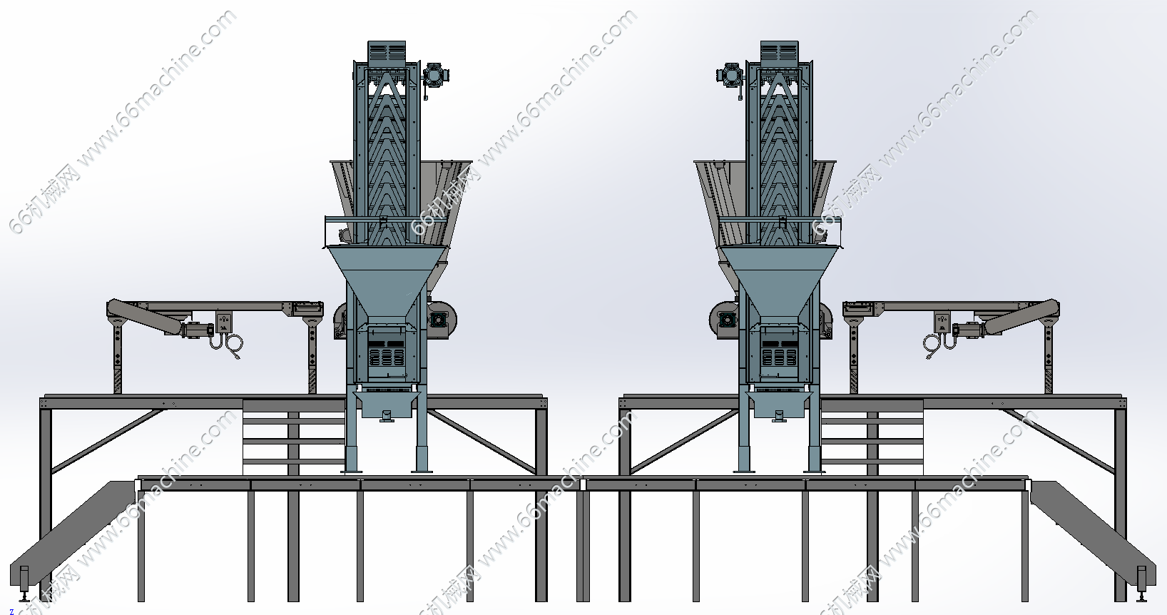 本模型为谷物提升上料及输送,包含钢构平台、提升输送机、水平皮带输送线,可应用于粮食仓储等散料处理场景,可现散料的自动上料、输送,能持续将散料从存储区域转运至处理环节。