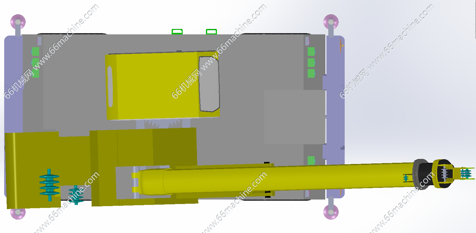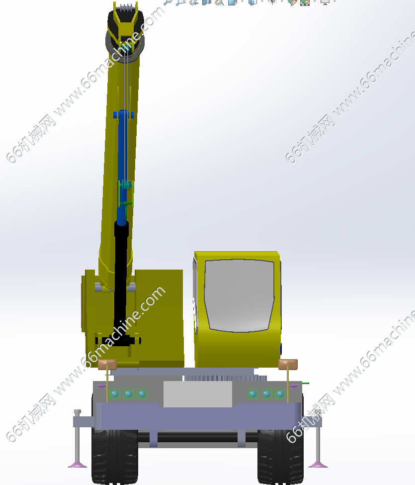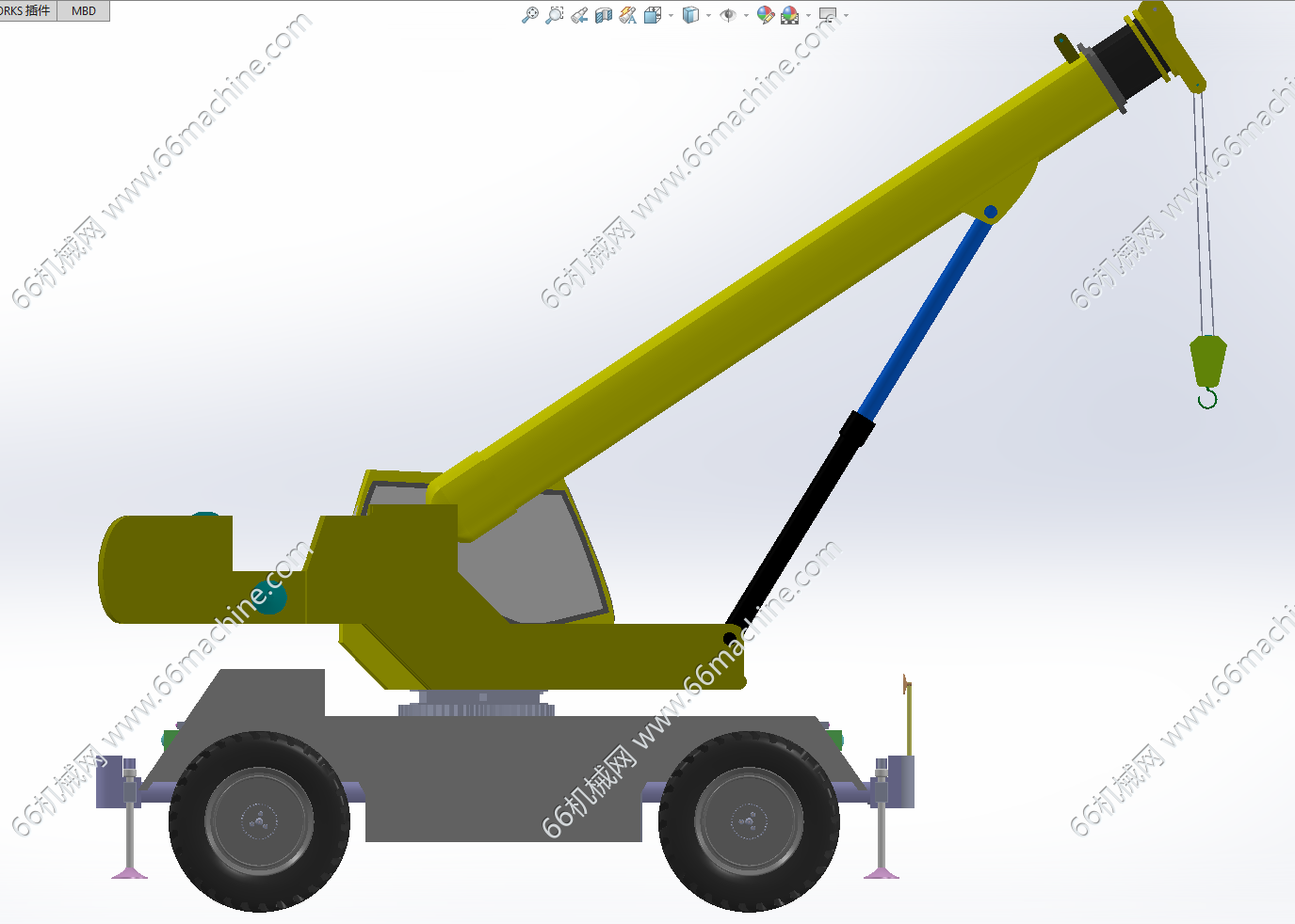 本模型为轮式起重机,4个螺杆式支腿可用来调平起重平台,液压油缸用来调节起重臂的高度,上装部分布置了驾驶仓的位置,起重臂上有可调节吊钩,具有机动性强的特点,适用于各种起重作业,如建筑物的吊装、设备安装等。