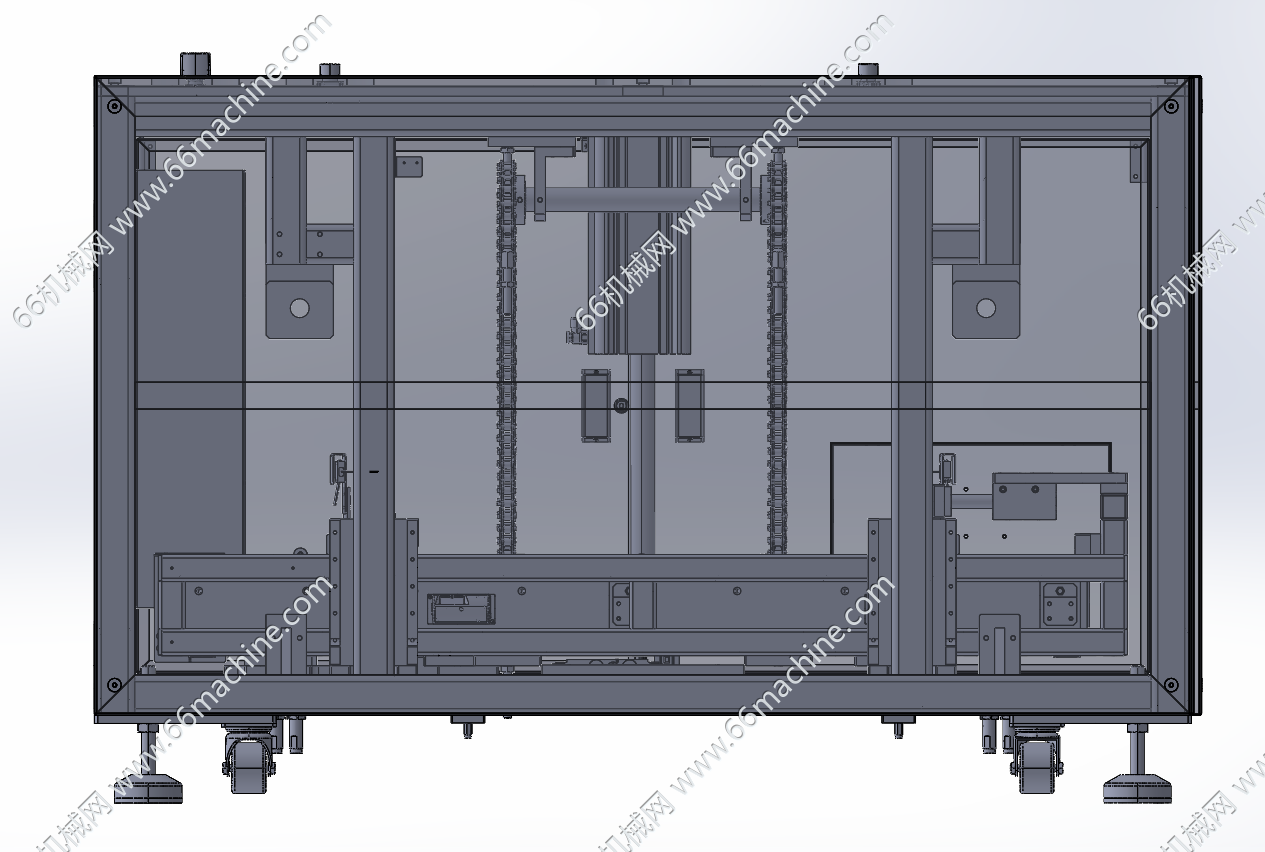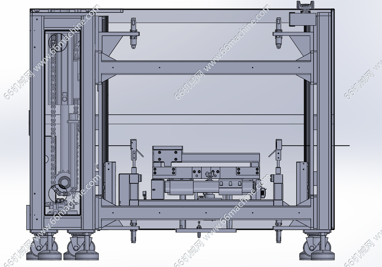 本模型为滚筒线提升机(升降机),采用液压缸+链条驱动滚筒线沿着滑轨实现升降动作,实现物料托盘/料箱的垂直升降与水平对接,广泛用于电商仓储、电子厂等。