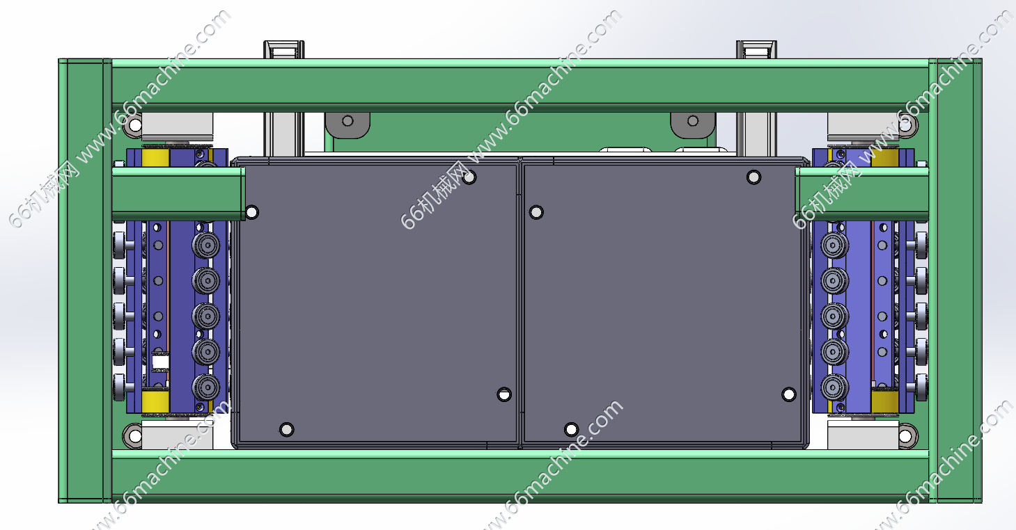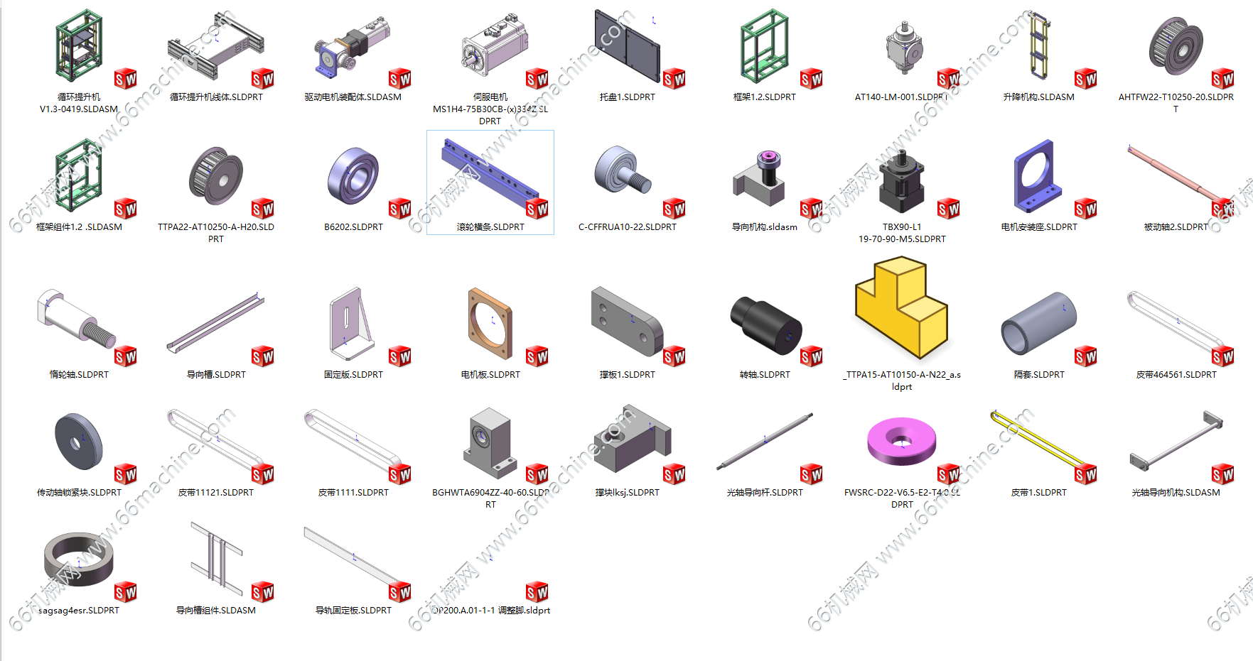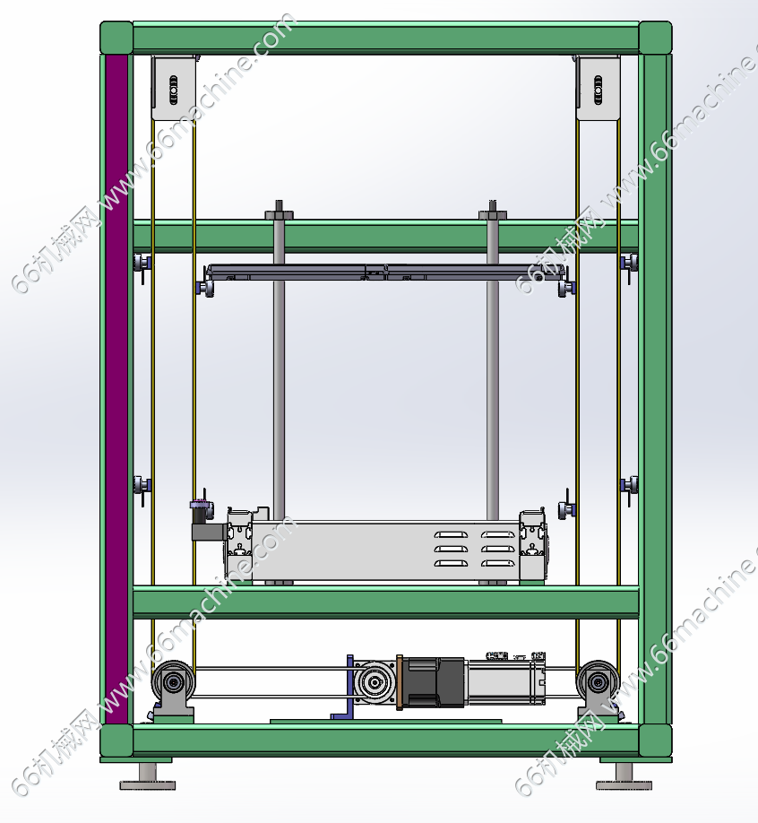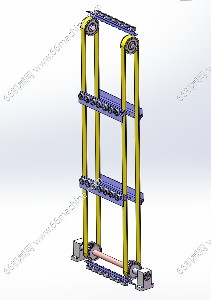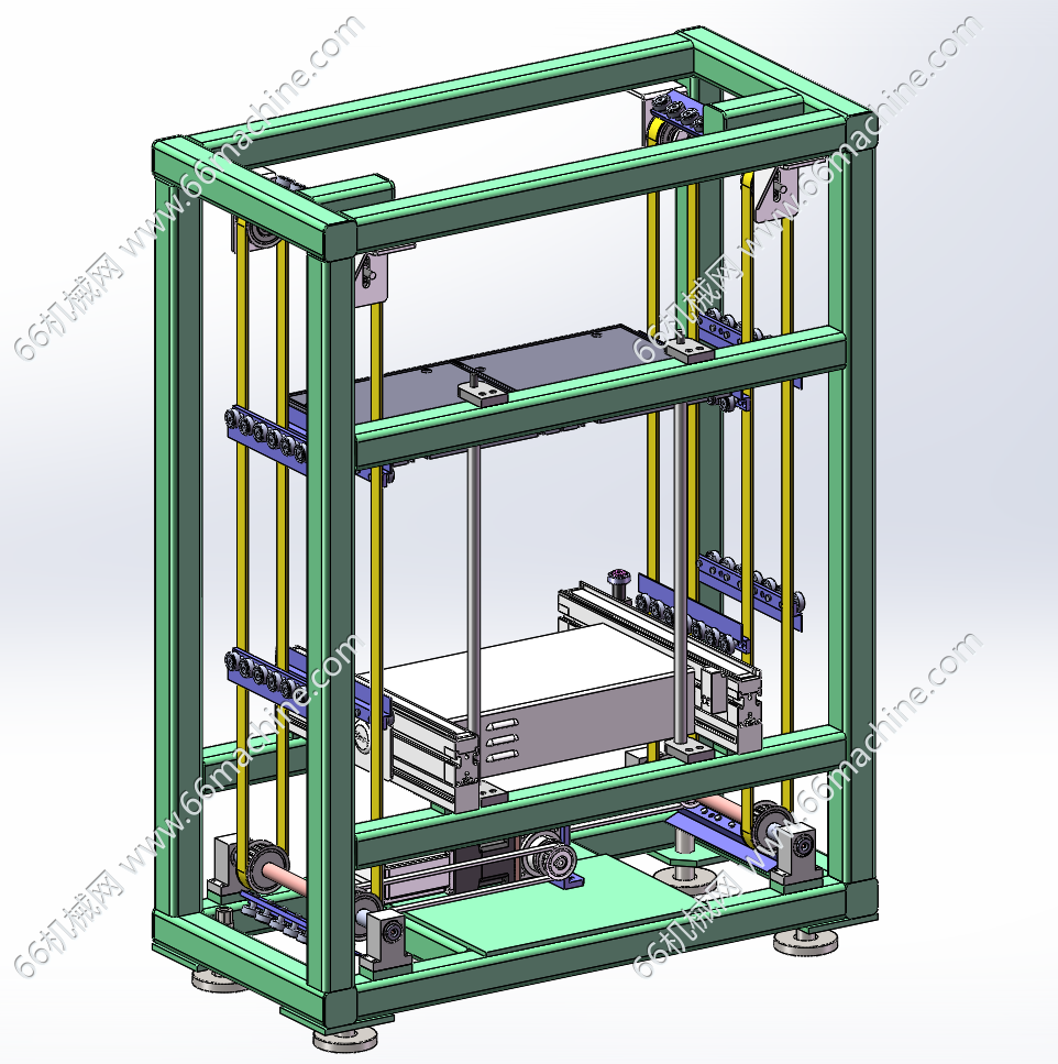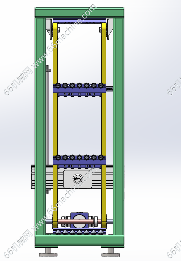 本模型为循环提升机(升降机),主要应用于箱式元件的提升输送,连续式提升机的工作原理是利用四根闭合的同步带传动,同步带带动承载板完成进箱、升降、出箱和回程四个重复循环的步骤,进箱入口配有进箱自动控制滚筒输送线,用于配合升降主机间歇性进箱。