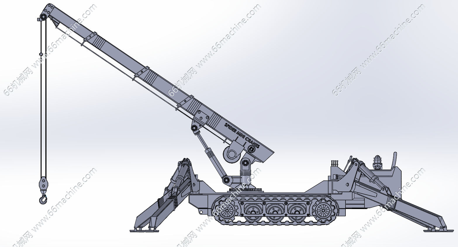 本模型为履带式起重机,包含履带底盘、液压支腿、驾驶仓、起重机构等。履带底盘主要是4轮一带,液压支腿主要由油缸调节支腿的伸缩,广泛用于港口、工厂、工地等地的起吊作业!