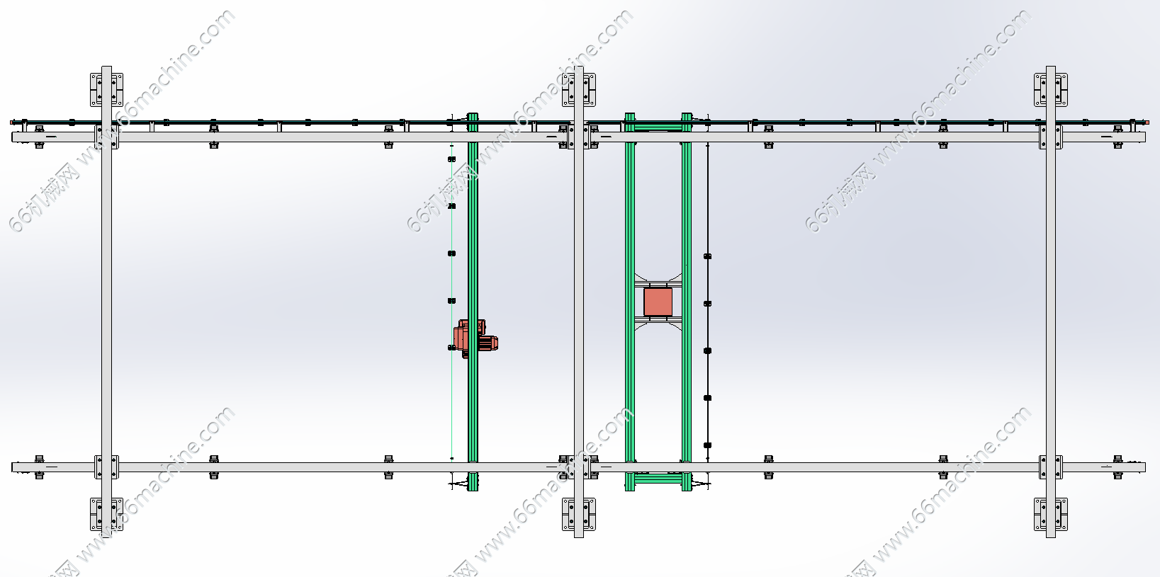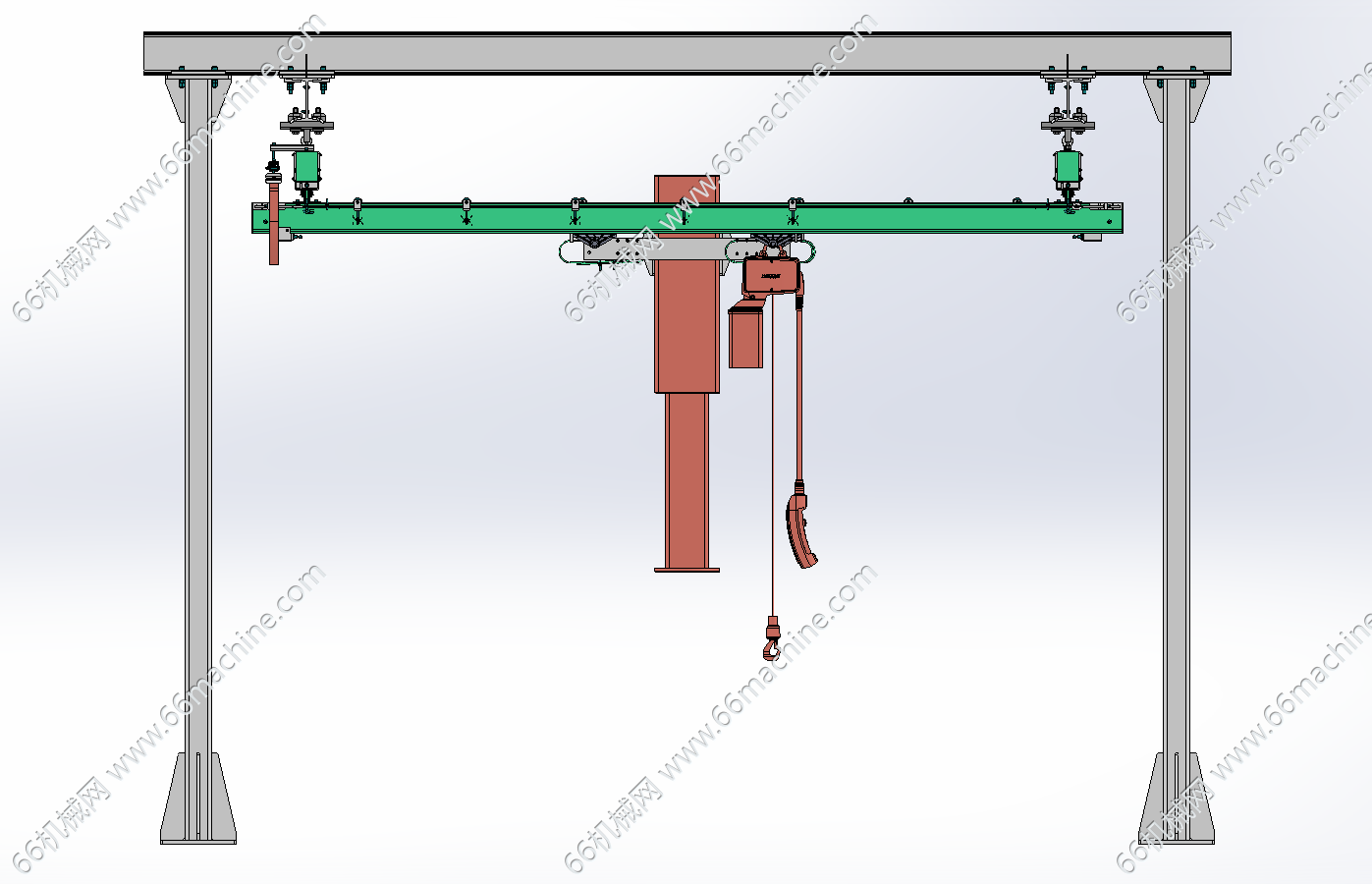本模型为KBK龙门桁架起重机,使用KBK标准轨道组件搭建而成的、可在地面支撑的龙门式起重机结构。它通常由两根平行的主梁(由KBK轨道构成)和两端的可移动支腿组成,形成一个可在指定长方形区域(X和Y方向)内自由移动的起重平台。