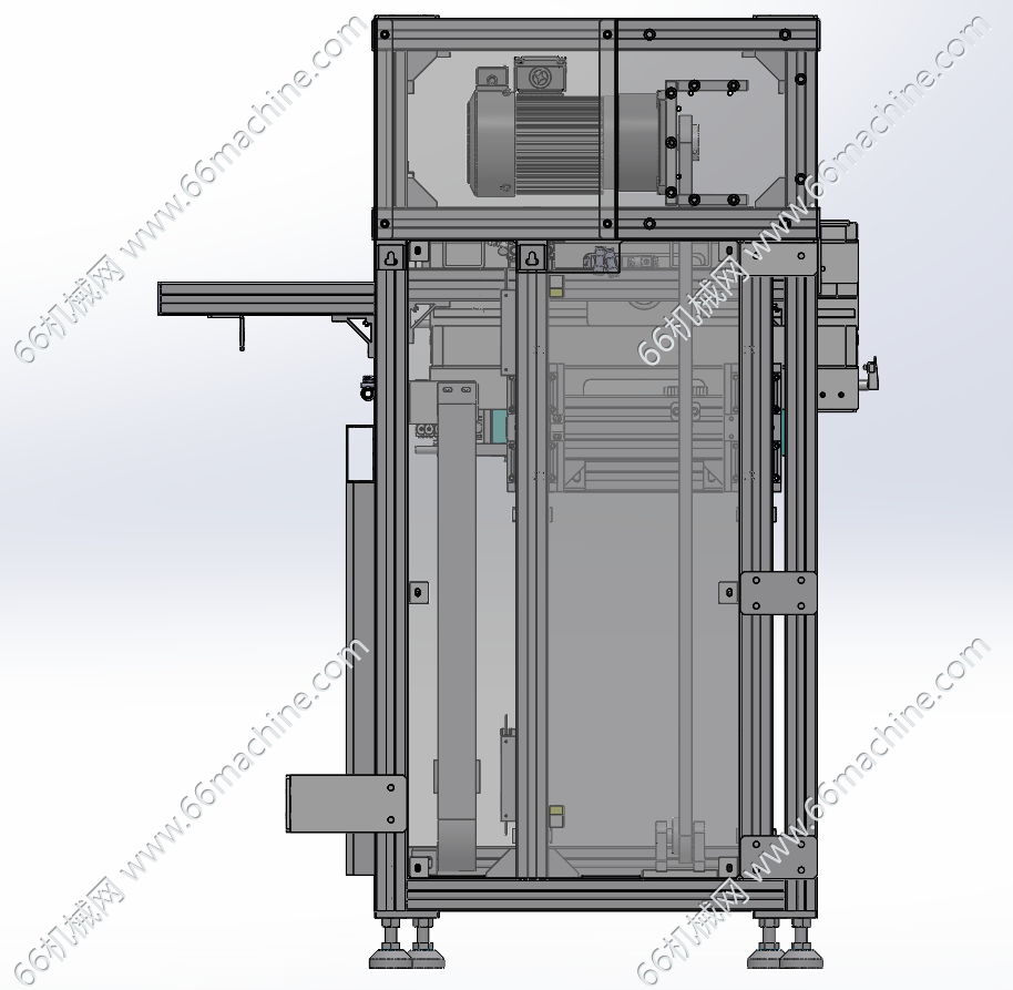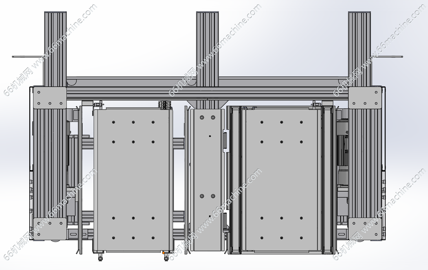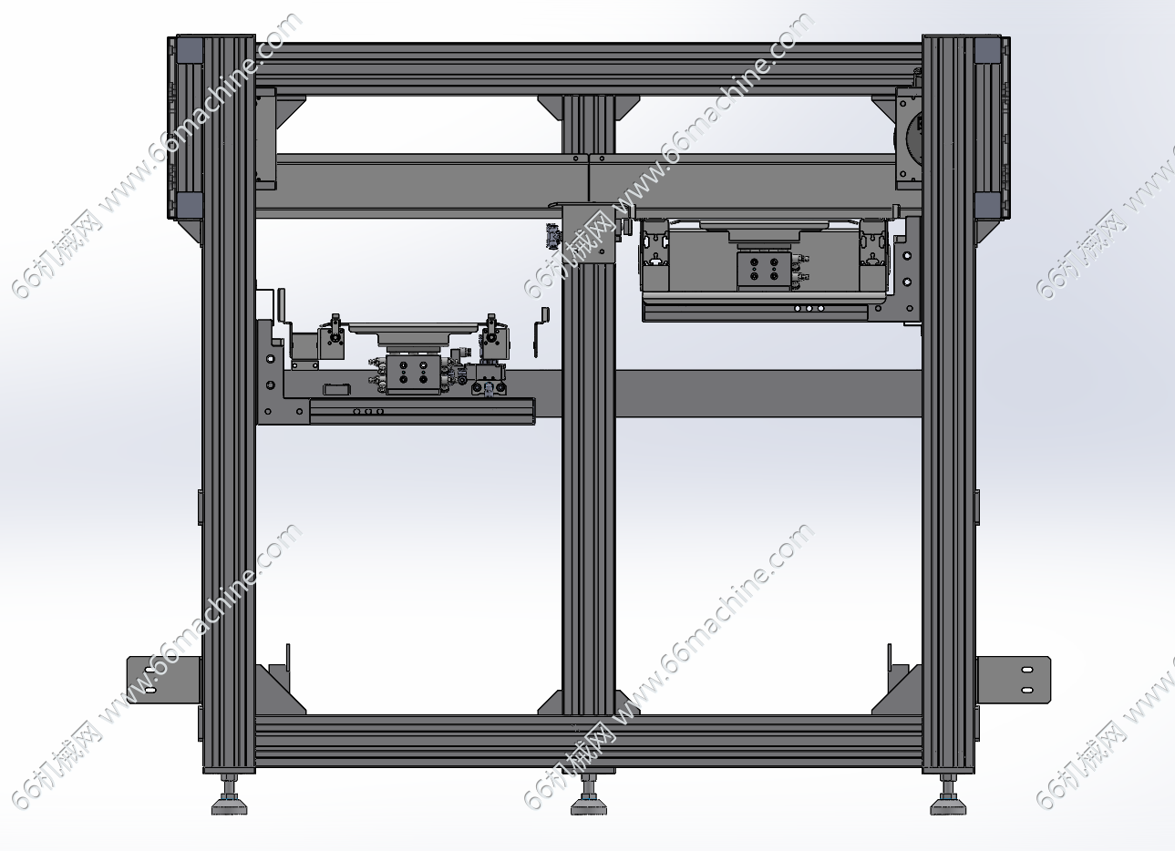 本模型为双工位升降机(提升机),由工业铝型材构成稳定的支撑框架,底部配备可调脚杯以实现水平调节与减震。升降采用电机+链轮+链条结构,带动两组载物平台沿垂直导轨做往复升降运动,可实现上下层物料的高效流转与工位切换。