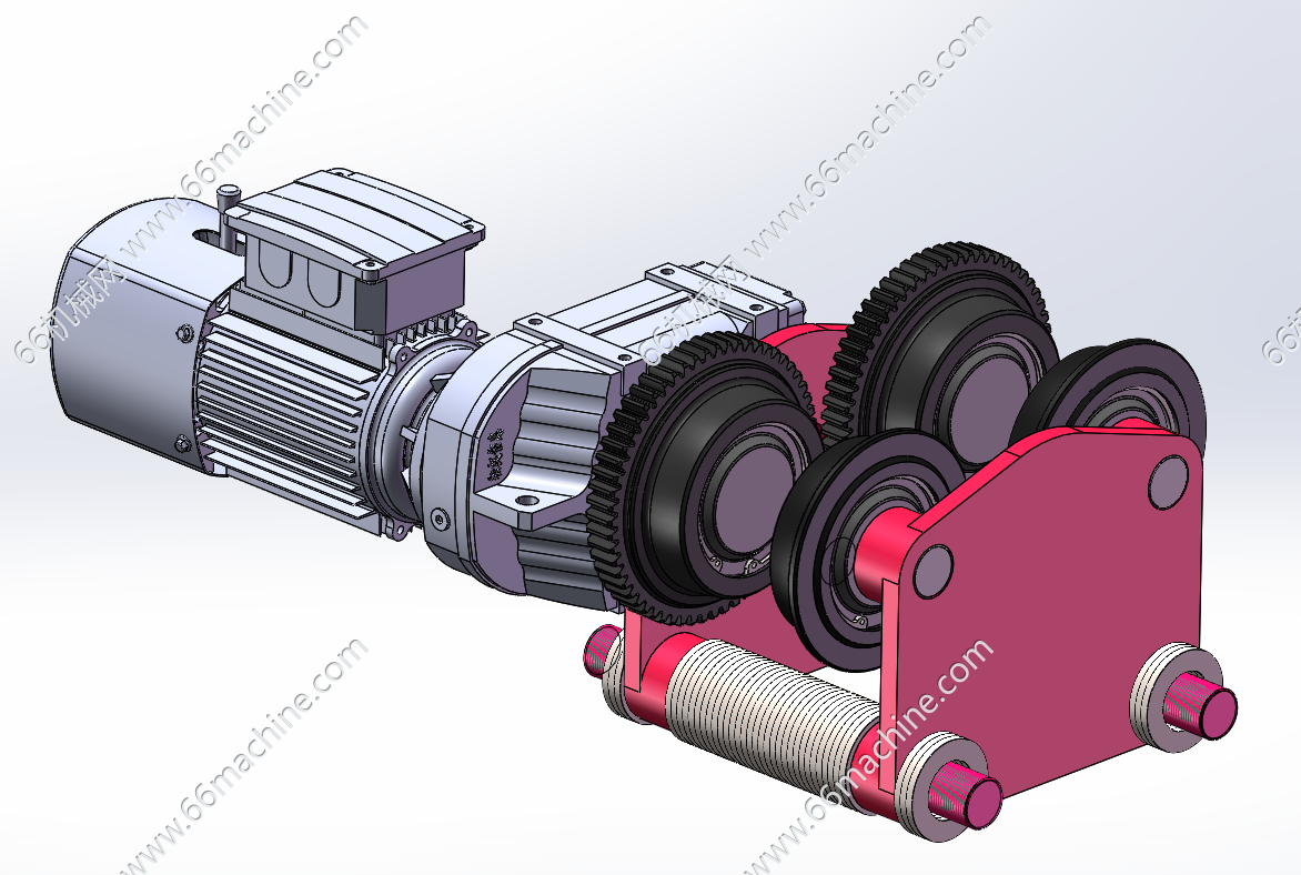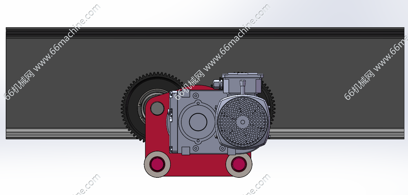 本模型为电动葫芦上导轨行走驱动模组,是电动葫芦的重要组成部分,电机经过变速后将动力传递给行走轮,行走轮在工字型导轨上滚动,带动电动葫芦沿导轨移动,实现重物的水平搬运。