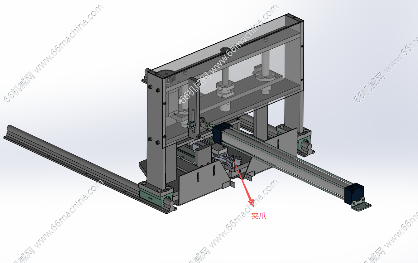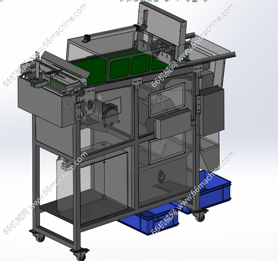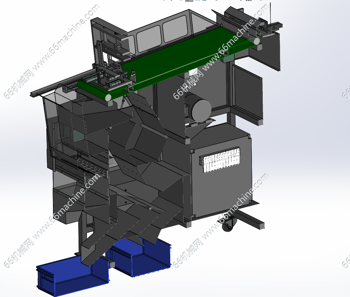 本模型为自动摘料分选机,主要由皮带线、气动夹取移送模组、三条流道组成,夹取移送机构可将皮带线上的产品进行挑选后放置到不同的流道流出,欢迎参考!