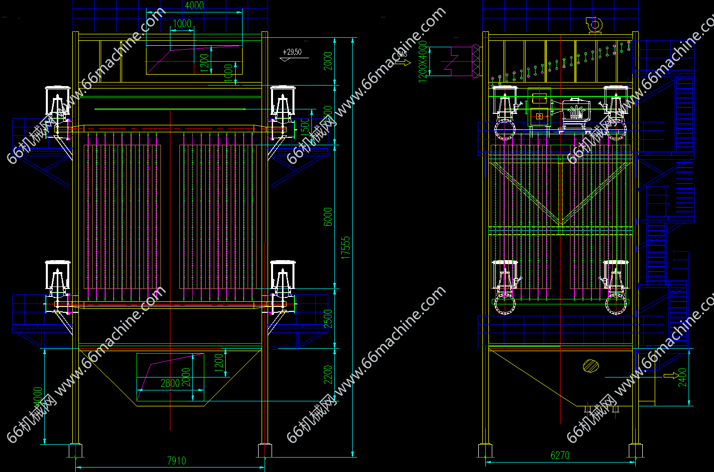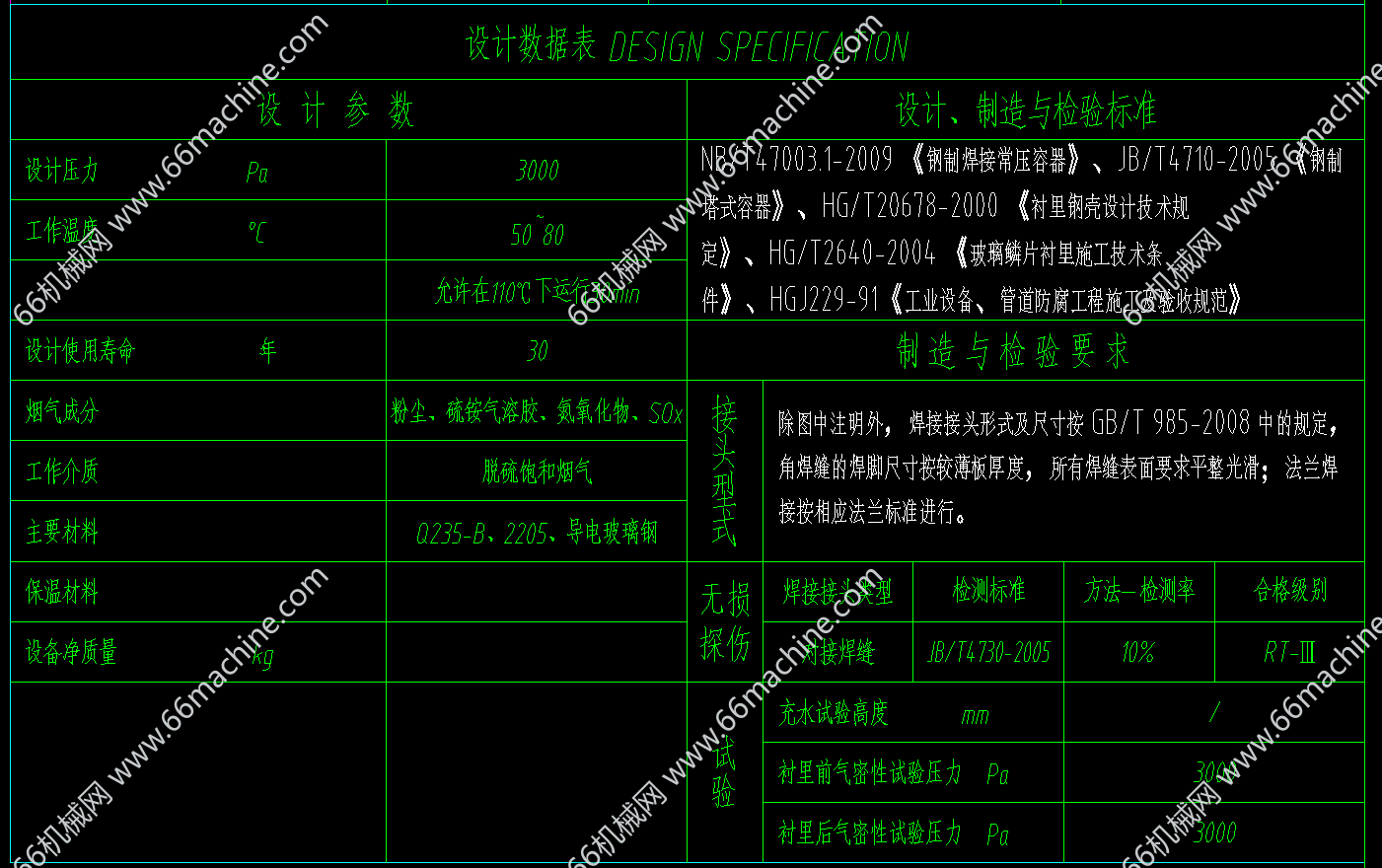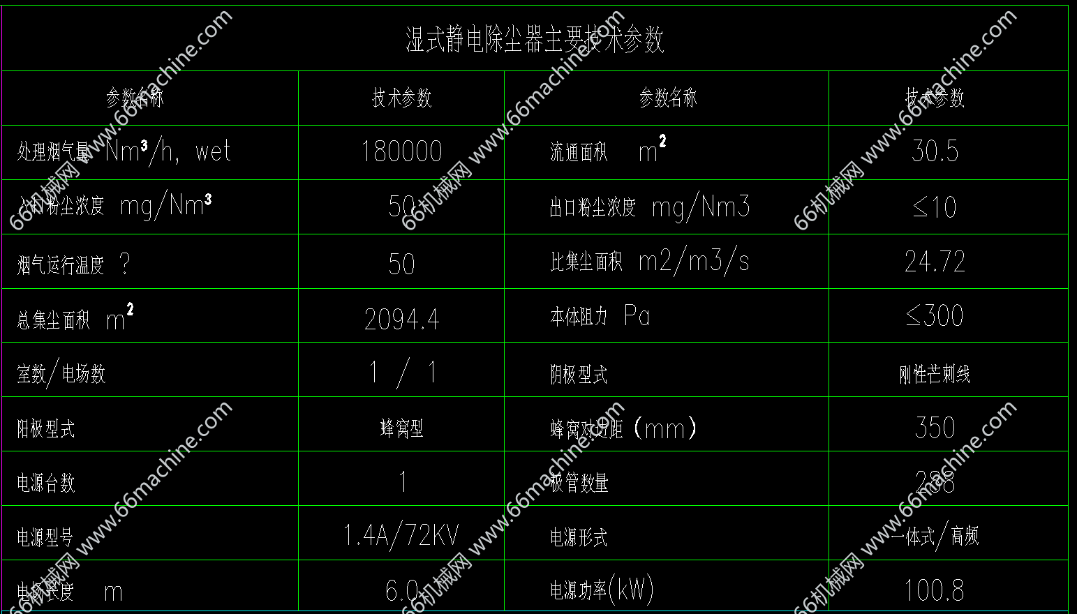 本图纸为湿式静电电除尘器WESP30,处理烟气量18万(标况),工况21.3万。流通面积30.5,极管数量288根,电源型号1.4A/72KVA,总积尘面积2094.4平米,阳极型式蜂窝式。蜂窝对边距350,欢迎参考!