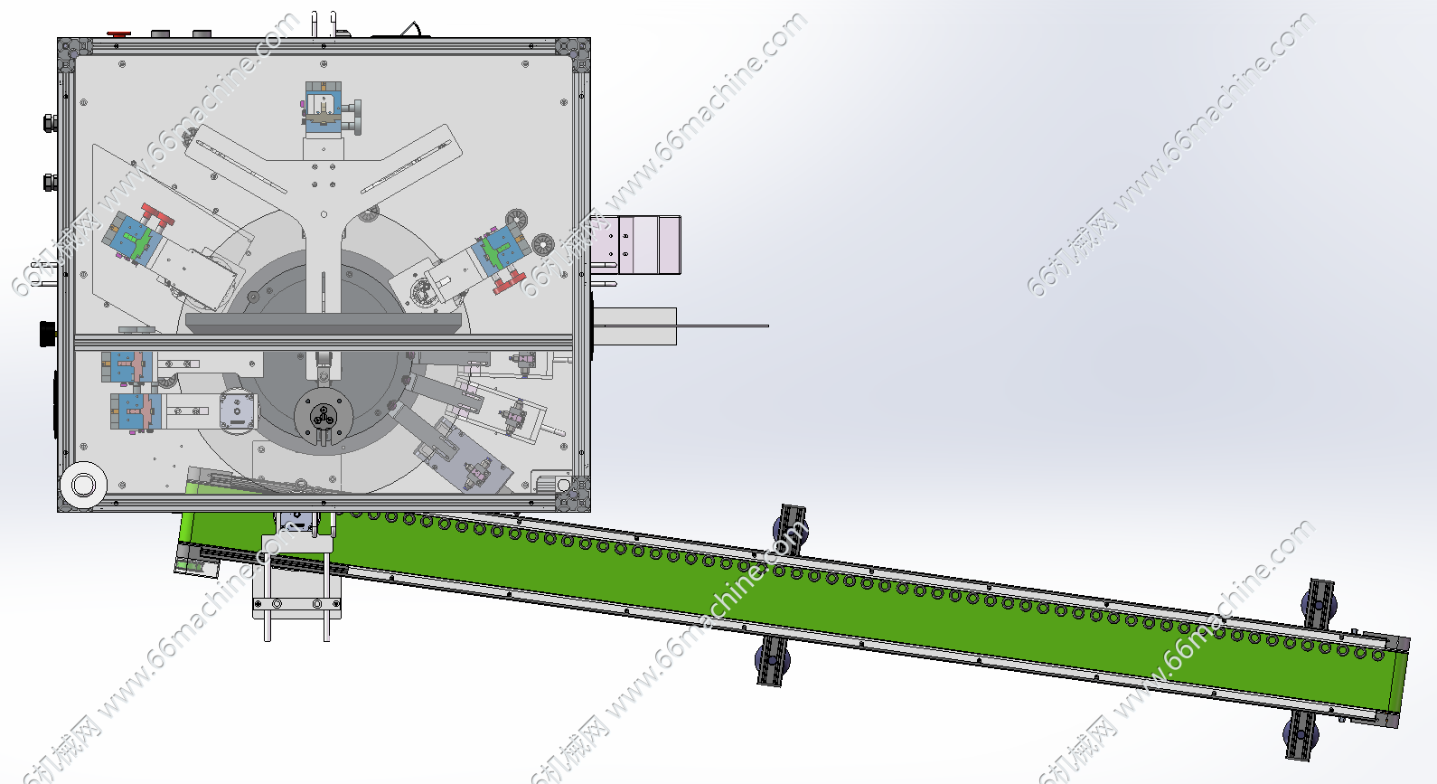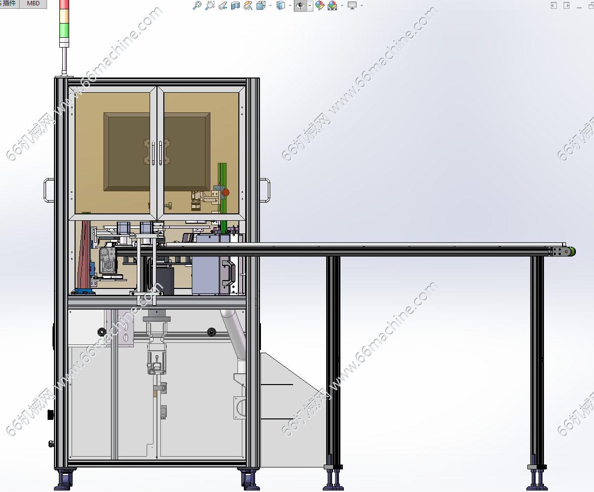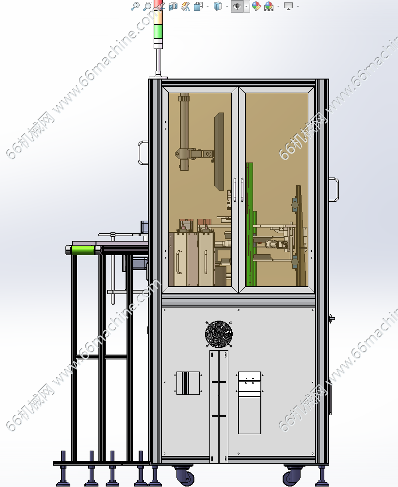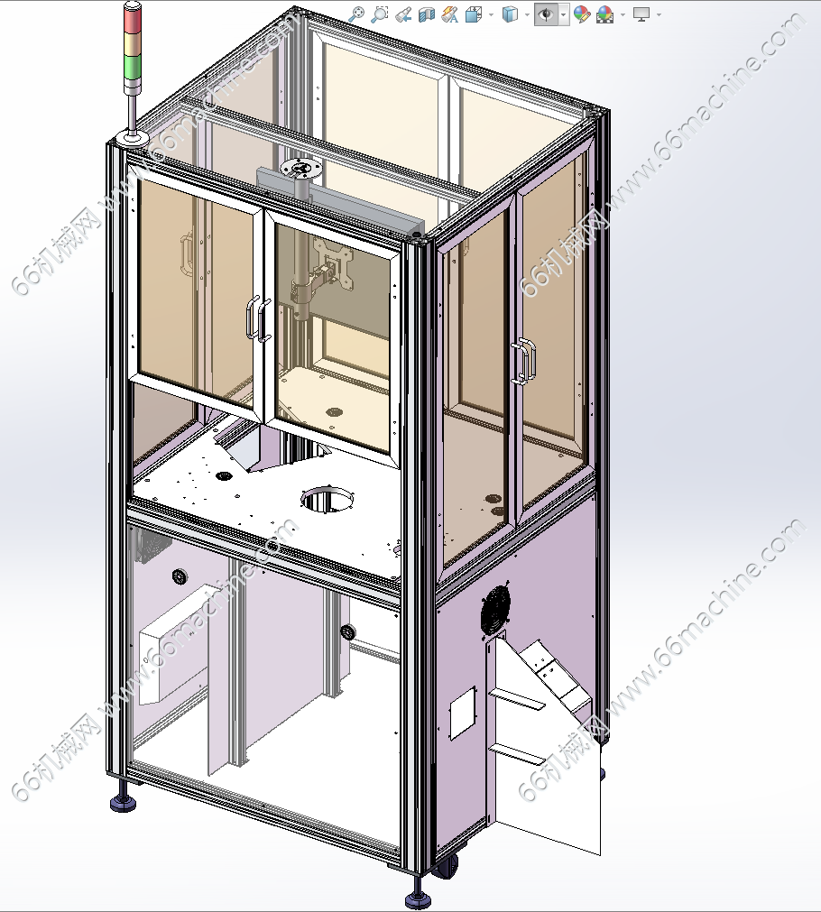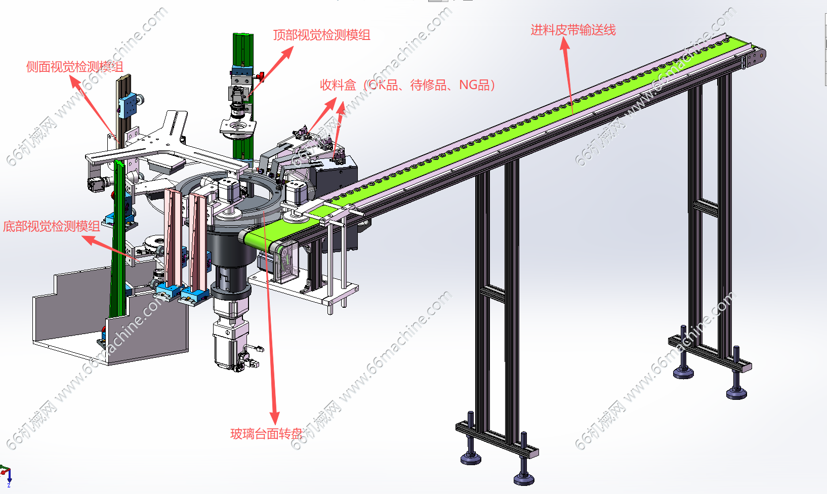 本模型为某企业O型圈视觉自动筛选机(分选机、分拣机),主要由下机架、机罩、进料皮带输送线、顶部视觉检测模组、侧面视觉检测模组、底部视觉检测模组、玻璃台面转盘及3种带吹气的收料盒(OK品、待修品、NG品),本设备用于O型圈的外观检测及分选,也适用于其它小件产品的外观检测及分选,可供大家参考!