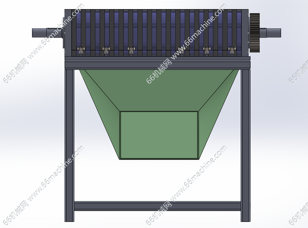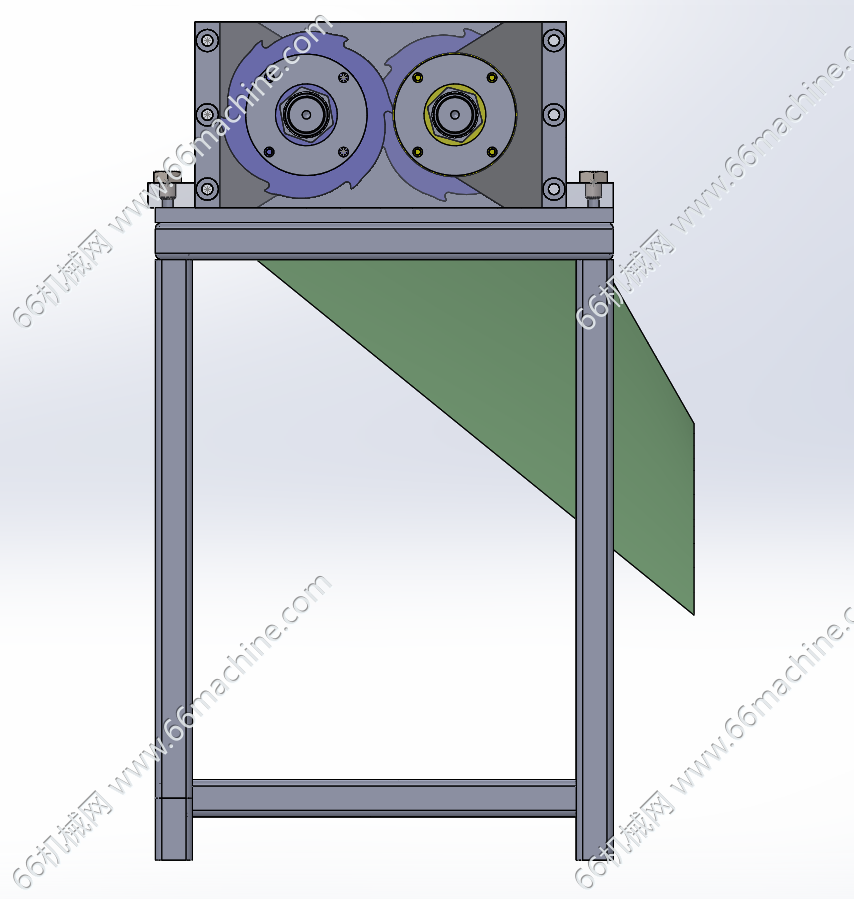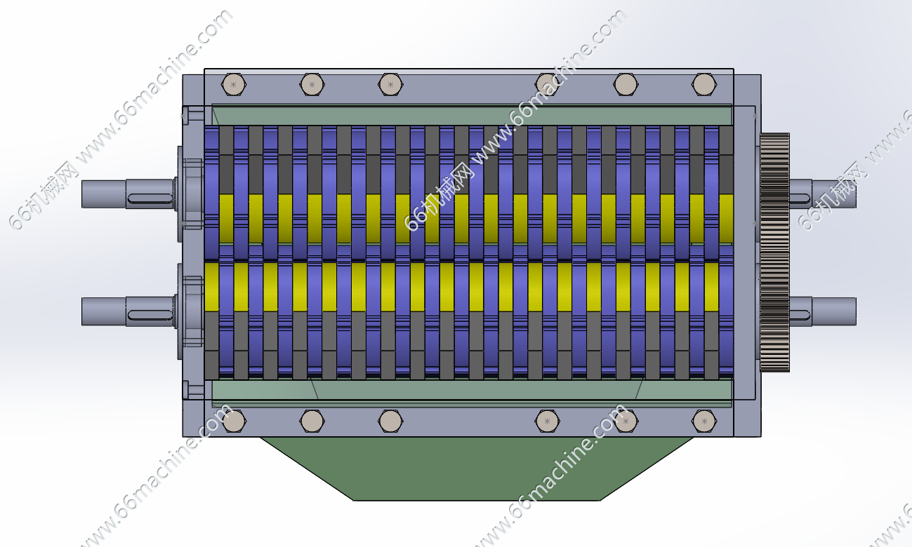 本模型为塑料双轴粉碎机(双轴破碎机、碎纸机),该组件包括切削刀、轴、轴承、外壳、车架、料斗,适用于纸张、塑料、光盘、电子垃圾等韧物件的粉碎!