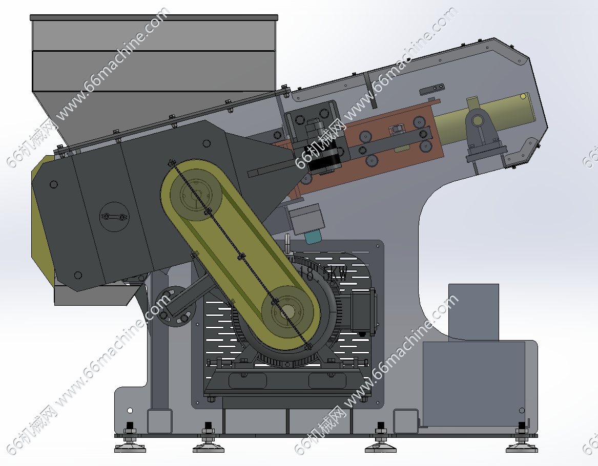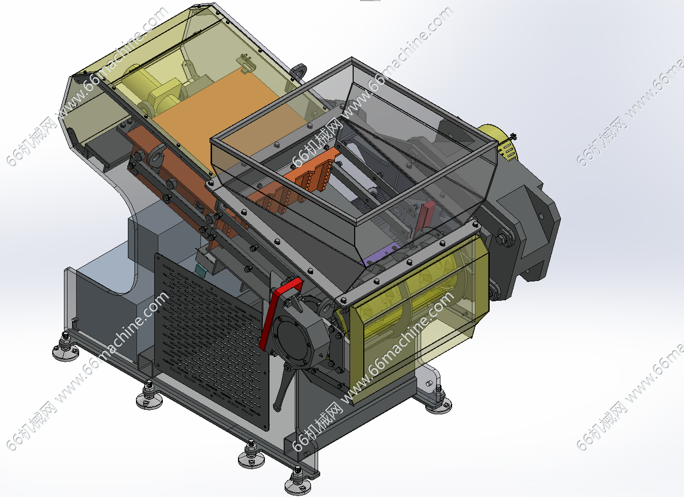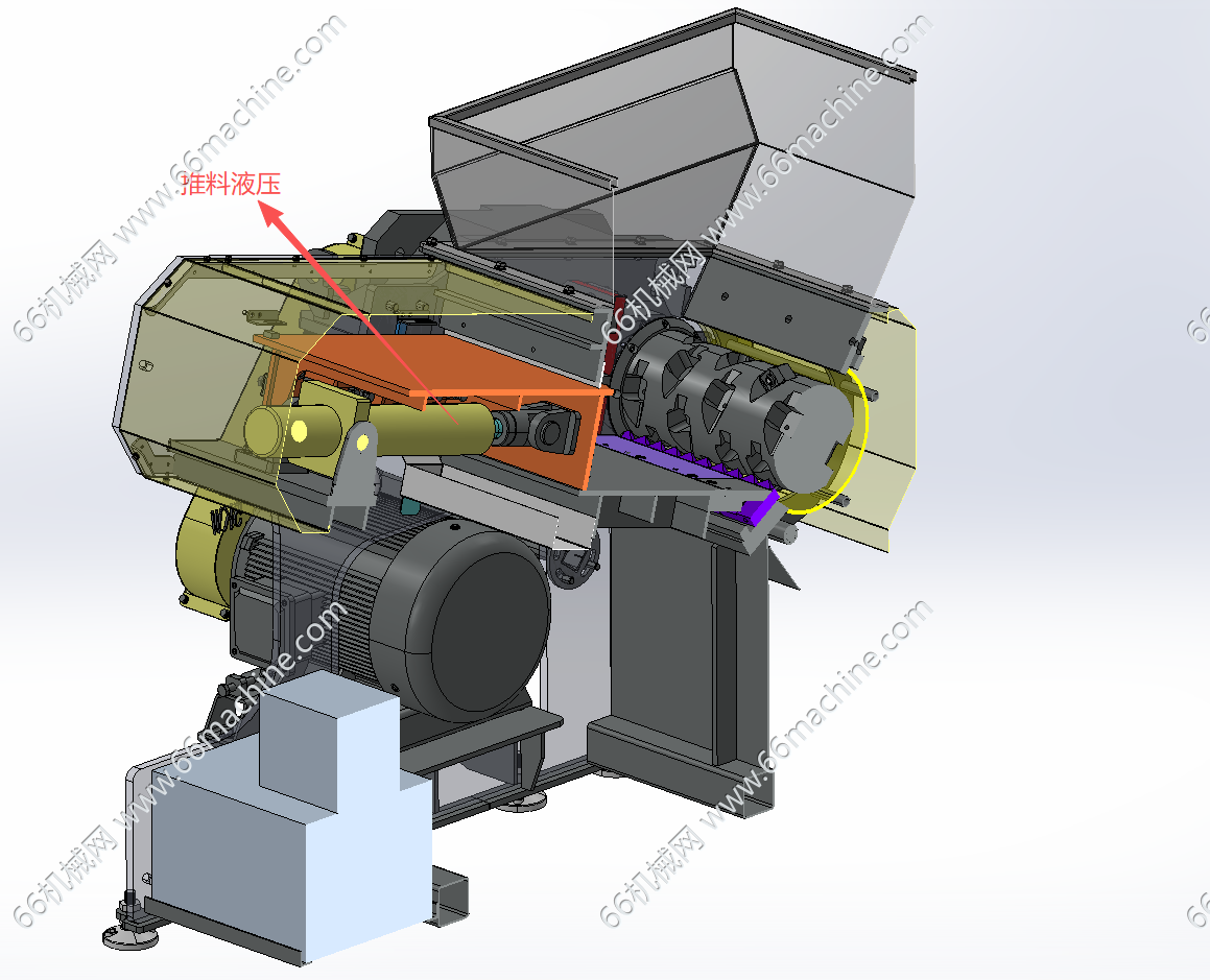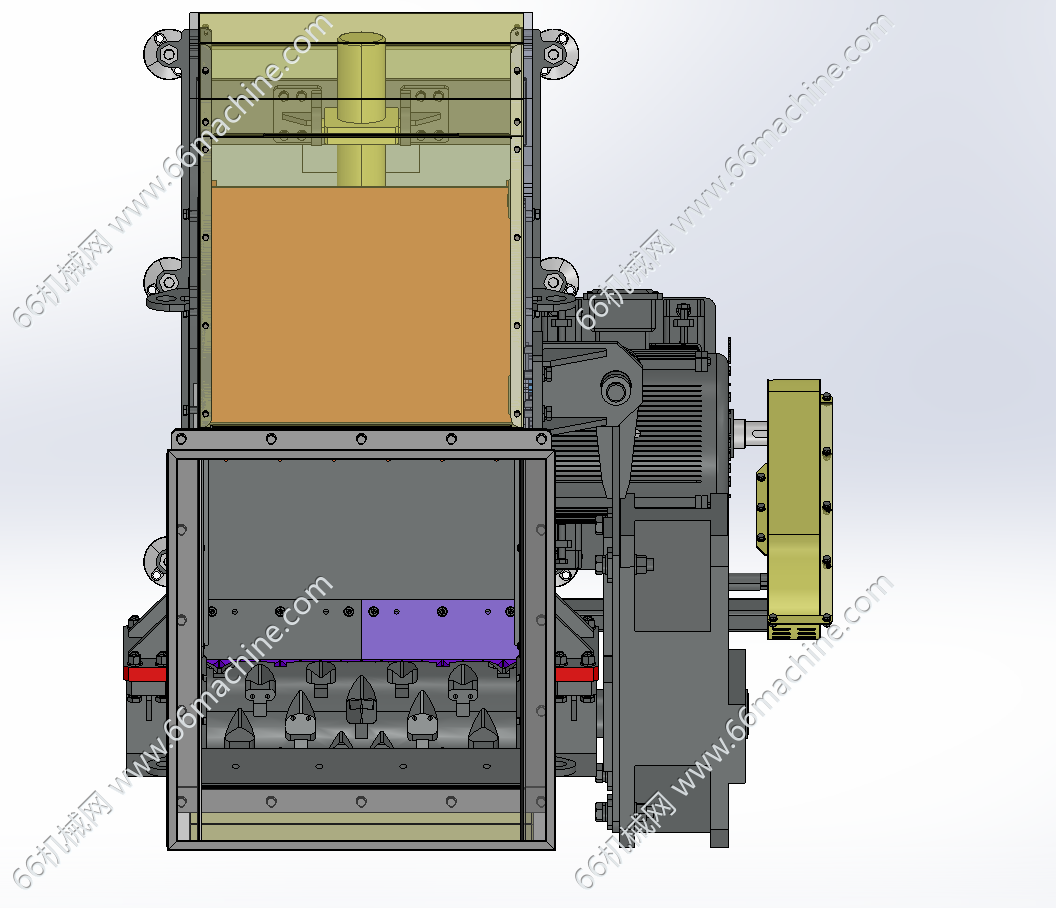 本模型为单轴破碎机(粉碎机),电机经过带传动将动力经过变速箱变速后输出至刀辊。该设备用于固废回收,可用于撕碎/破碎塑料、木材、金属、工业废料等物料。