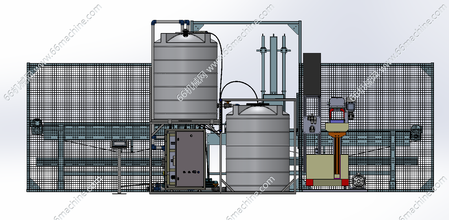 本模型为自动化液体灌装生产线,液体以饮品为例。饮料生产过程中,输送装置可将空的饮料瓶有序输送至灌装区域。旁边的储罐用于储存饮料原液,通过管道等系统,能将原液精准地灌装到输送过来的瓶中。