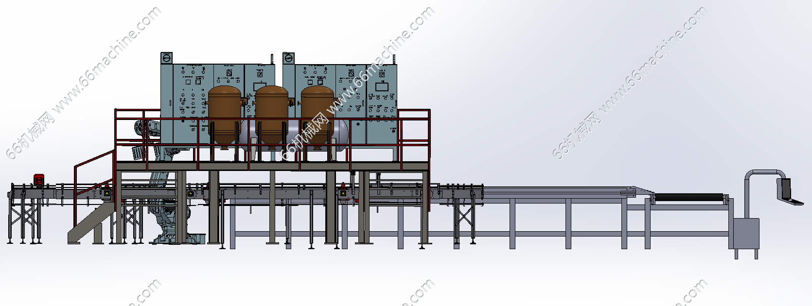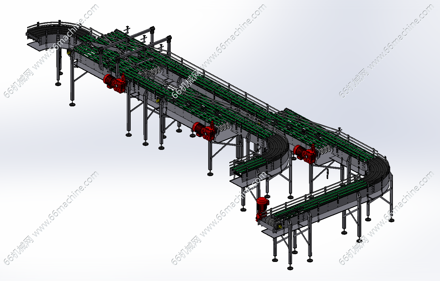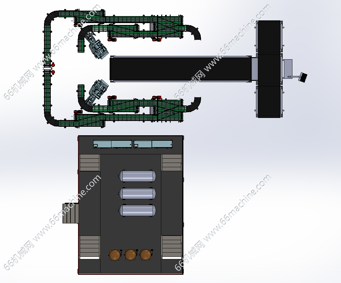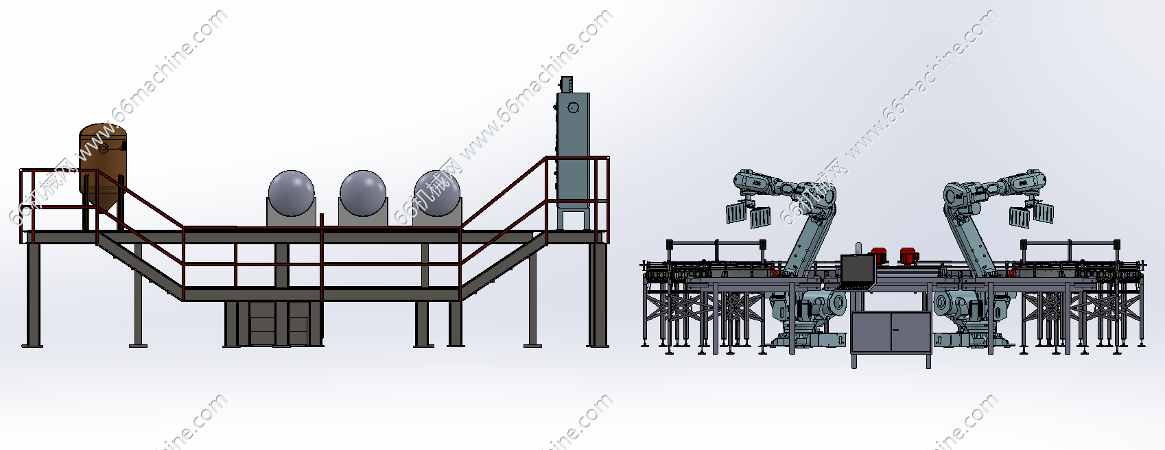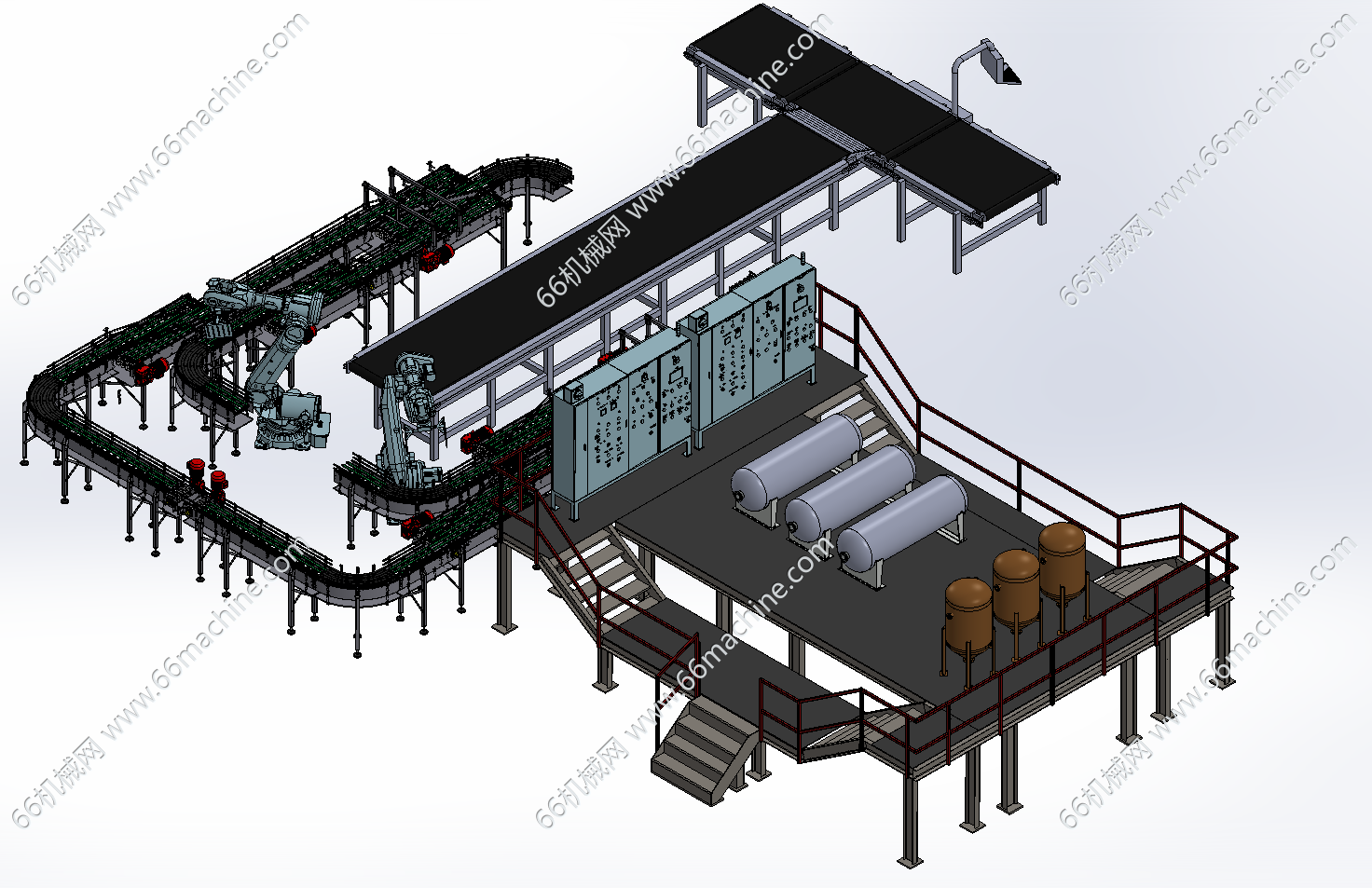 空瓶通过右侧复杂的绿色输送线系统流转,经过洗瓶、消毒环节,随后被输送至灌装区域。两台工业机器人精准协作,一台负责将合格的空瓶定位,另一台则完成饮料灌装与封盖操作。灌装完成的成品瓶再次通过输送线,被有序输送至末端的码垛区域,这里的传送带和分流装置会将瓶装饮料整理成垛,为后续的仓储、物流环节做好准备。