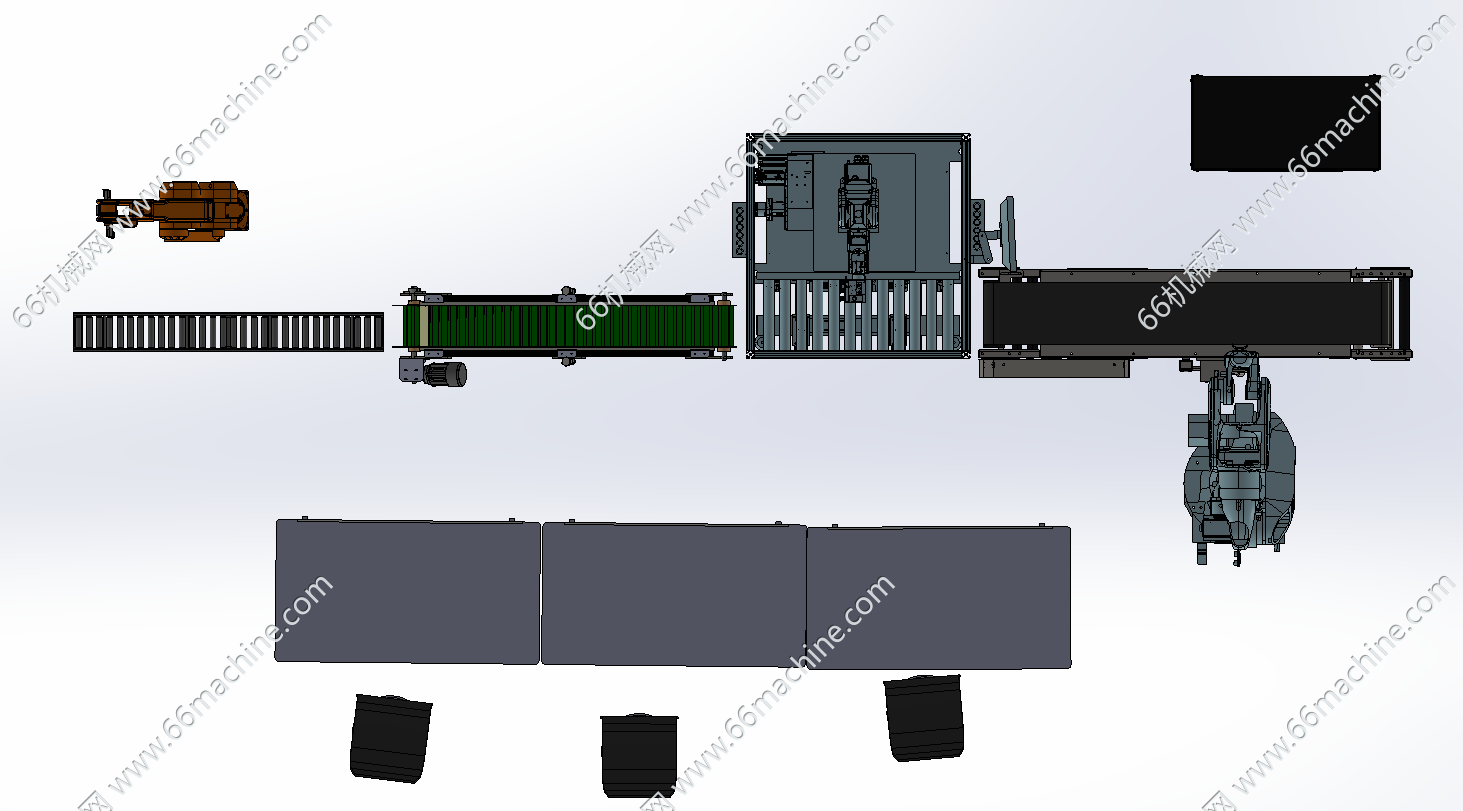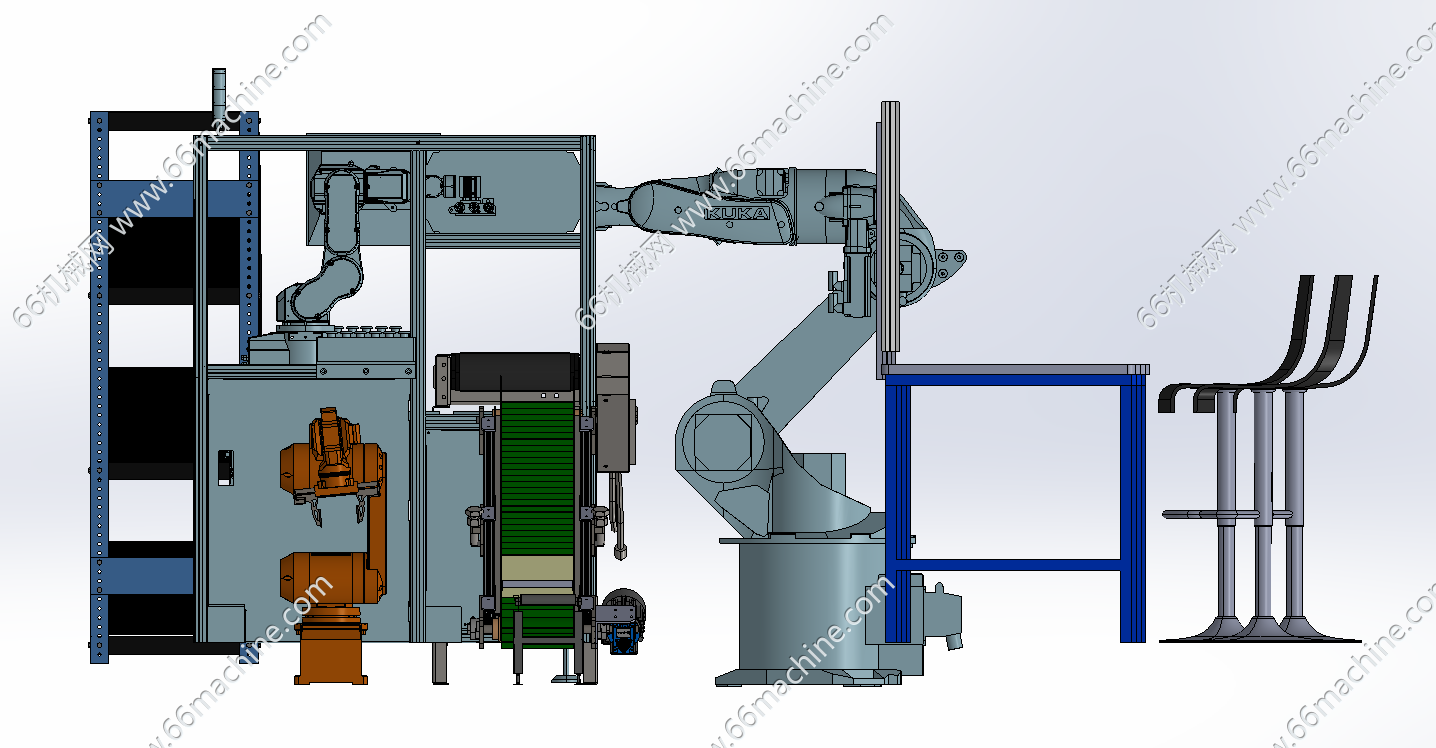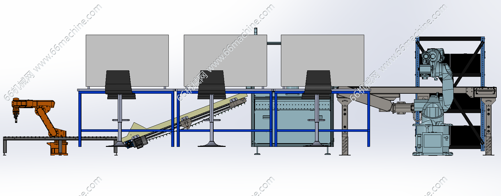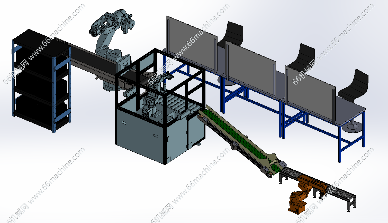 本模型为人机协作型自动化产线,适用于电子、轻工等行业的小批量多品种生产。工业机器人负责物料抓取、工序处理,输送线流转工件,人工工位可进行柔性化操作(如质检、装配),兼顾自动化效率与人工灵活性。