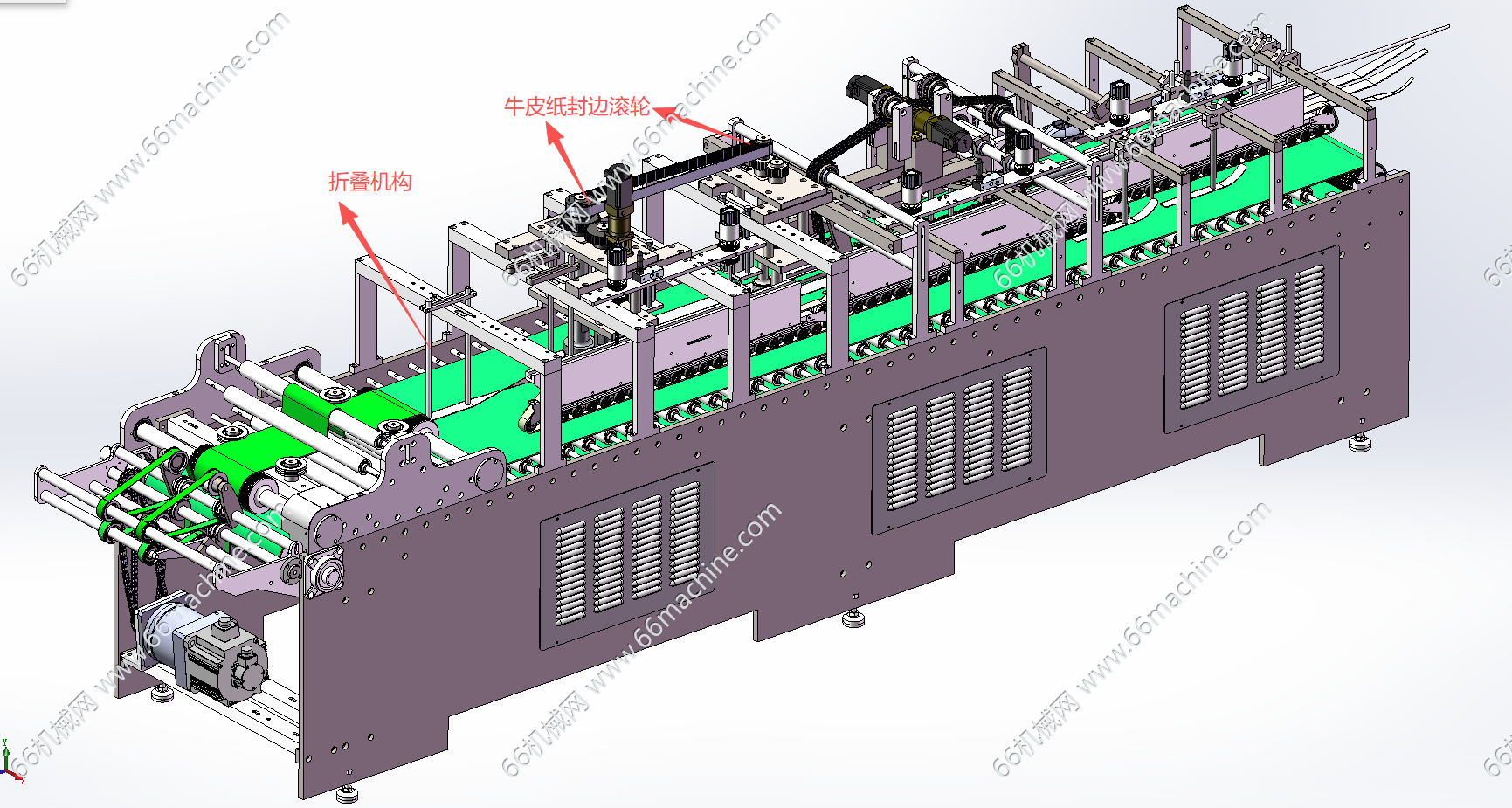 本模型为牛皮纸袋折叠、封边生产线,属于纸袋制袋后段核心设备,用于对牛皮纸包装袋(含多层牛皮纸袋、纸塑复合袋)的侧边/袋底进行自动涂胶、折叠、压实、封合,实现袋体的密封成型,替代人工封边工序,广泛应用于食品、化工、建材、饲料等行业的纸袋包装生产,仅供大家参考!