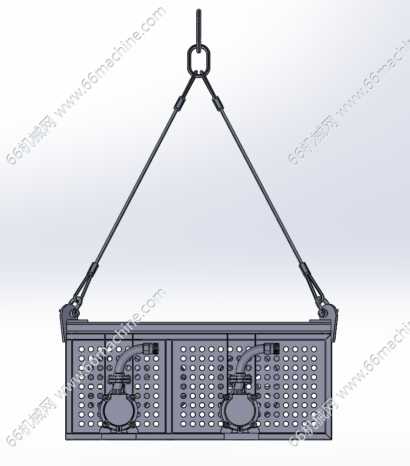 本模型为筛选式水流捕鱼装置,针对传统装置选择性差、网具维护难等问题,采用长方体框架内置第一、第二网箱(大过鱼孔分级、小出鱼孔排幼鱼)实现分层筛选;第二网箱外超声波换能器配合起重柱侧发生器自动清洁;设旋转吊臂、滑动绞车及多卸扣吊绳保障多自由度作业与升降稳定。兼具精准分级、自清洁及灵活机动特性,降低幼鱼误捕率,减少人工维护,适用于养殖或自然水域目标鱼高效起捕。