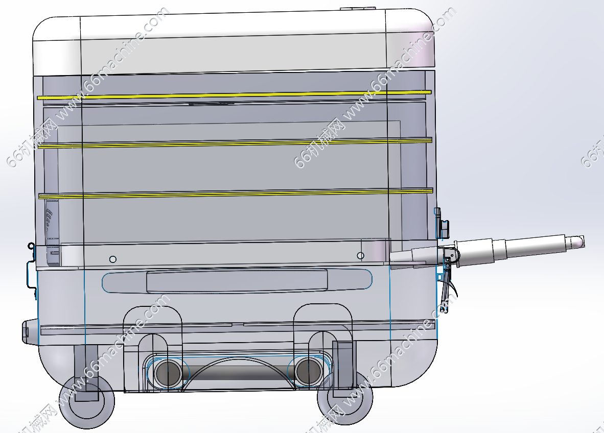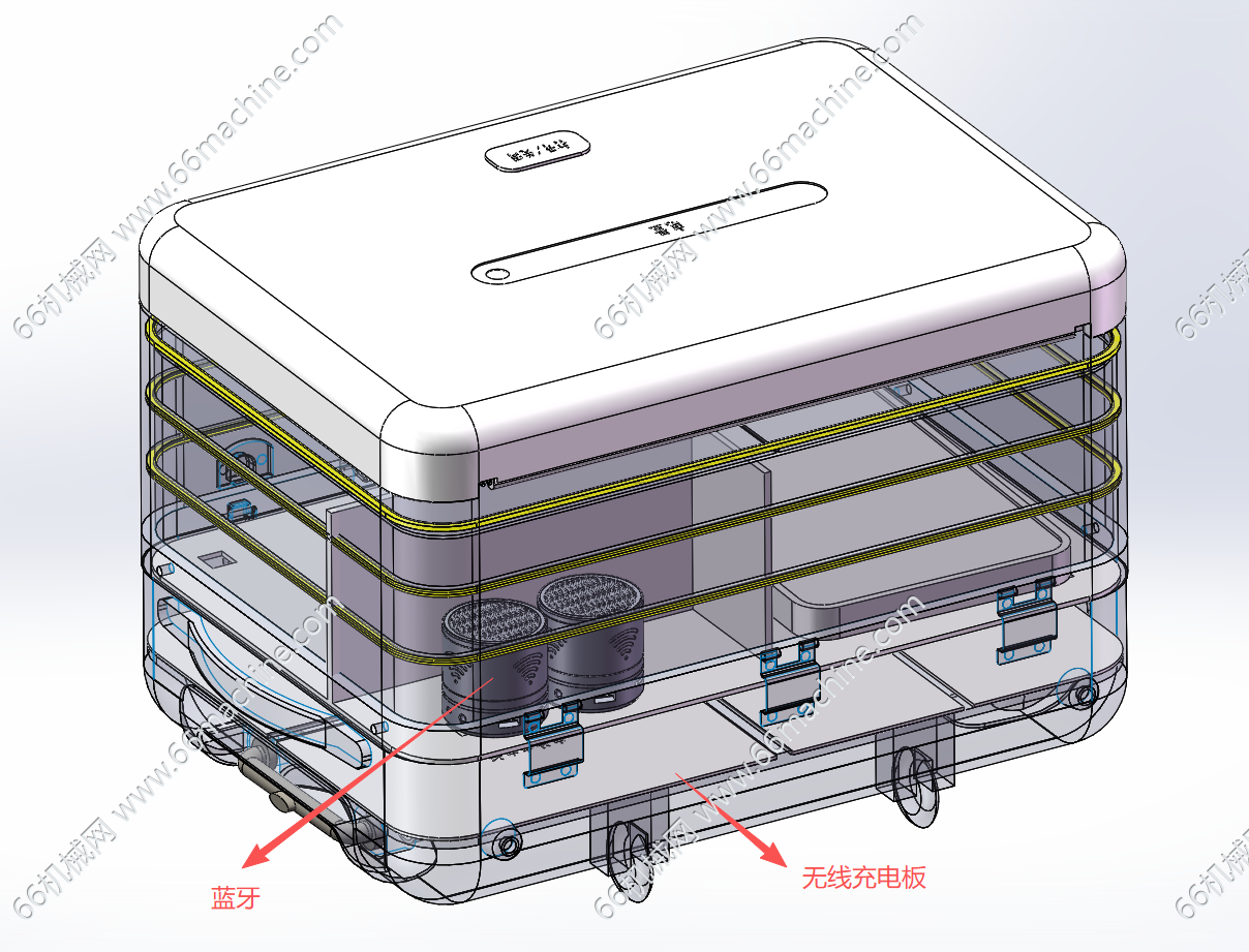 本模型为带充电及LED灯的智能行李箱,在原有行李箱上增加了无线充电,里面带有led灯条。另外,不需要手动打开行李箱,在手机APP上就可实现打开关闭操作。