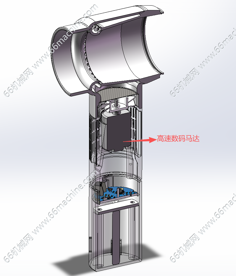 本模型为无扇叶吹风机,也常被称为戴森吹风机,核心原理是伯努利效应,再结合高速数码马达和流体力学设计来实现吹风功能,核心部件是高速数码马达,转速可达每分钟十几万转(远超传统有扇叶吹风机)。它会从吹风机的进风口吸入大量空气,然后将空气加速输送到环形出风口的内部通道。