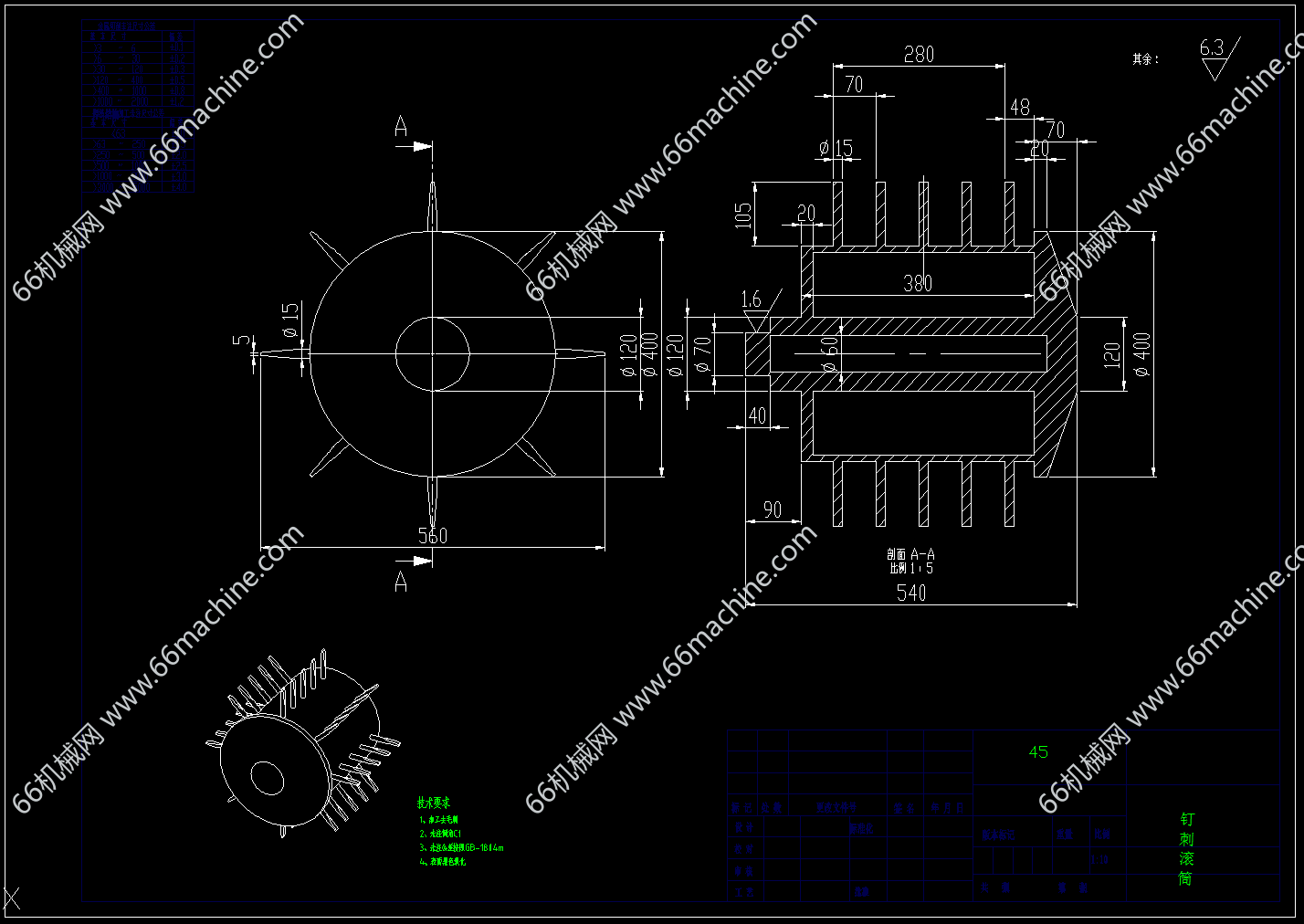 本图纸为厨余垃圾处理机,是由食物垃圾处理器或厨房食物垃圾处理器升级产品,可以广泛的处理熟厨剩菜、剩饭、菜叶包括生厨余垃圾包括果皮、鱼刺、菜梗、蛋壳、茶渣、骨、贝壳,泛指家庭生活饮食中所需用的来源生料及成品(熟食)或残留物等厨余垃圾。厨余垃圾处理器由防腐研磨腔、全不锈钢研磨锤、全不锈钢研磨盘等组成。它利用高速旋转的永磁电机带动研磨腔中的转盘,食物垃圾在离心力的作用下相互撞击在极短的时间内,将食物垃圾研磨成细小的颗粒顺水流排出管道。