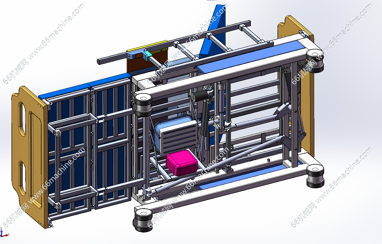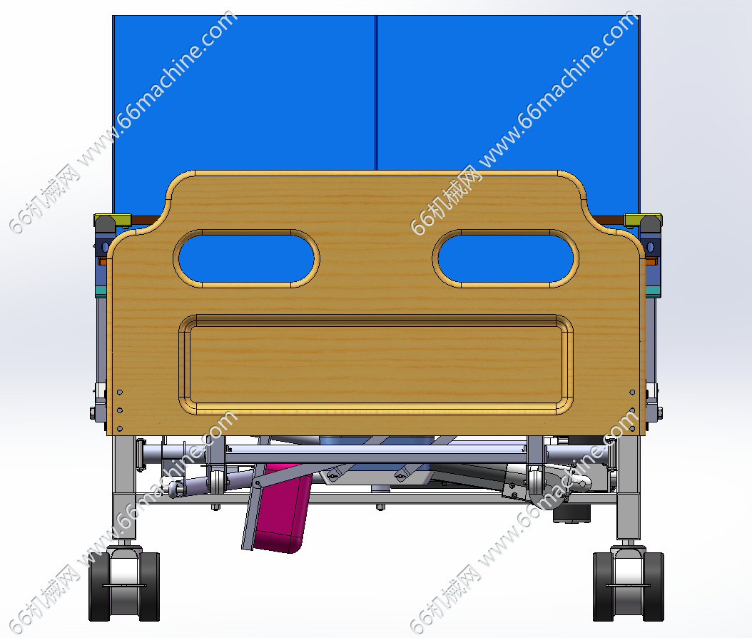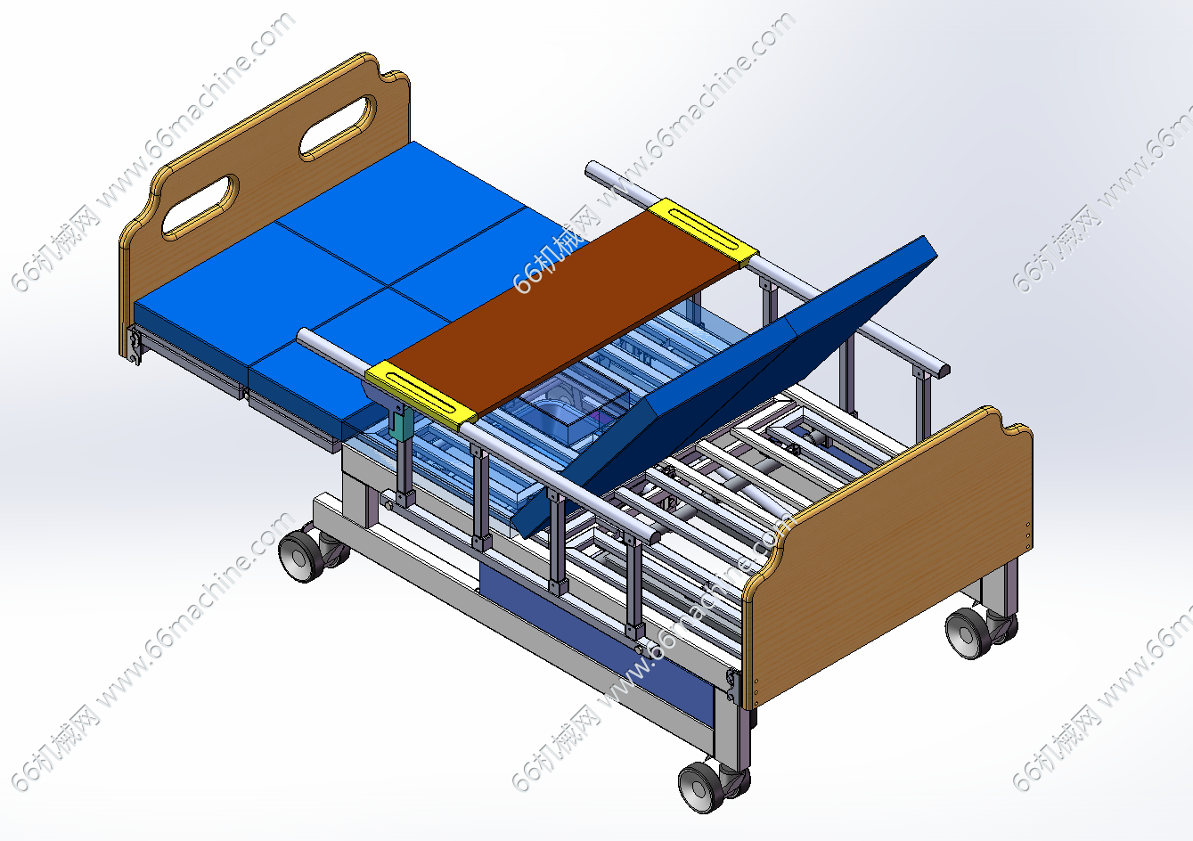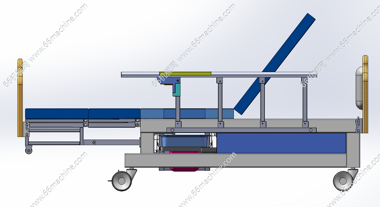 本模型为多功能病床(护理床),包含靠背升降、餐板、便盆等,靠背可以进行多种角度的调节,以便于患者在床上进行各种活动,如就餐、洗头、洗脚、大小便等。