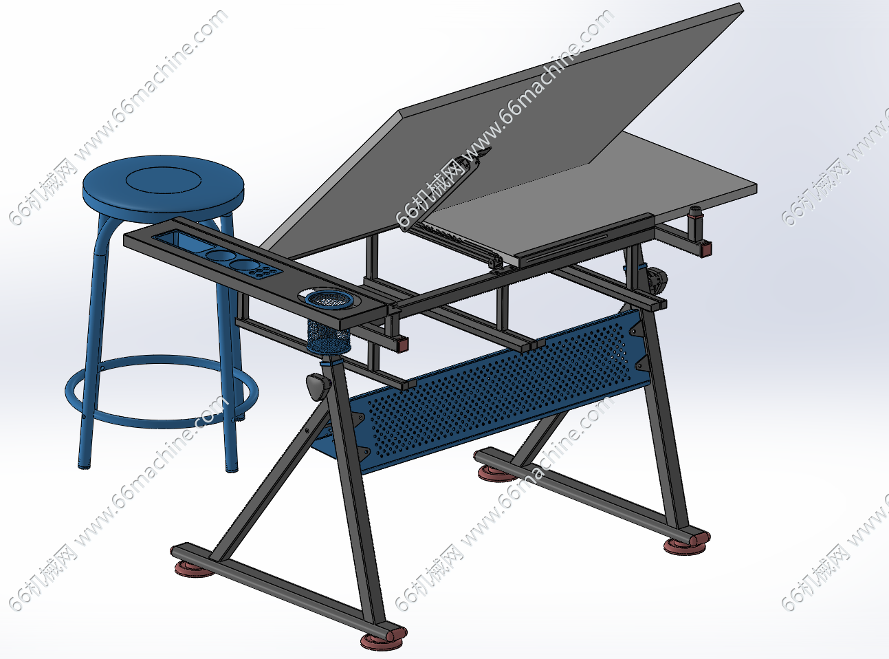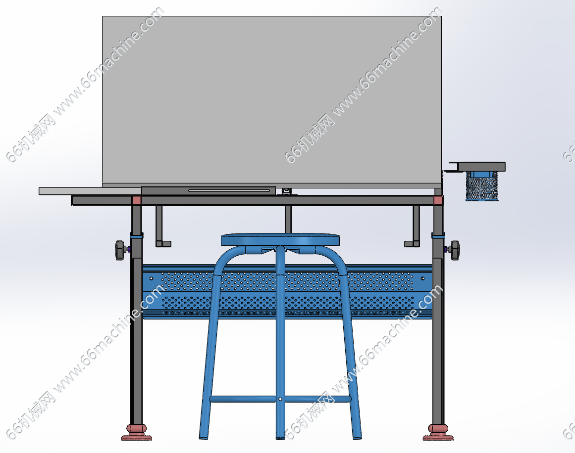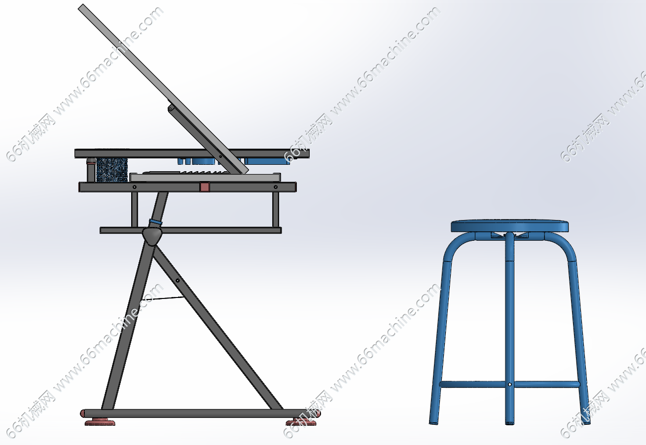 本模型为倾斜角度可调节绘图桌(绘画桌),主体结构采用方管焊接而成,置物盒采用塑料材质。桌板可调节倾斜角度,设有伸缩置物板,主要作为绘画桌,结构简单且实用!