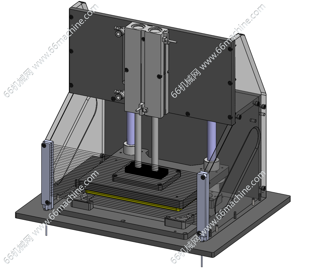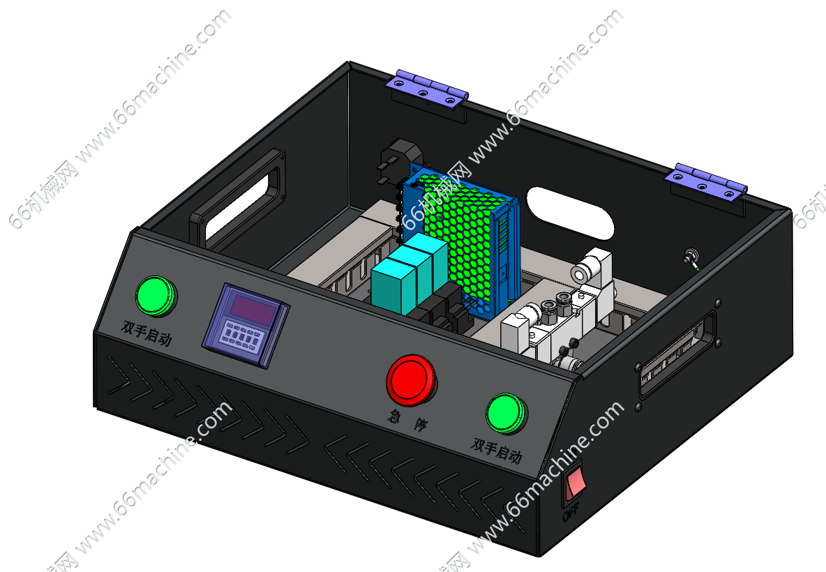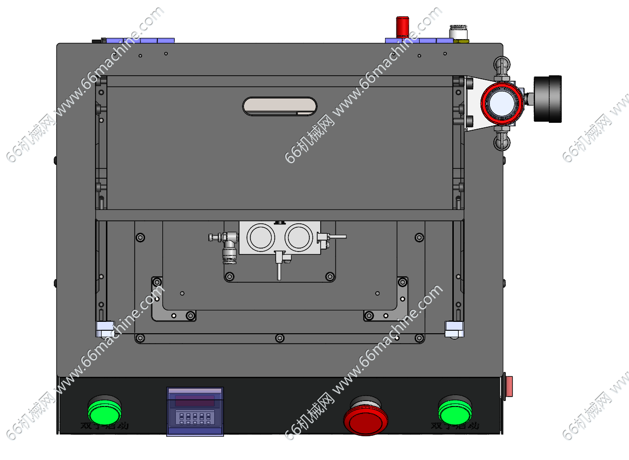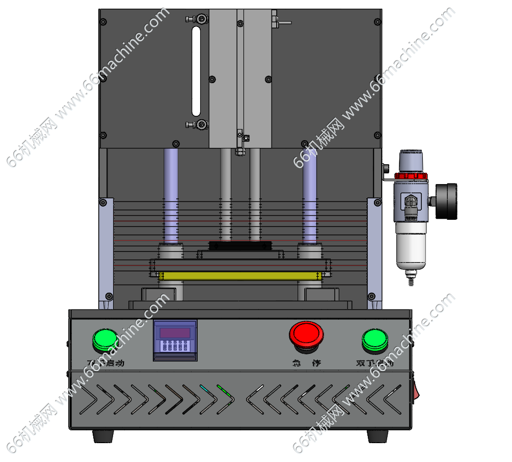 本模型为桌面式气动压合治具(保压治具),采用双导杆气缸驱动下压机构,配备气源调压装置以稳定压合压力,通过数显面板设置压合时间、保压时长等工艺参数;正面设有双手启动按钮、急停按钮与安全光栅,形成三重安全防护,可防止误操作引发安全风险;下方为可定制的产品载台,适配PCB、FPC、LCD等电子组件的压合、保压,广泛应用于电子制造领域。