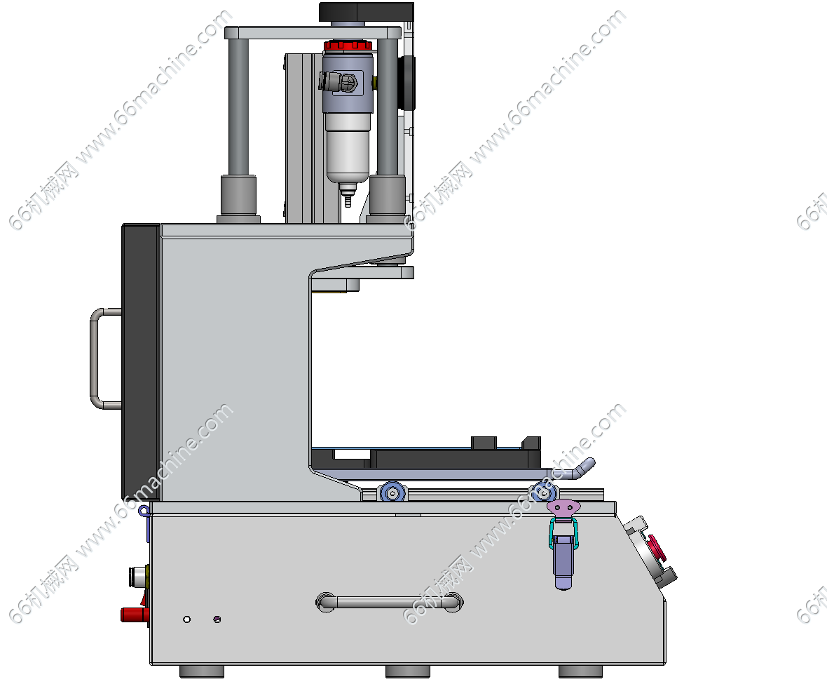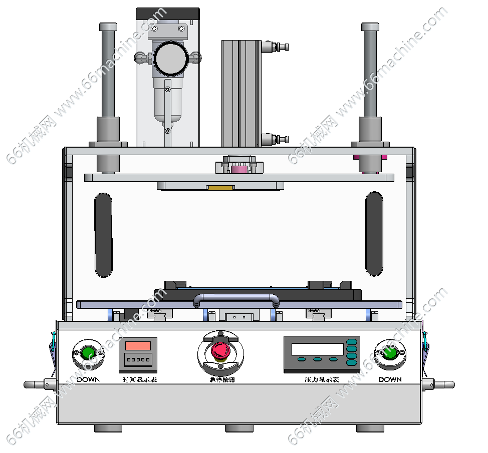 本模型为气动压装机(保压治具),设有压合时间及压力显示,可用于手机/平板屏幕贴合、电池模组组装、塑胶件压合定型,也适用于产品防水性能测试前的保压密封。