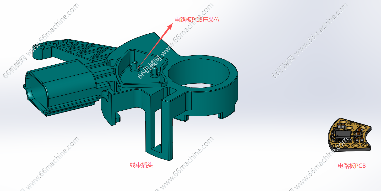 本模型为线束插头电路板PCB压入工装,此工装用于把线束插头上的电路板PCB压入到线束插头外壳的对应位置,要求压装定位精确,压入力度适中,满足提高生产效率的需要。